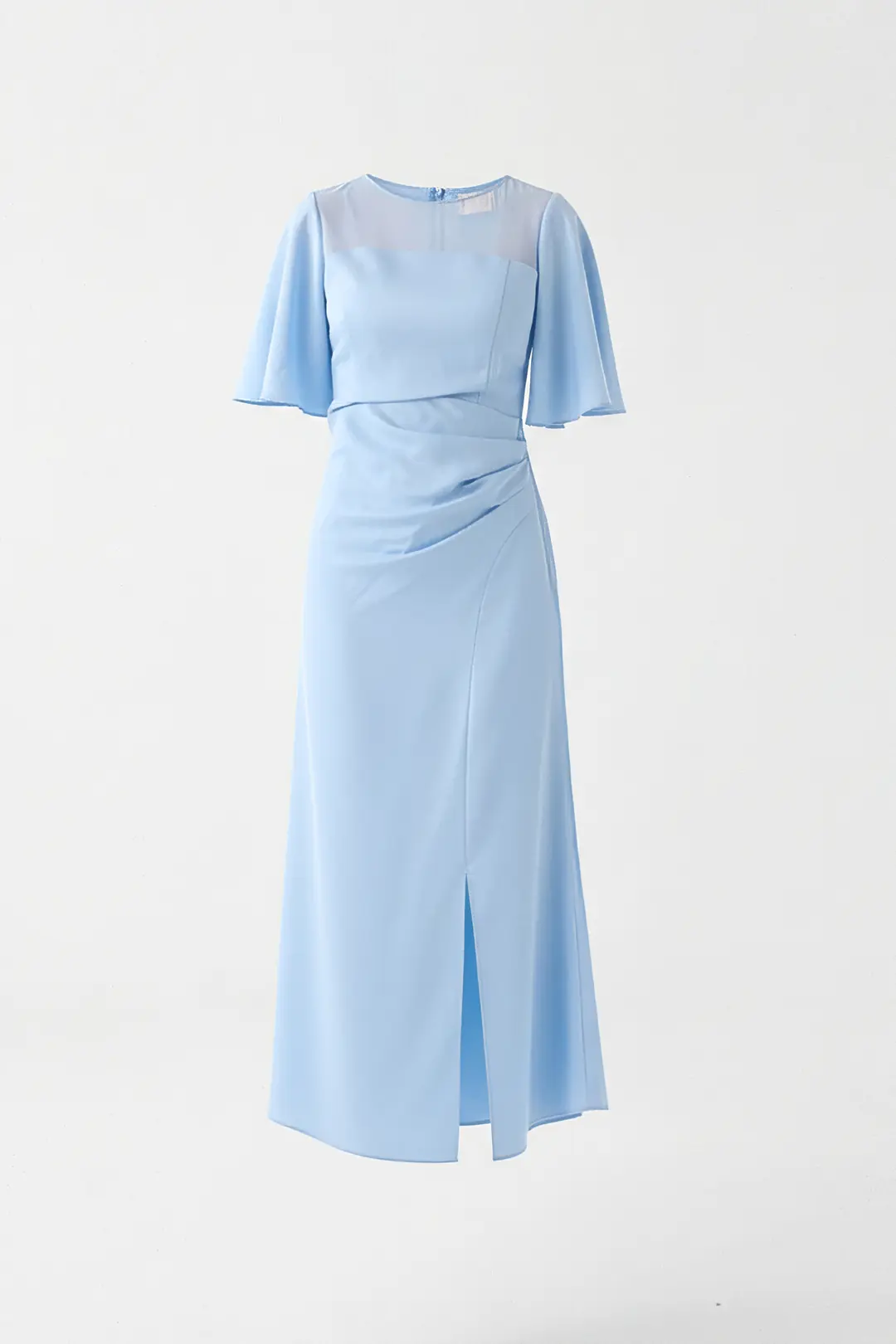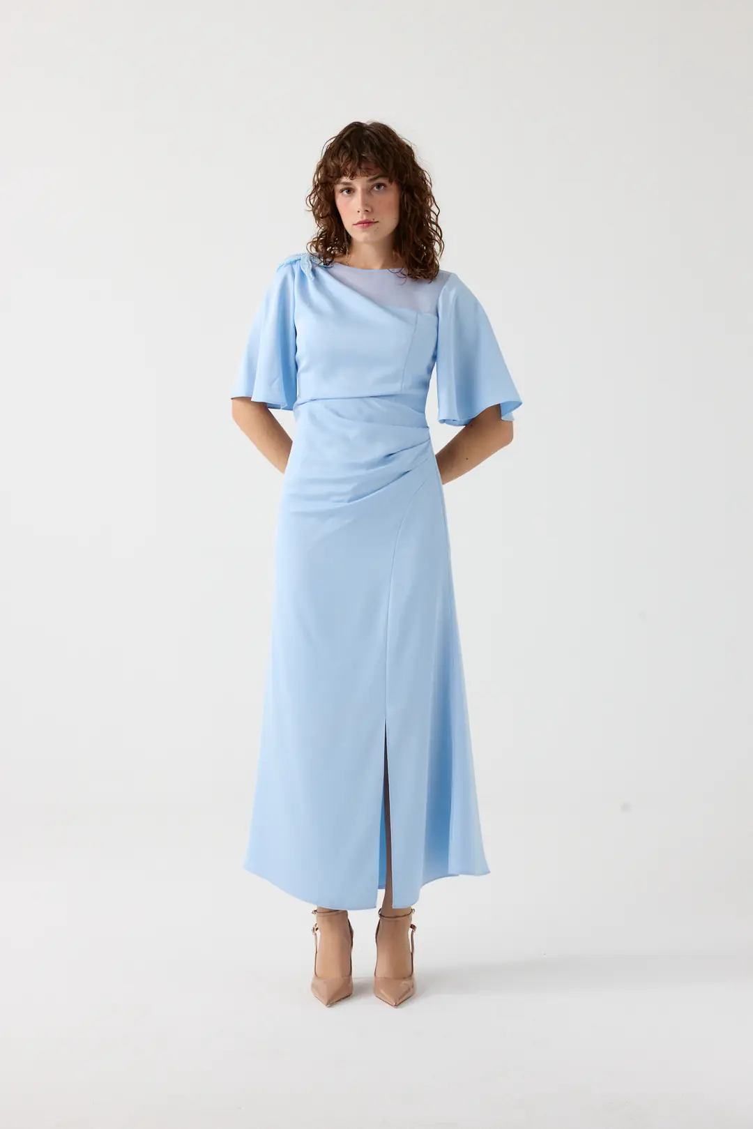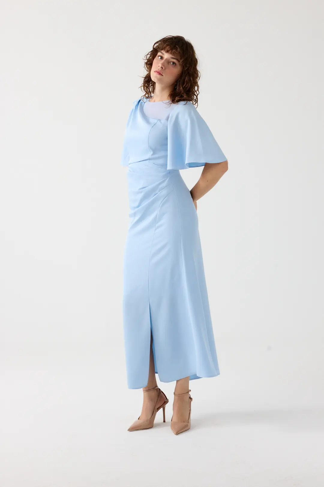 Renkleriyle dikkat çeken uzun elbise, omuz kısmındaki zarif detay ve drapeli tasarımıyla feminen bir şıklık sunuyor. Ön yırtmaç detayıyla modern bir görünüm kazanan bu elbise, düğün, davet ve özel günlerde sofistike bir stil için ideal tercihtir.