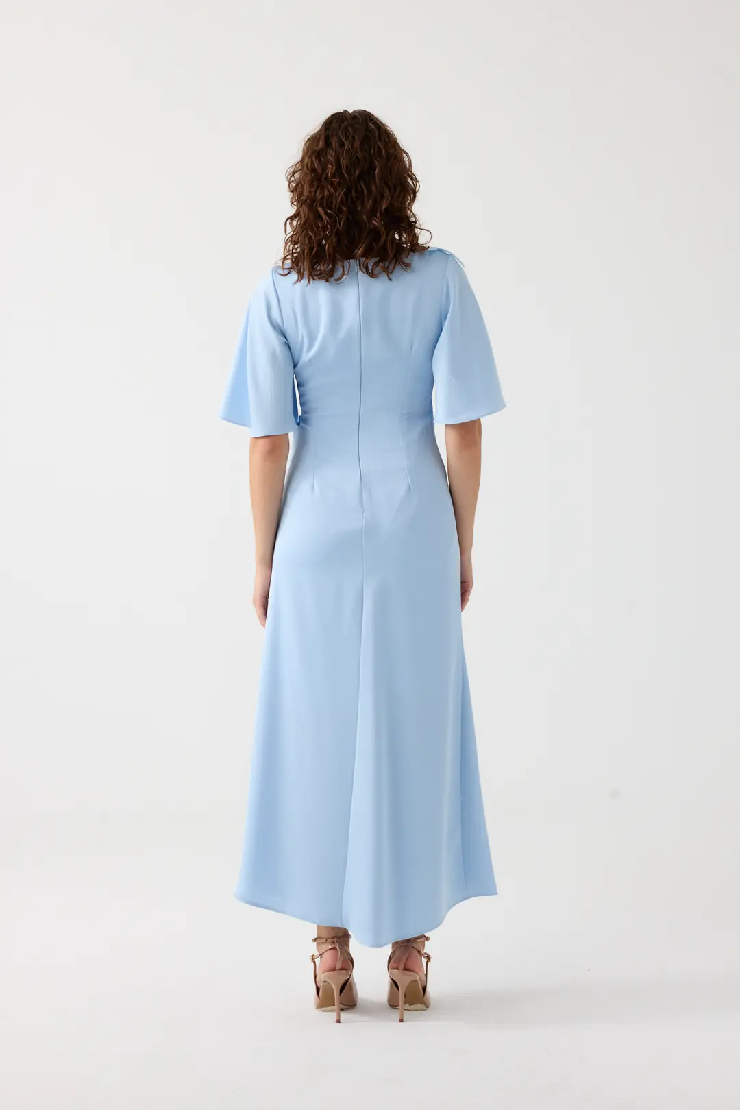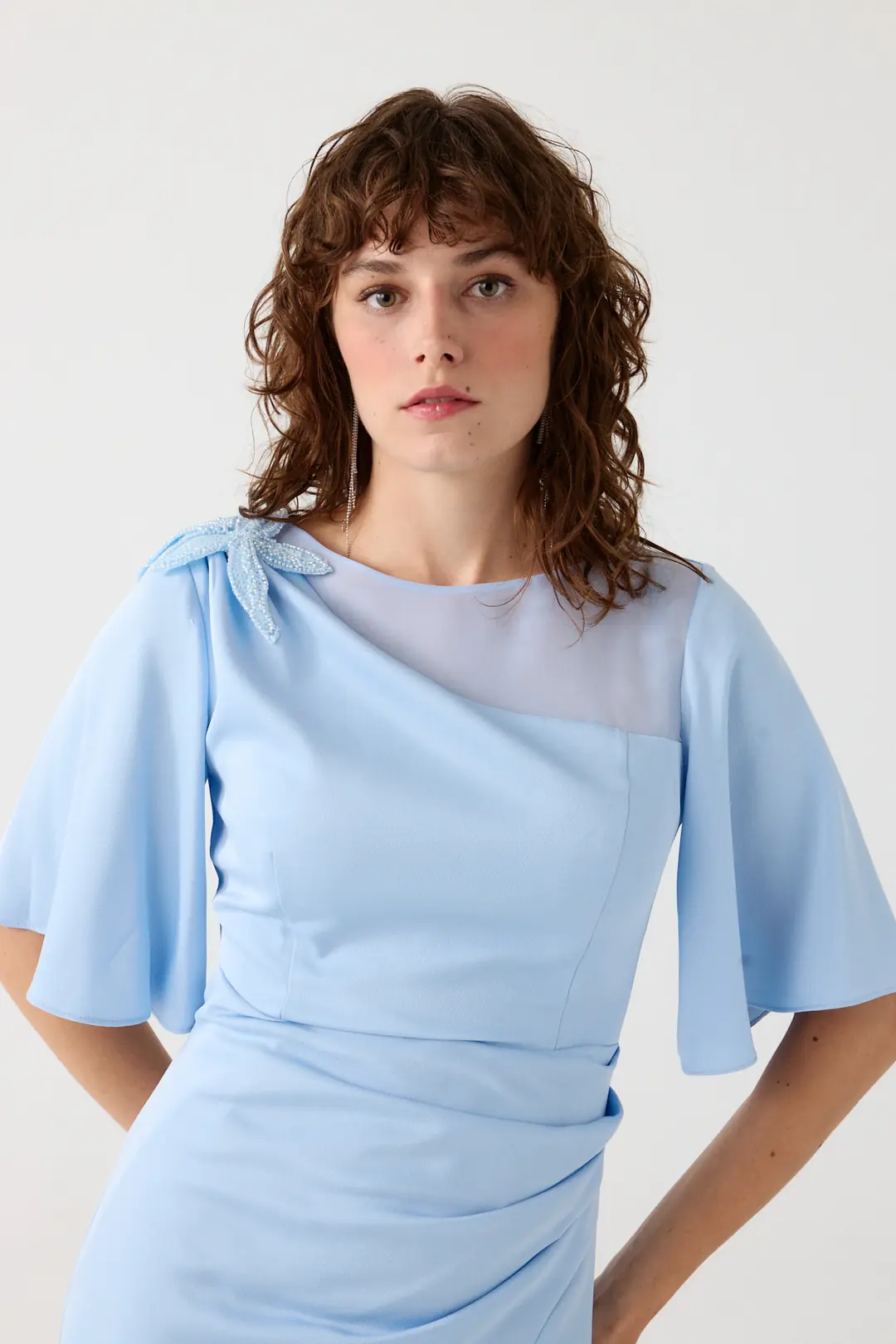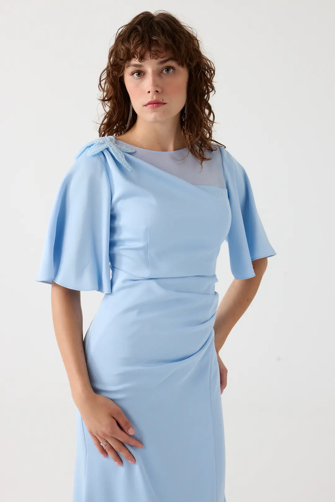 Renkleriyle dikkat çeken uzun elbise, omuz kısmındaki zarif detay ve drapeli tasarımıyla feminen bir şıklık sunuyor. Ön yırtmaç detayıyla modern bir görünüm kazanan bu elbise, düğün, davet ve özel günlerde sofistike bir stil için ideal tercihtir.