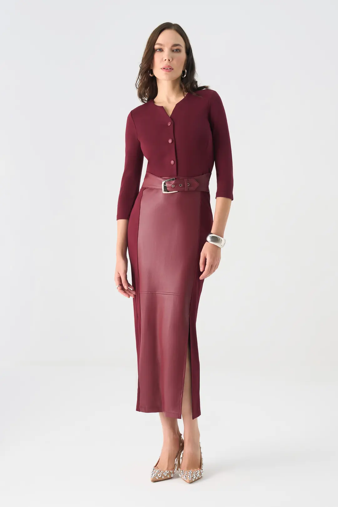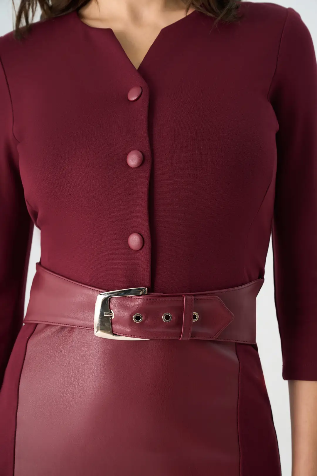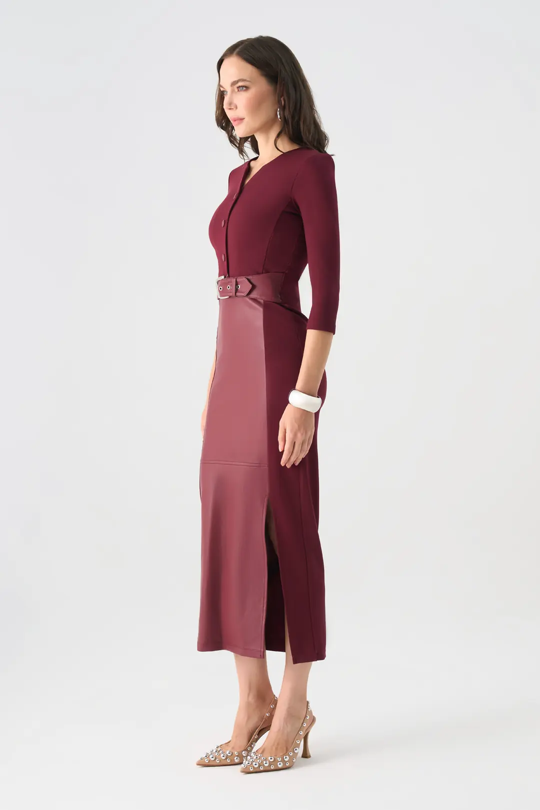 Modern çizgileriyle öne çıkan bu midi elbise, zarif ve güçlü bir duruş sunar. V yaka tasarımı, ön kısmındaki düğme detayları ve beli vurgulayan kemeriyle kadınsı bir siluet oluşturur. Farklı dokulardaki kumaş geçişleriyle özgün bir görünüm kazanan model, kalem formundaki eteği ve yırtmaç detayıyla sofistike bir şıklık sunar. Ofis şıklığından özel davetlere kadar pek çok ortamda rahatlıkla tercih edilebilir.