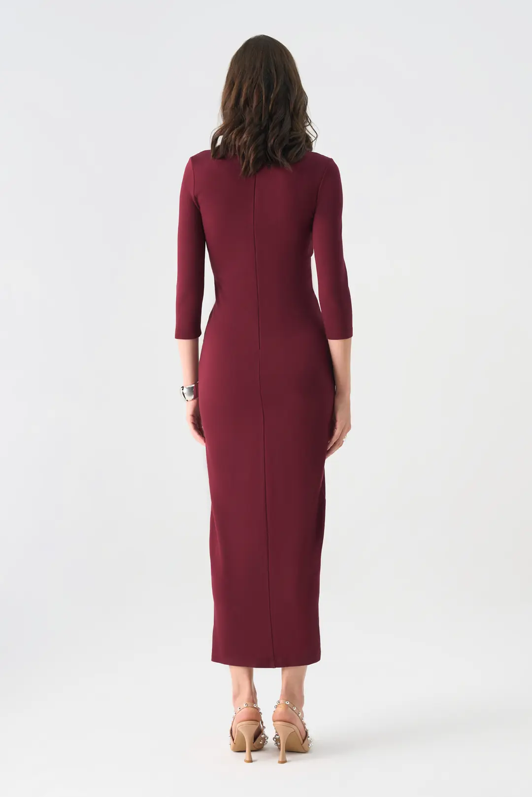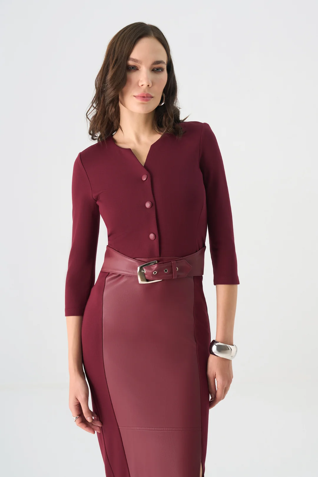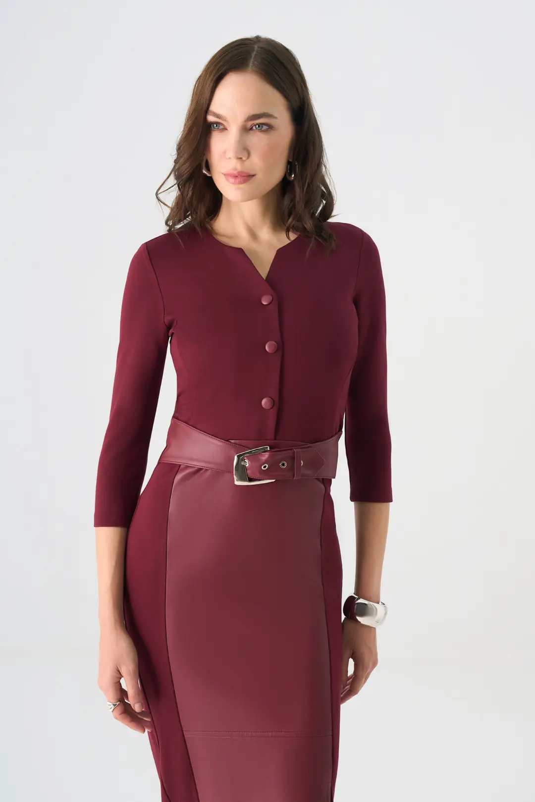 Modern çizgileriyle öne çıkan bu midi elbise, zarif ve güçlü bir duruş sunar. V yaka tasarımı, ön kısmındaki düğme detayları ve beli vurgulayan kemeriyle kadınsı bir siluet oluşturur. Farklı dokulardaki kumaş geçişleriyle özgün bir görünüm kazanan model, kalem formundaki eteği ve yırtmaç detayıyla sofistike bir şıklık sunar. Ofis şıklığından özel davetlere kadar pek çok ortamda rahatlıkla tercih edilebilir.