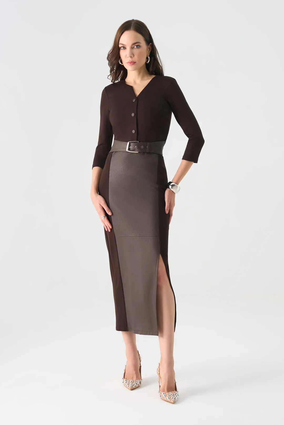 Modern çizgileriyle öne çıkan bu midi elbise, zarif ve güçlü bir duruş sunar. V yaka tasarımı, ön kısmındaki düğme detayları ve beli vurgulayan kemeriyle kadınsı bir siluet oluşturur. Farklı dokulardaki kumaş geçişleriyle özgün bir görünüm kazanan model, kalem formundaki eteği ve yırtmaç detayıyla sofistike bir şıklık sunar. Ofis şıklığından özel davetlere kadar pek çok ortamda rahatlıkla tercih edilebilir.