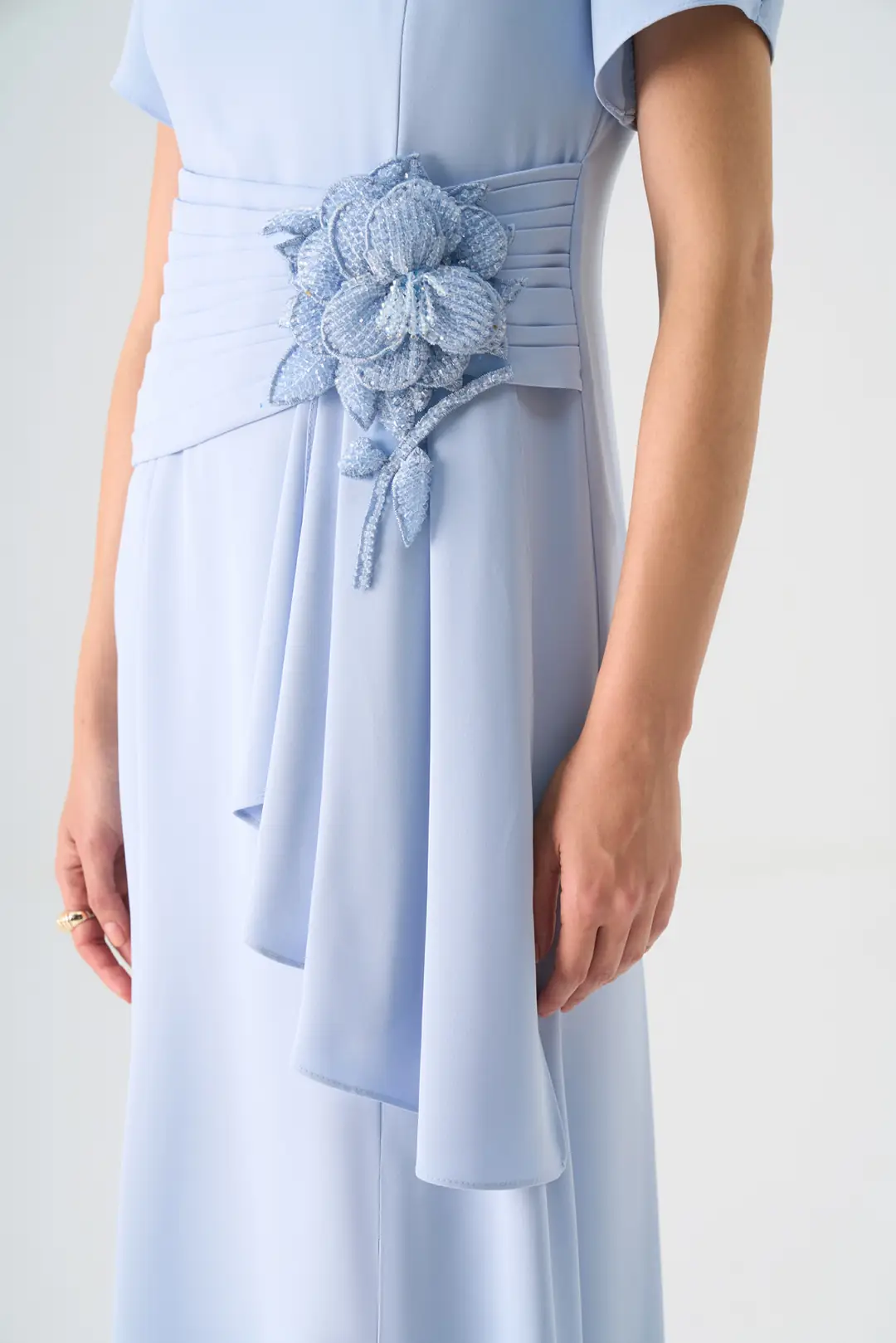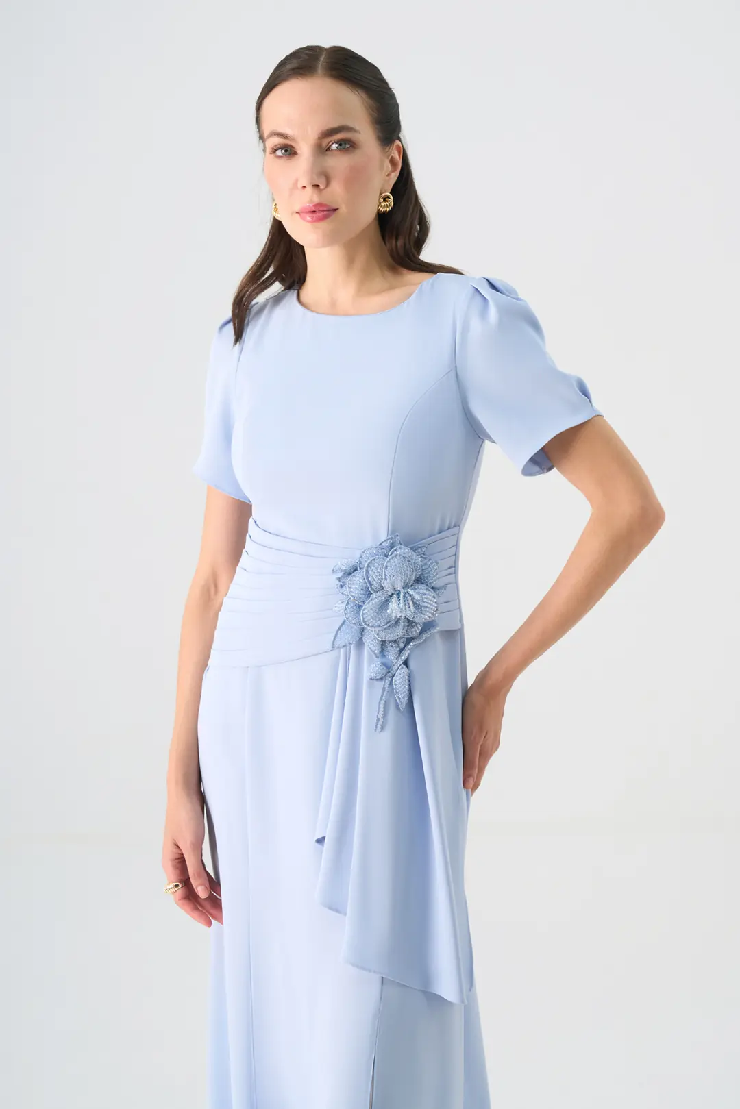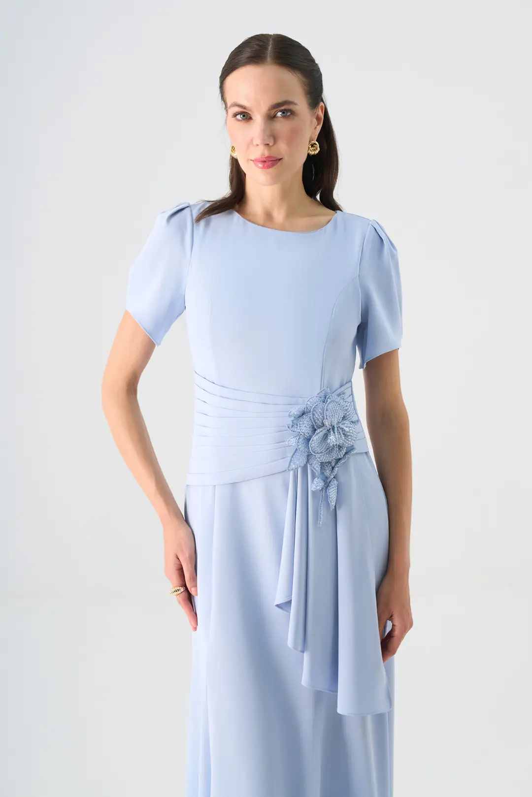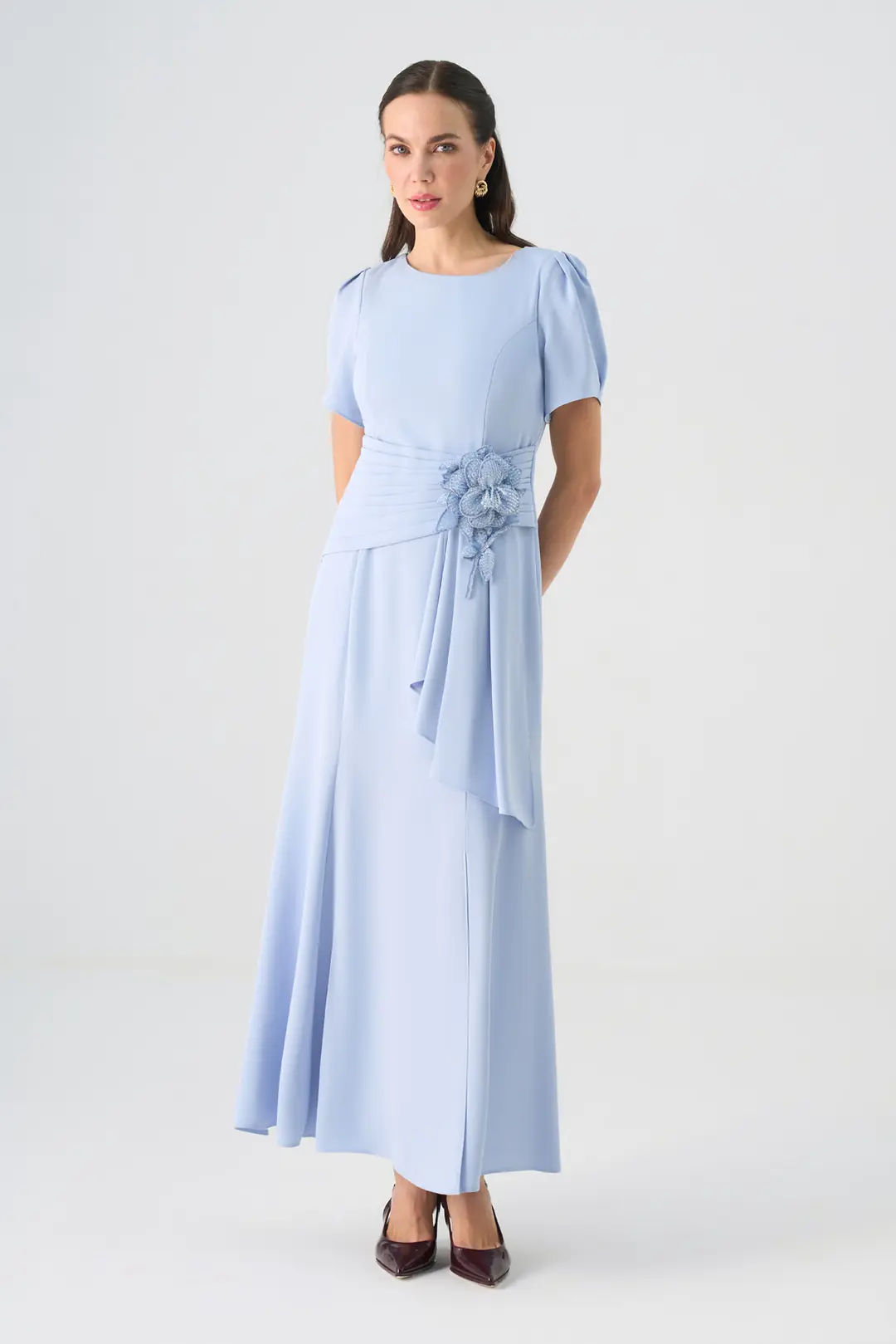 Zarif detaylarıyla dikkat çeken bu uzun abiye elbise, sade çizgileriyle klasik şıklığı modern bir zarafetle buluşturur. Kısa kol formu ve yuvarlak yaka kesimi, tasarıma zarif bir sadelik kazandırırken; bel kısmındaki el işçiliğiyle hazırlanmış çiçek aksesuar süslemesi elbiseye sofistike bir dokunuş katar.
