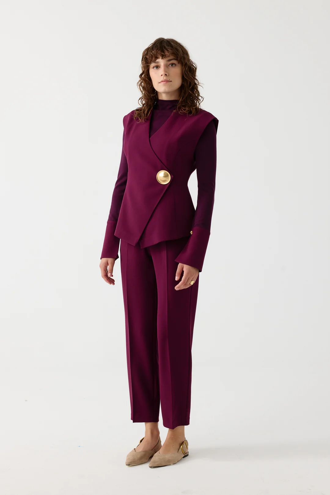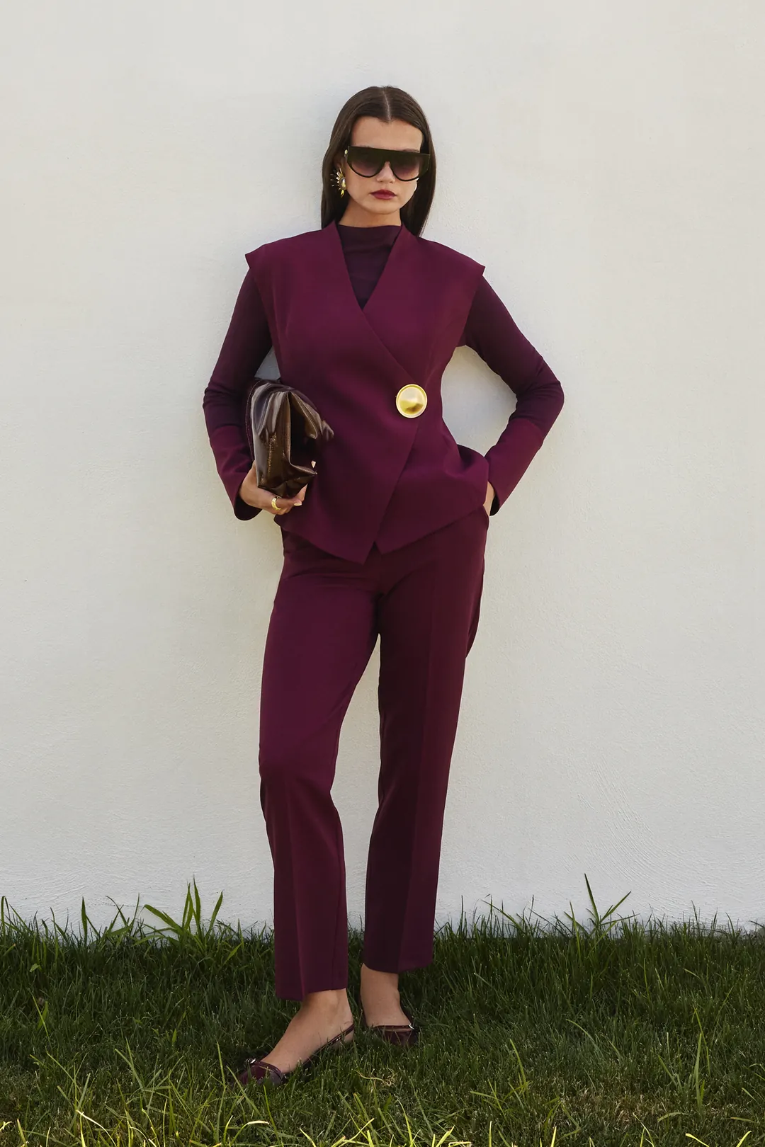 Zamansız şıklığı modern detaylarla buluşturan mürdüm pantolon takım, büyük düğme detaylı yelek ve klasik kesim pantolondan oluşuyor. Hem ofis şıklığında hem de özel davetlerde sofistike bir tarz yakalamanızı sağlar.