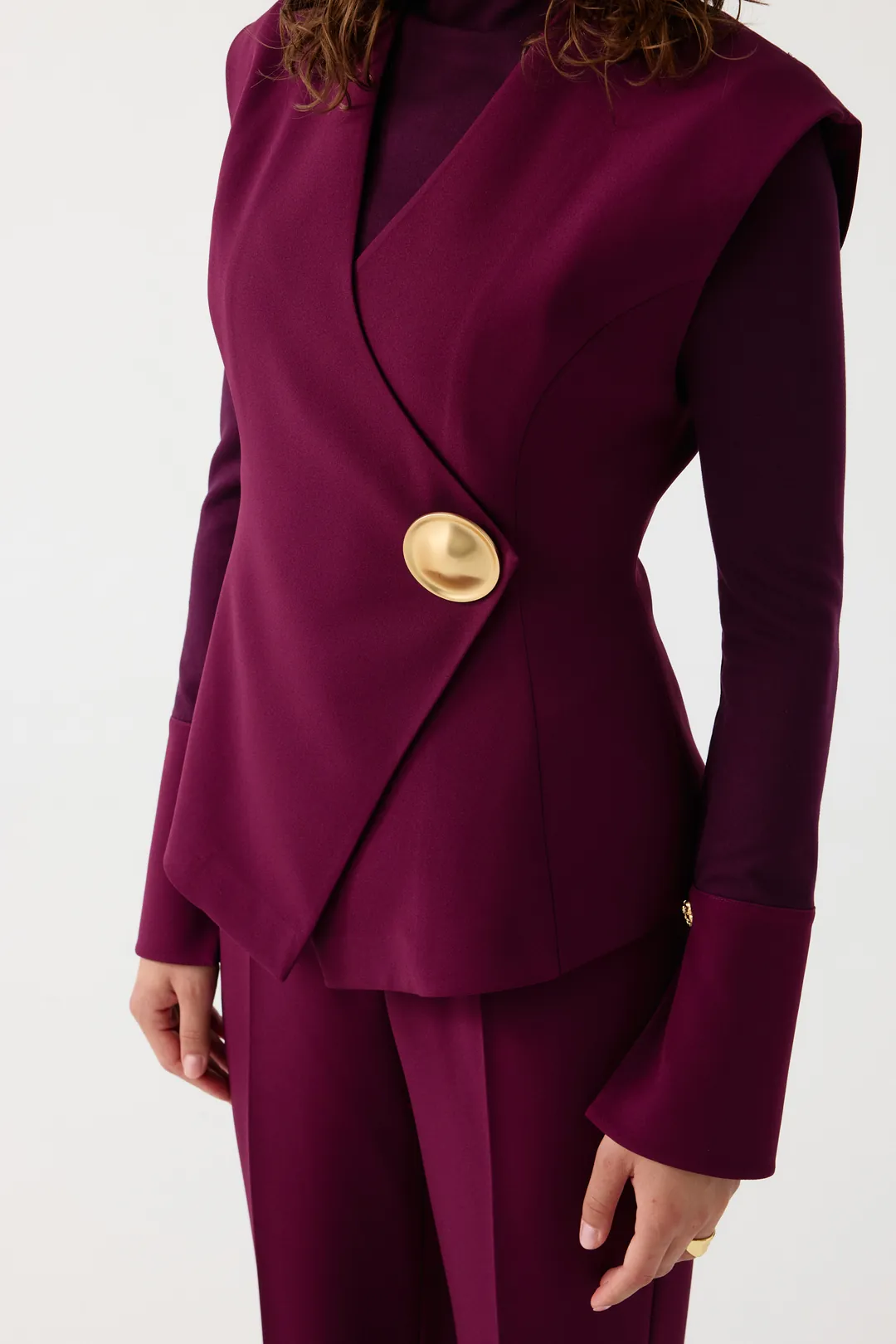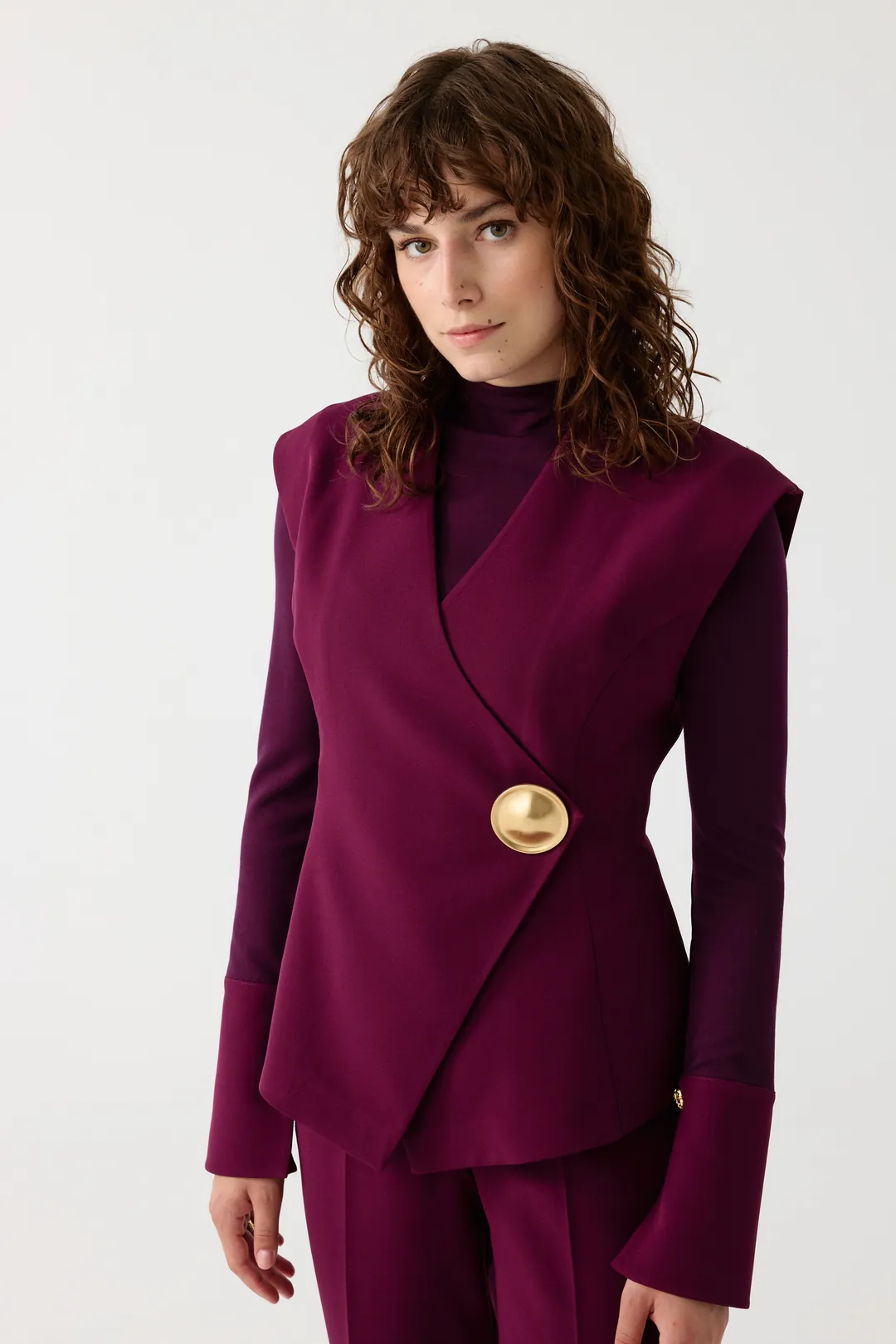 • Yelek: Kolsuz, asimetrik kesim, büyük düğme detaylı