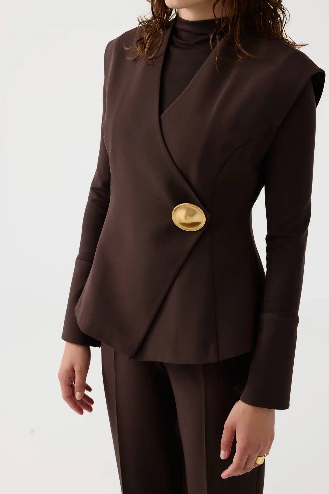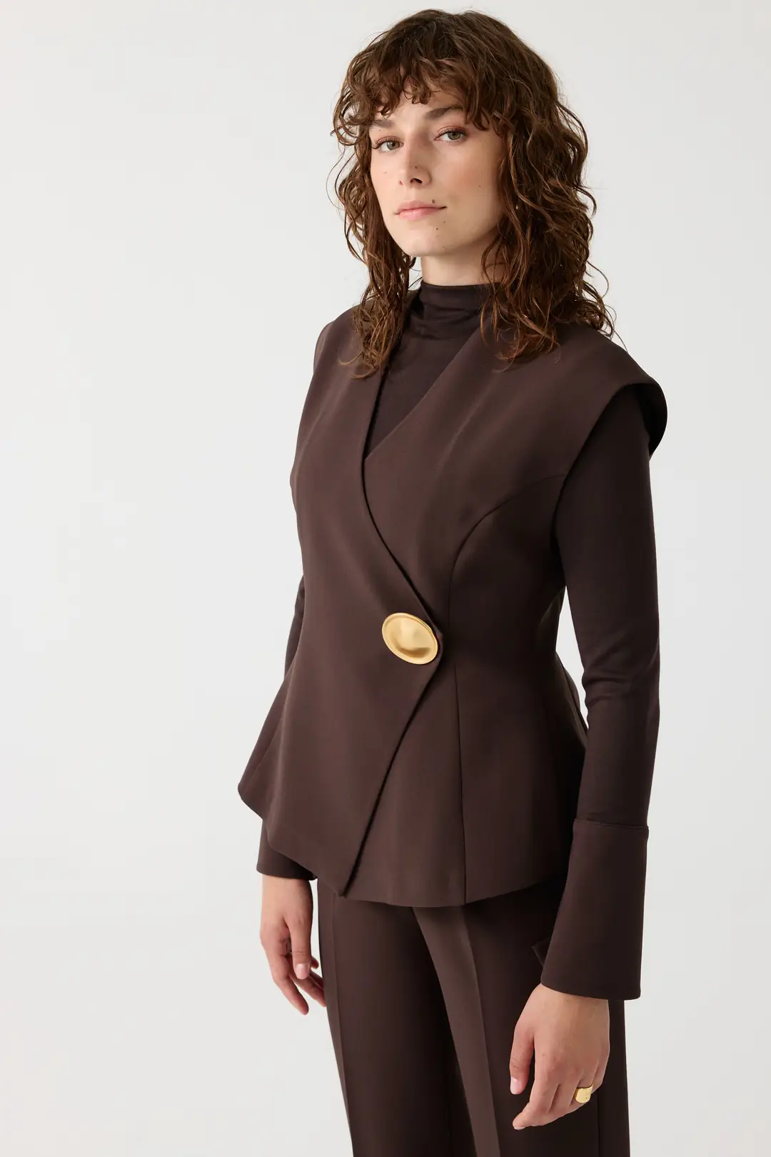 Yelek: Kolsuz, asimetrik kesim, büyük düğme detaylı