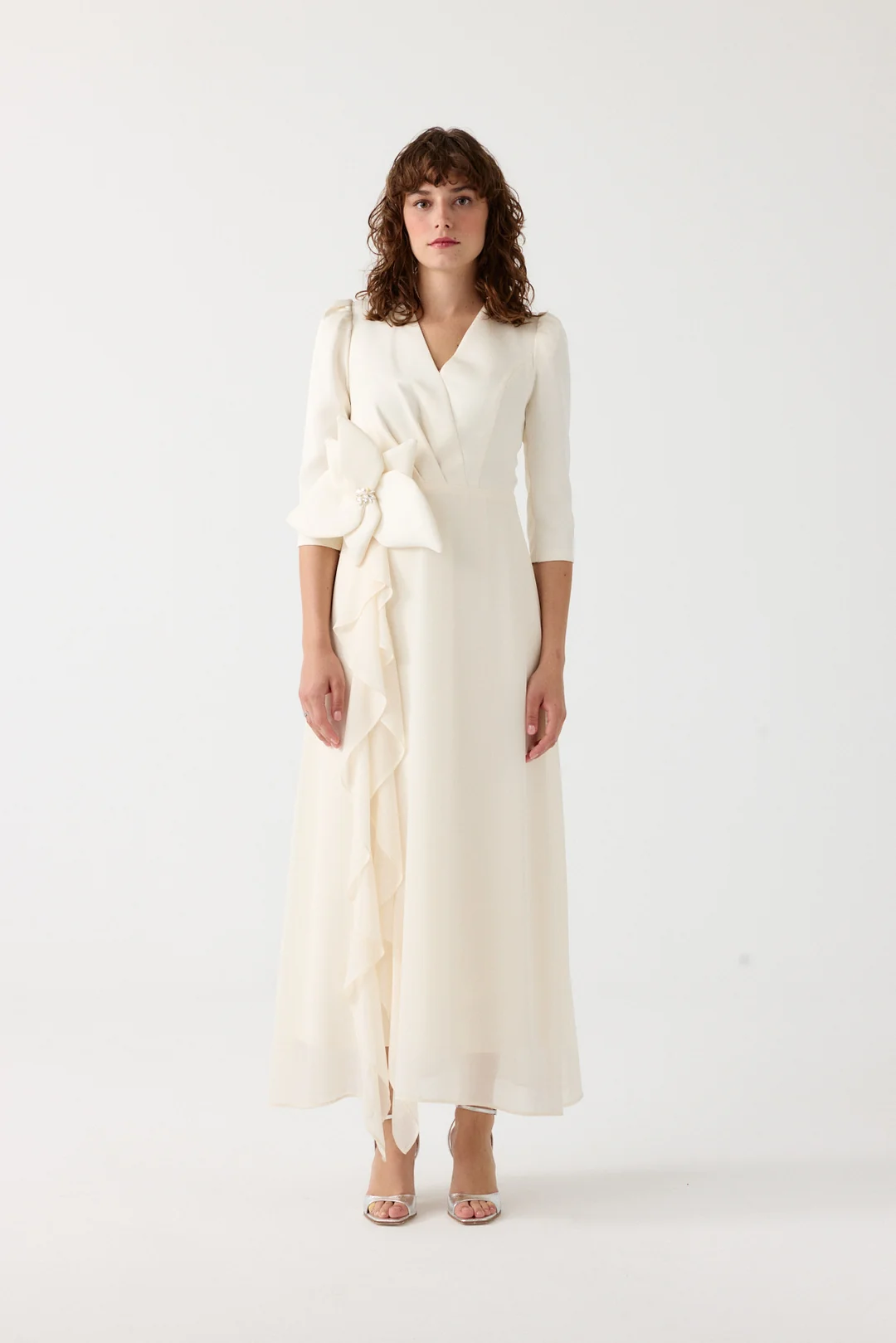 Feminen ve zarif tasarımıyla dikkat çeken açık mavi şifon elbise, bel kısmındaki büyük çiçek detayı ve kat kat volanlı eteğiyle romantik bir görünüm sunuyor. Hafif ve akıcı kumaşı sayesinde özel davetlerde, düğünlerde ve nişan organizasyonlarında şıklığı ön plana çıkarır.