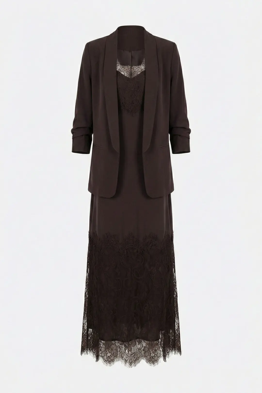 Zarif ve sofistike tasarımıyla öne çıkan dantel detaylı uzun elbise ve şal yaka blazer ceket ikili takım, özel davet ve şık organizasyonlar için tasarlandı. Akıcı formdaki uzun elbise, etek ucu ve yaka bölümündeki zarif dantel işlemeleriyle feminen bir dokunuş sunar. İnce askılı elbise tasarımı, ceketle birlikte kullanıldığında dengeli ve elegan bir siluet oluşturur.