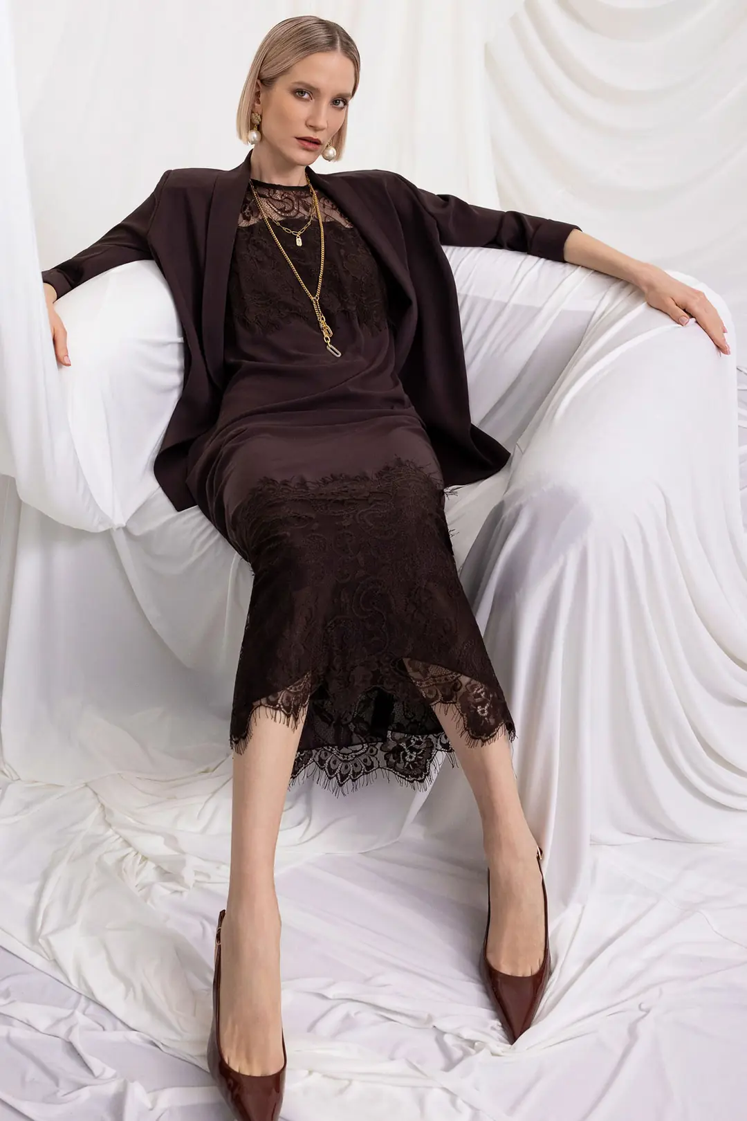 Şal yaka formuna sahip blazer ceket, modern ve zamansız bir duruş kazandırırken hafif yapısı sayesinde gün boyu konfor sağlar. Diz altı uzunlukta tasarlanan elbise, dantel detaylarıyla hareket kazanır ve özel gün stilini güçlü bir şekilde tamamlar.