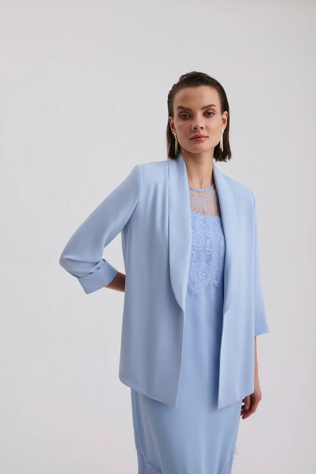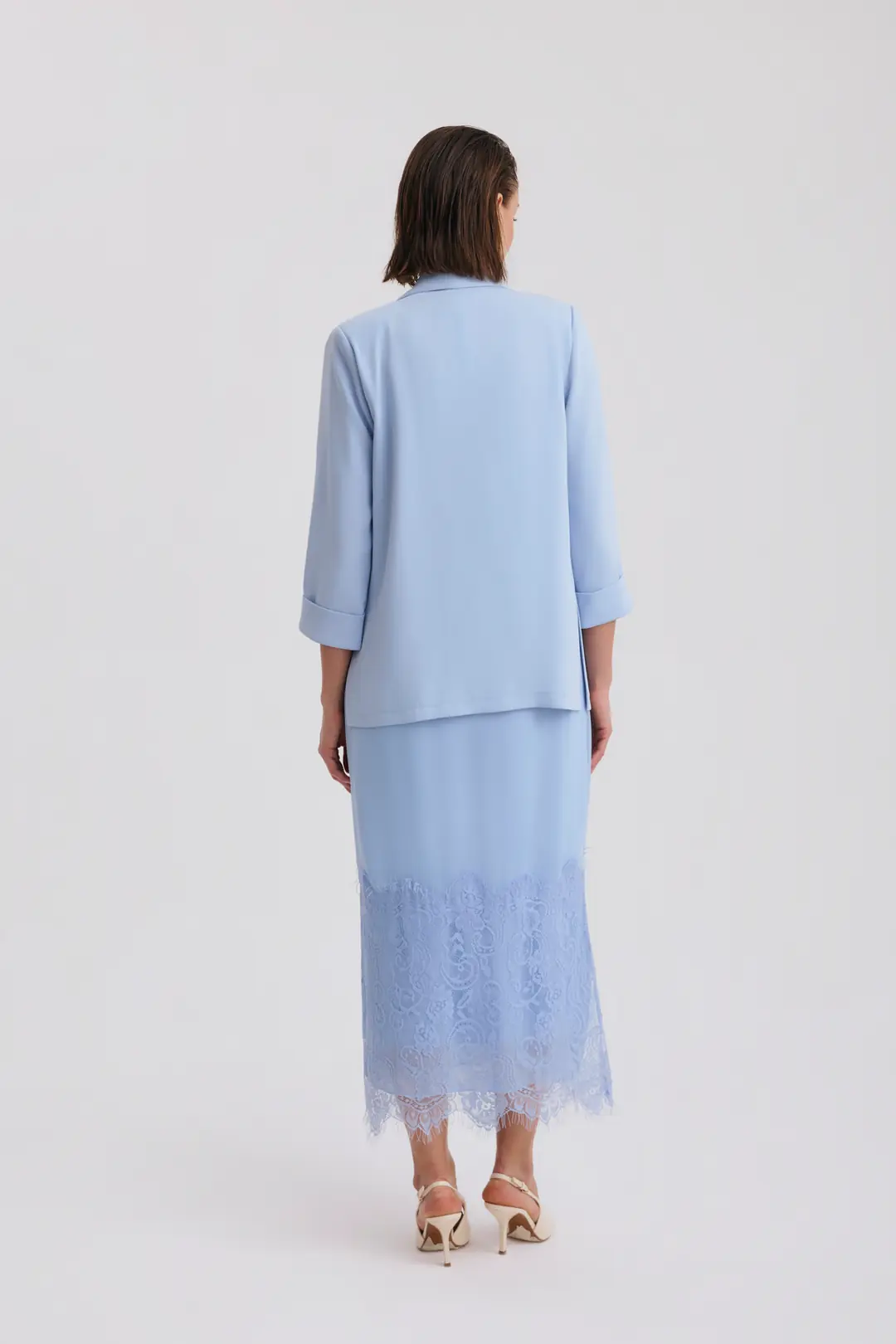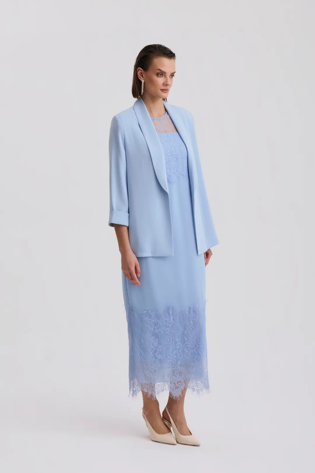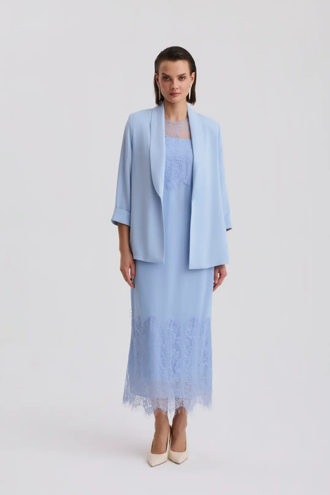 Şal yaka formuna sahip blazer ceket, modern ve zamansız bir duruş kazandırırken hafif yapısı sayesinde gün boyu konfor sağlar. Diz altı uzunlukta tasarlanan elbise, dantel detaylarıyla hareket kazanır ve özel gün stilini güçlü bir şekilde tamamlar.