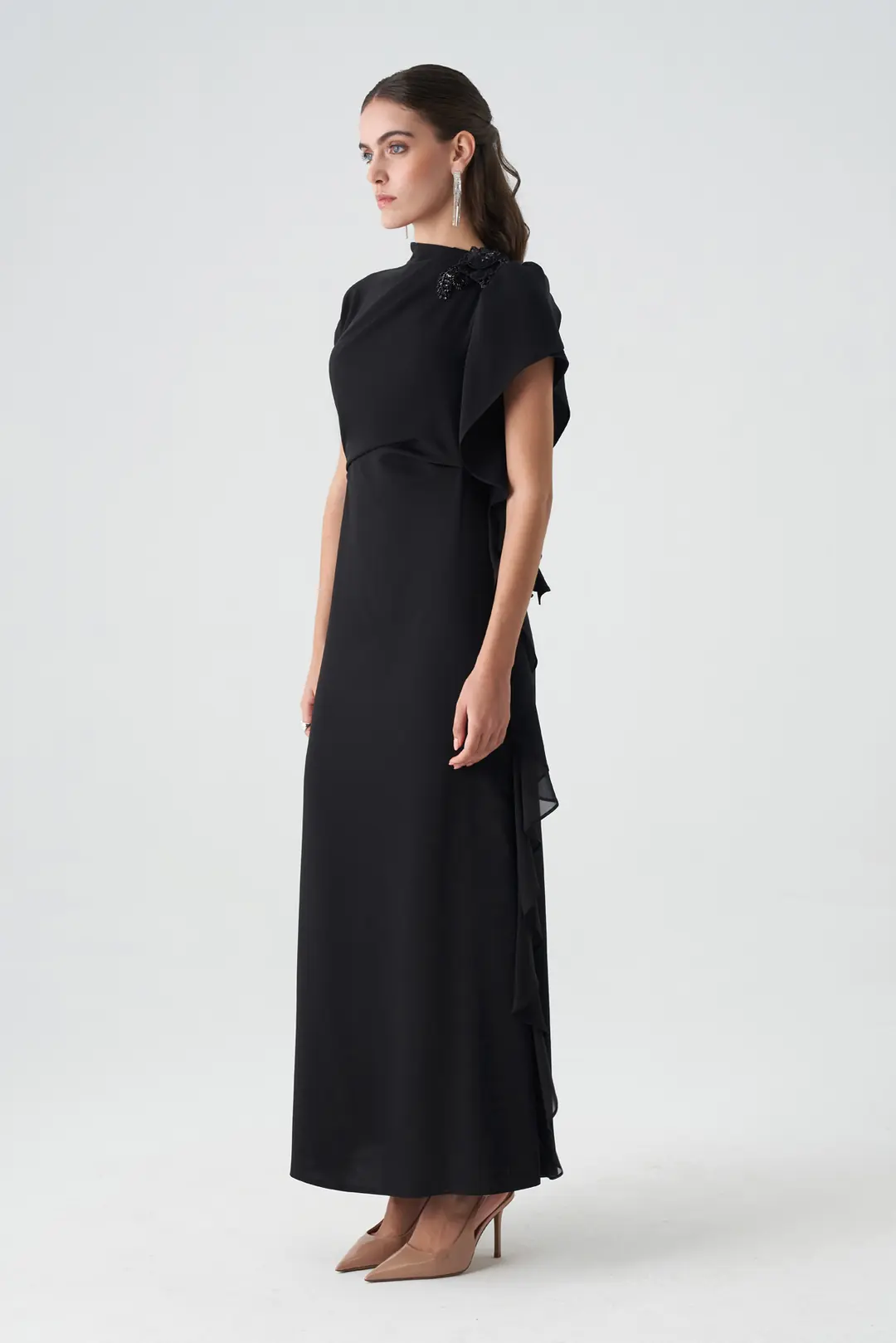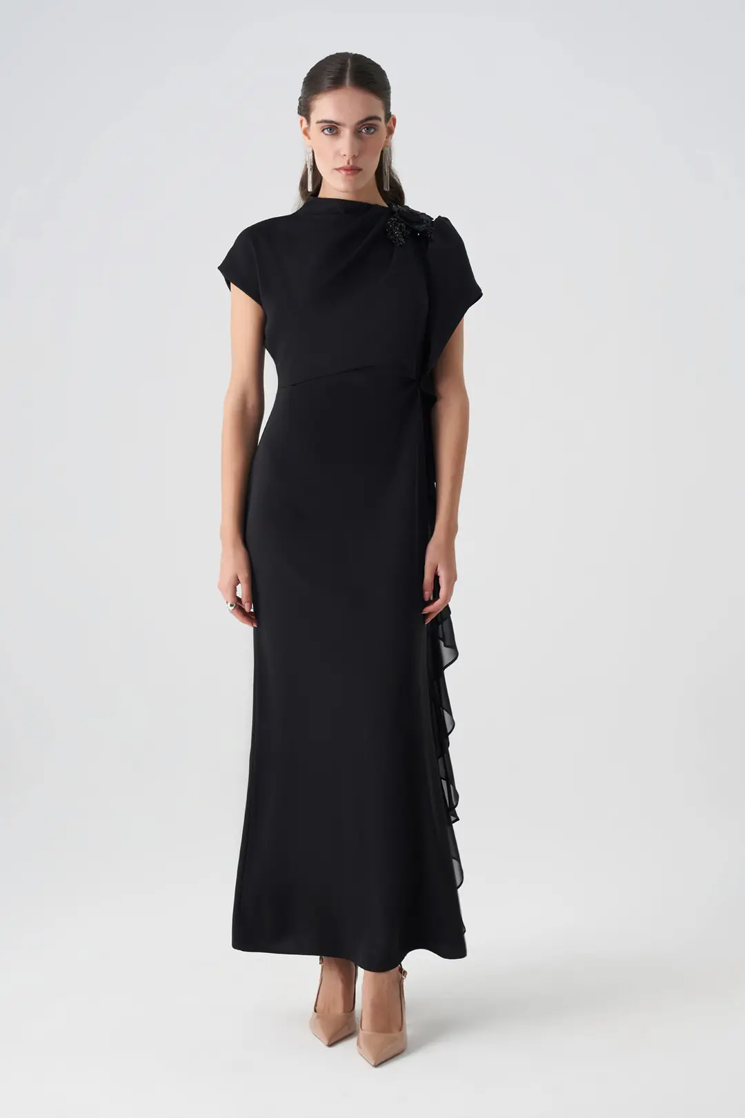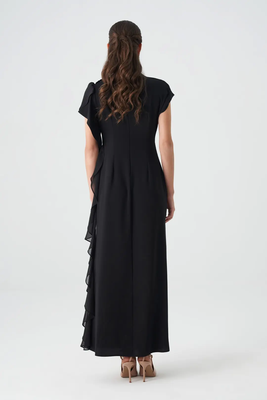 Model: Tek omuz, volan detaylı uzun abiye elbise