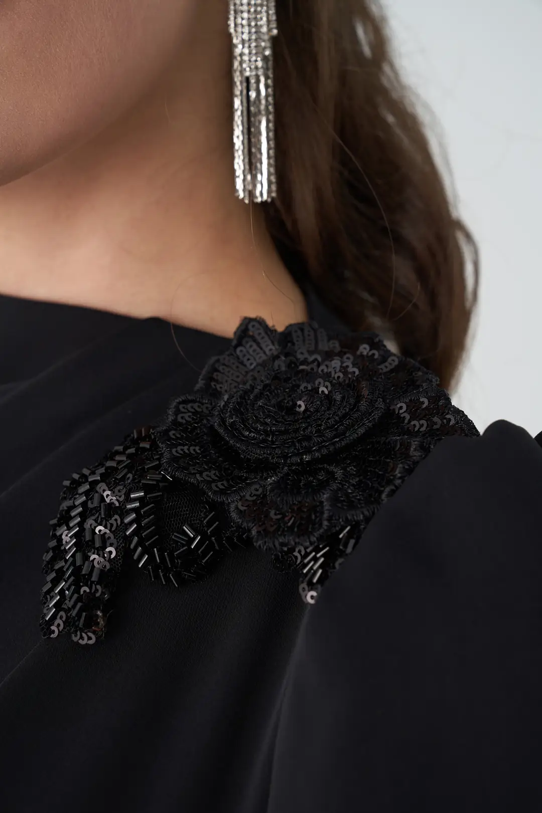Detay: Omuzda çiçek aksesuarı ve arkada zarif volanlar