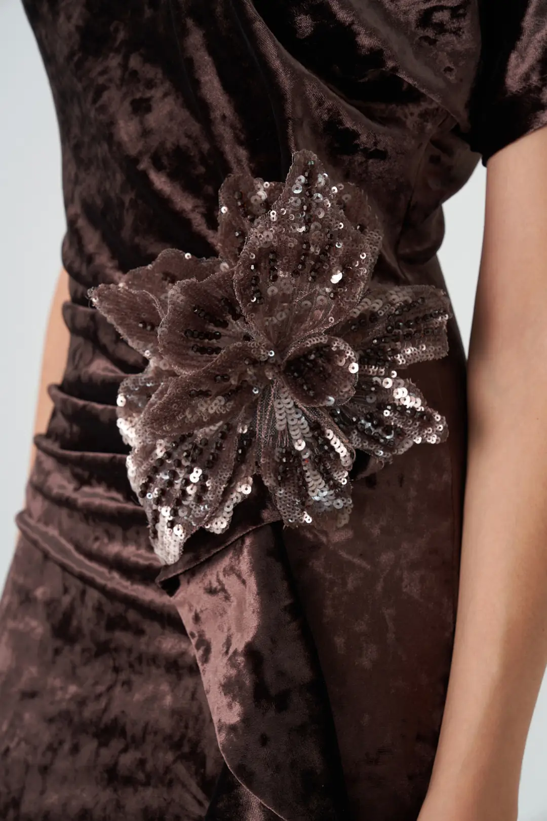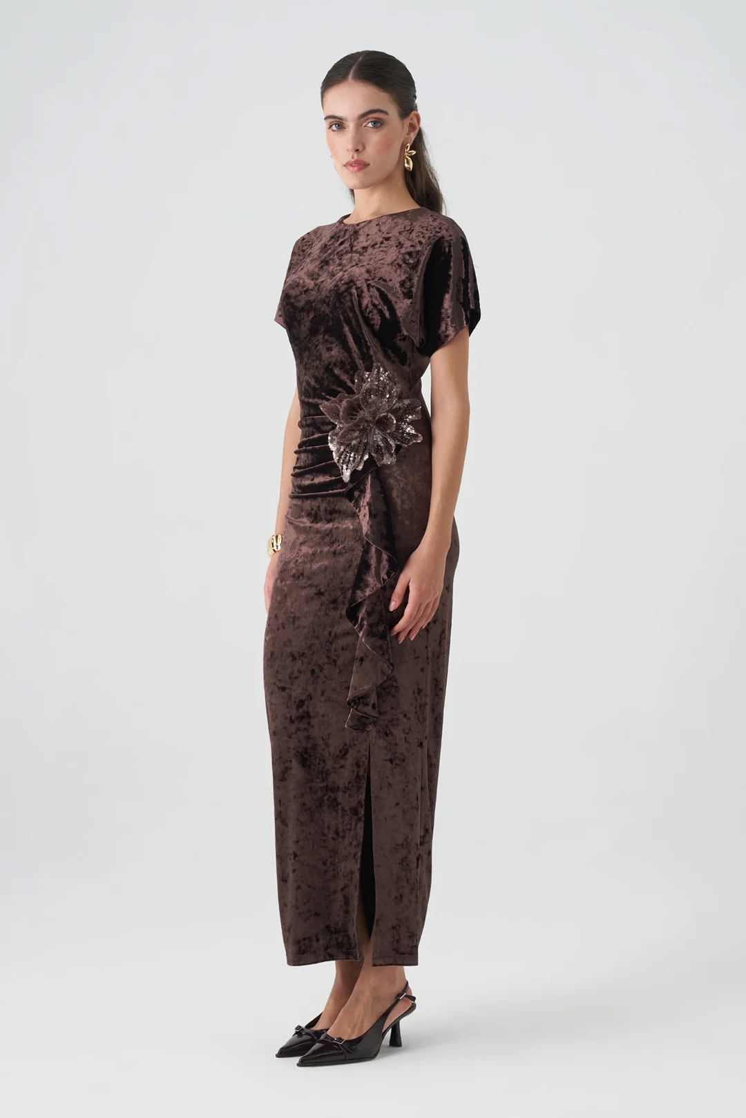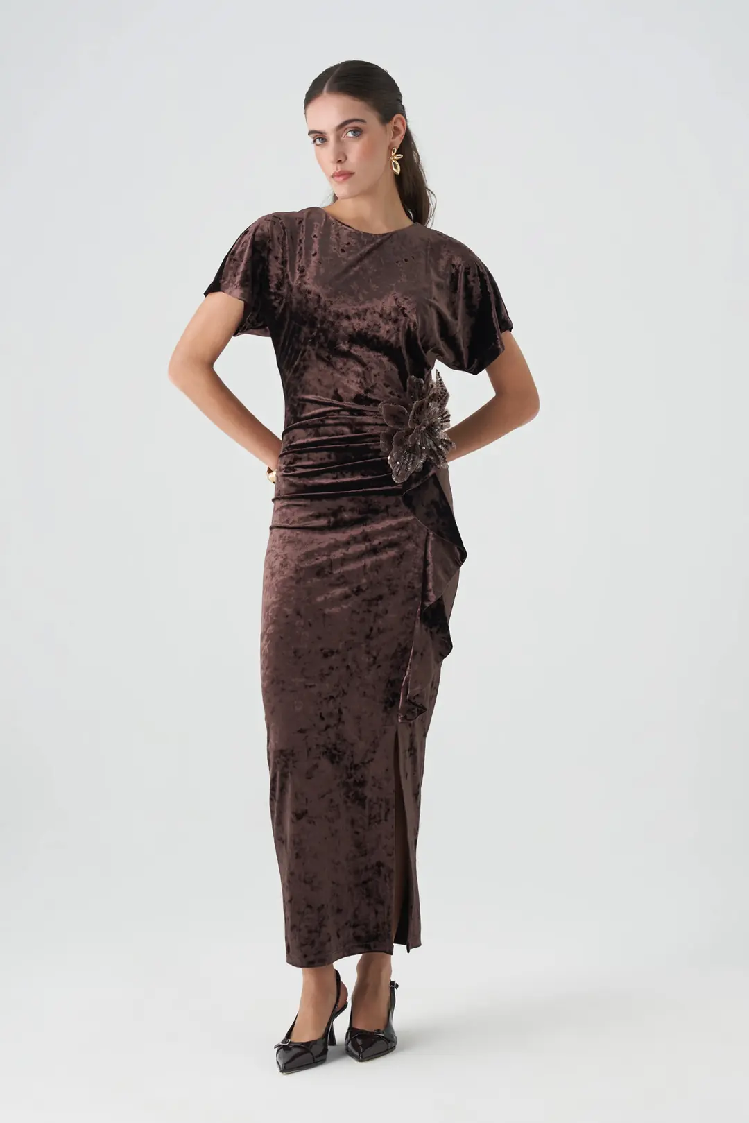 Işıltılı zarafetin en romantik hali: bordo kadife görünümlü çiçek detaylı elbise, lüks dokusu ve dikkat çekici siluetiyle özel davetlerin vazgeçilmezi. Kırışık efektli kadife kumaşı, ışığı zarifçe yansıtarak derin bir parlaklık kazandırırken, yan bel kısmındaki çiçek aplikesi tasarıma feminen bir vurgu ekler.