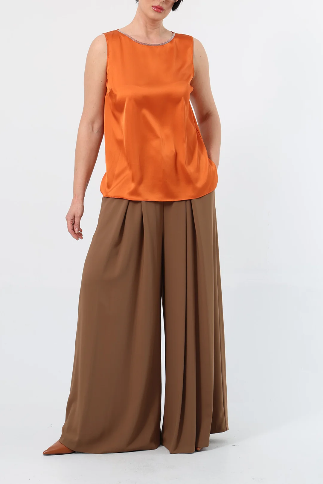 Canlı fuşya rengi ve parlak saten dokusuyla öne çıkan kadın bluz, feminen ve modern bir şıklık sunuyor. Kolsuz tasarımı sayesinde yaz aylarında rahat kullanım imkânı sağlarken, etek ve pantolonlarla kolayca kombinlenebilir. Günlük şıklıktan özel davetlere kadar zarif bir alternatif oluşturur.