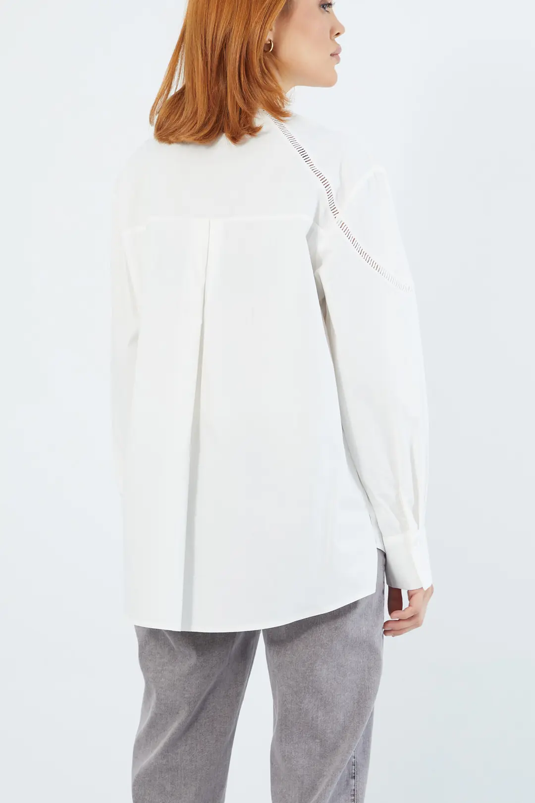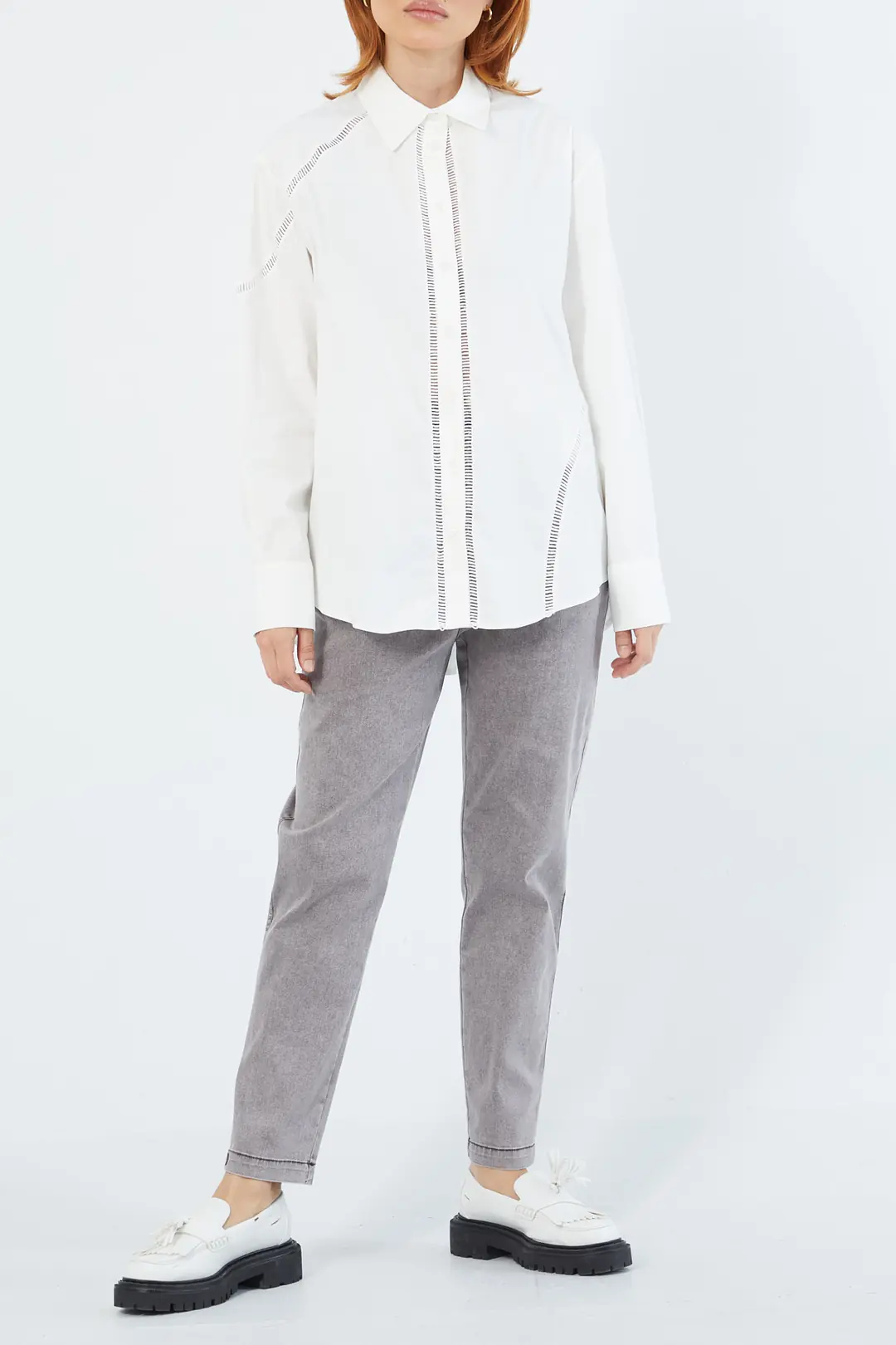Zarif işlemeleriyle dikkat çeken beyaz gömlek, gri pantolon ile kombinlenerek hem ofis stilinde hem de günlük kullanımda sofistike bir görünüm sunar. Rahat kalıbı ve modern tasarımıyla şıklığı ve konforu bir arada yaşatır.