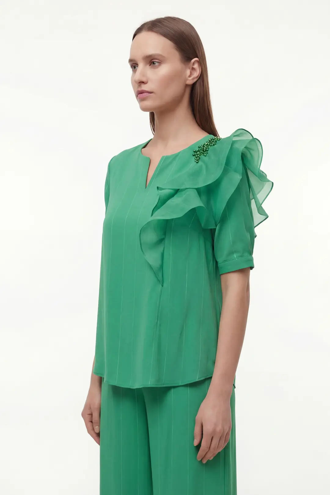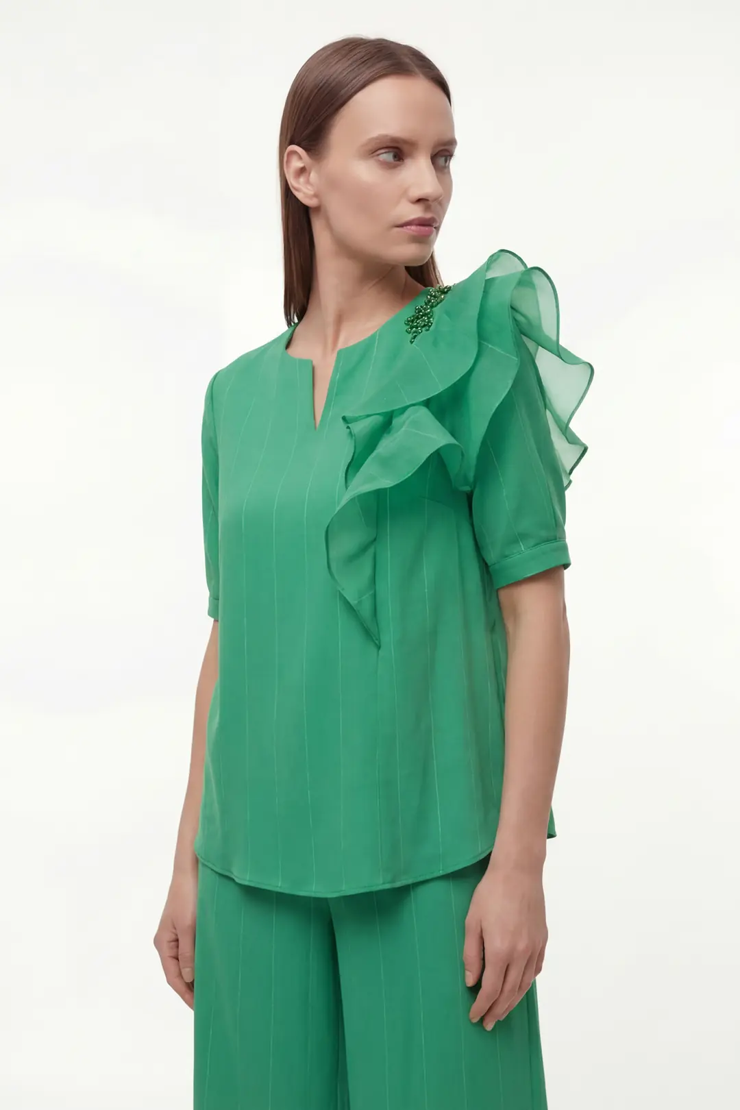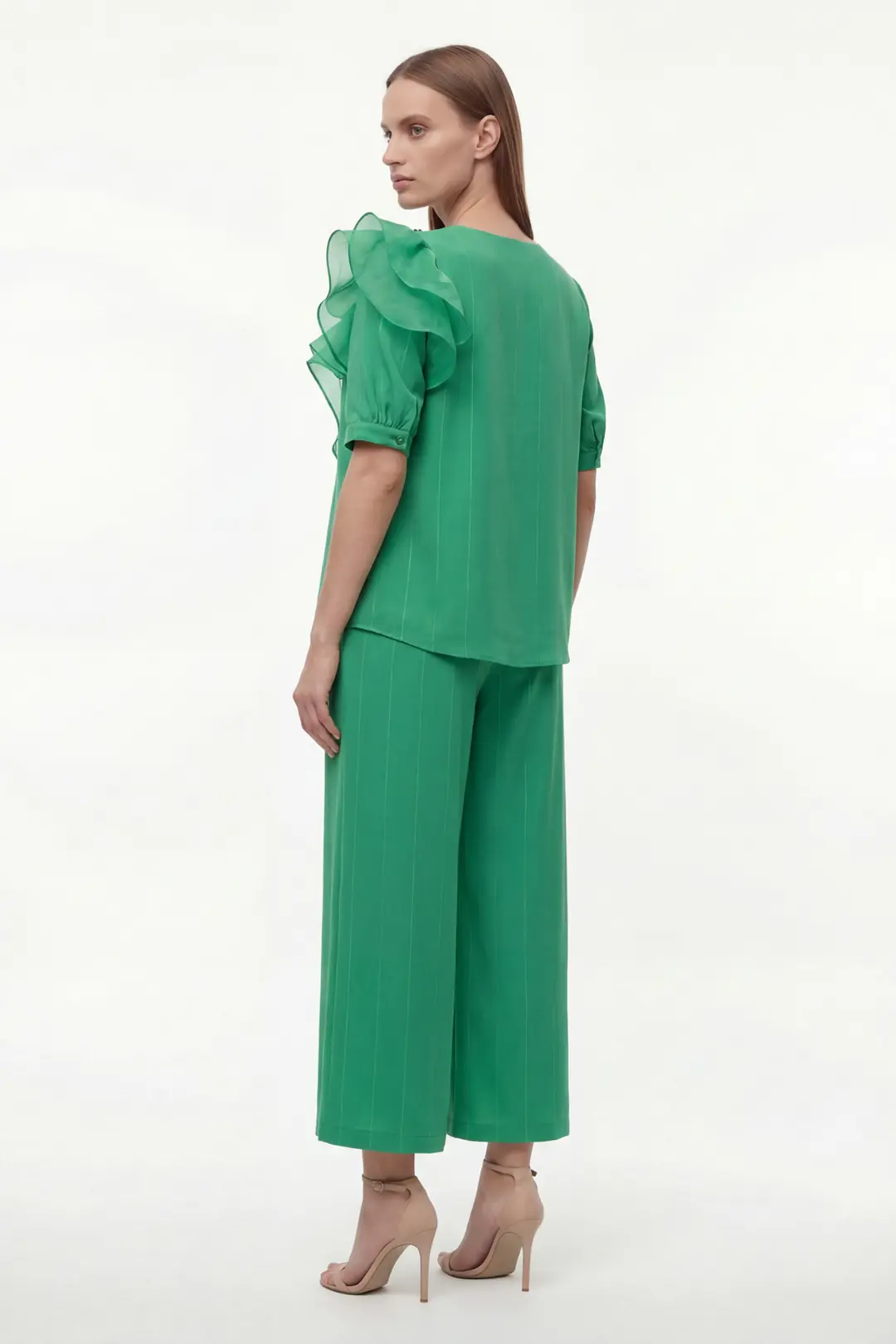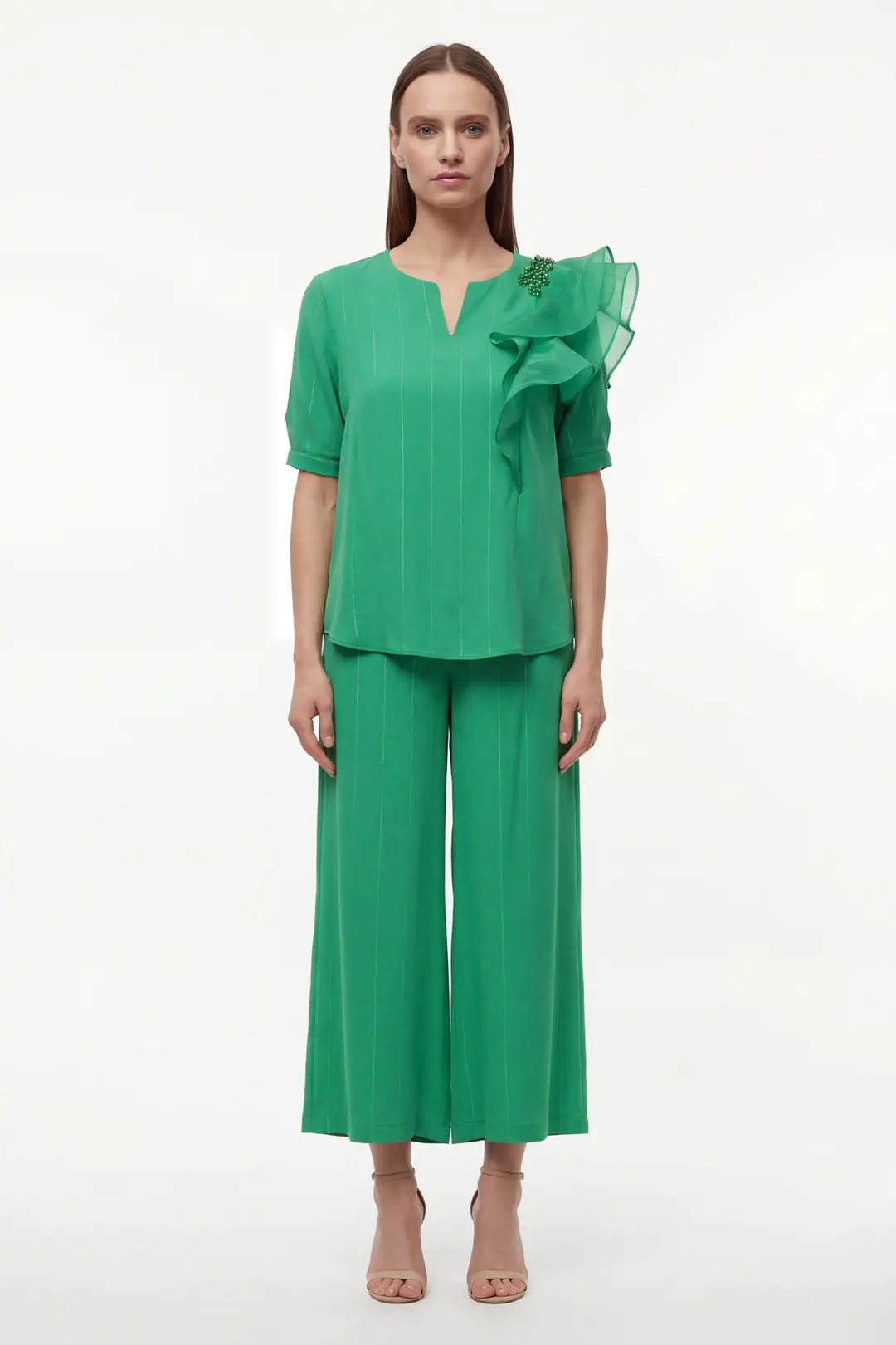Kısa kollu bluz ve culotte pantolon tasarımıyla modern ve konforlu bir stil sunar. Günlük şıklık ve yaz aylarında rahat kullanım için ideal bir seçenektir.