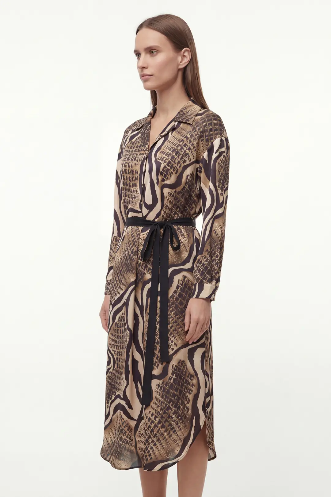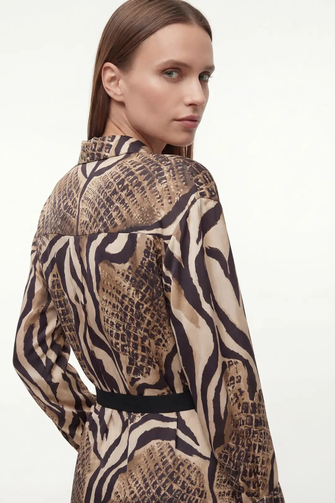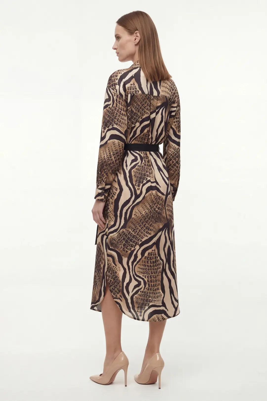 Doğanın enerjisinden ilham alan leopar desenli midi elbise, belden bağlamalı kuşak detayıyla şıklığı vurguluyor. Uzun kollu tasarımı ve rahat kesimiyle hem günlük kombinlerde hem de özel davetlerde cesur ve modern bir stil sunar.