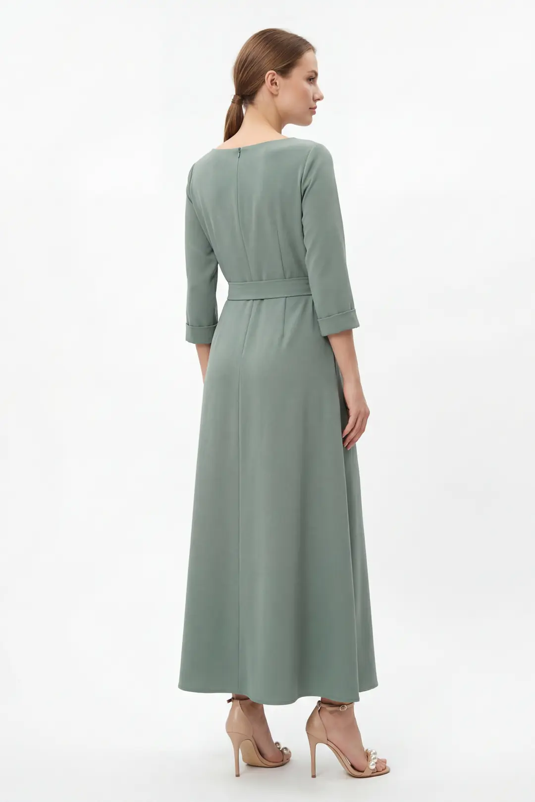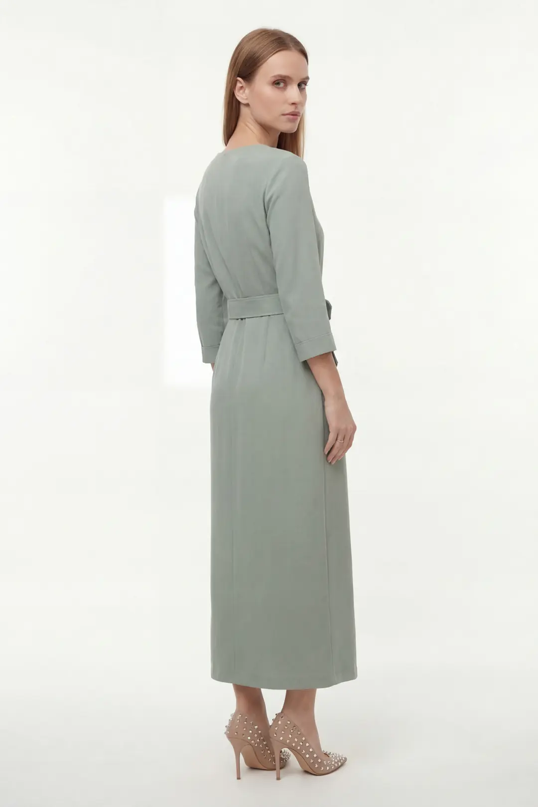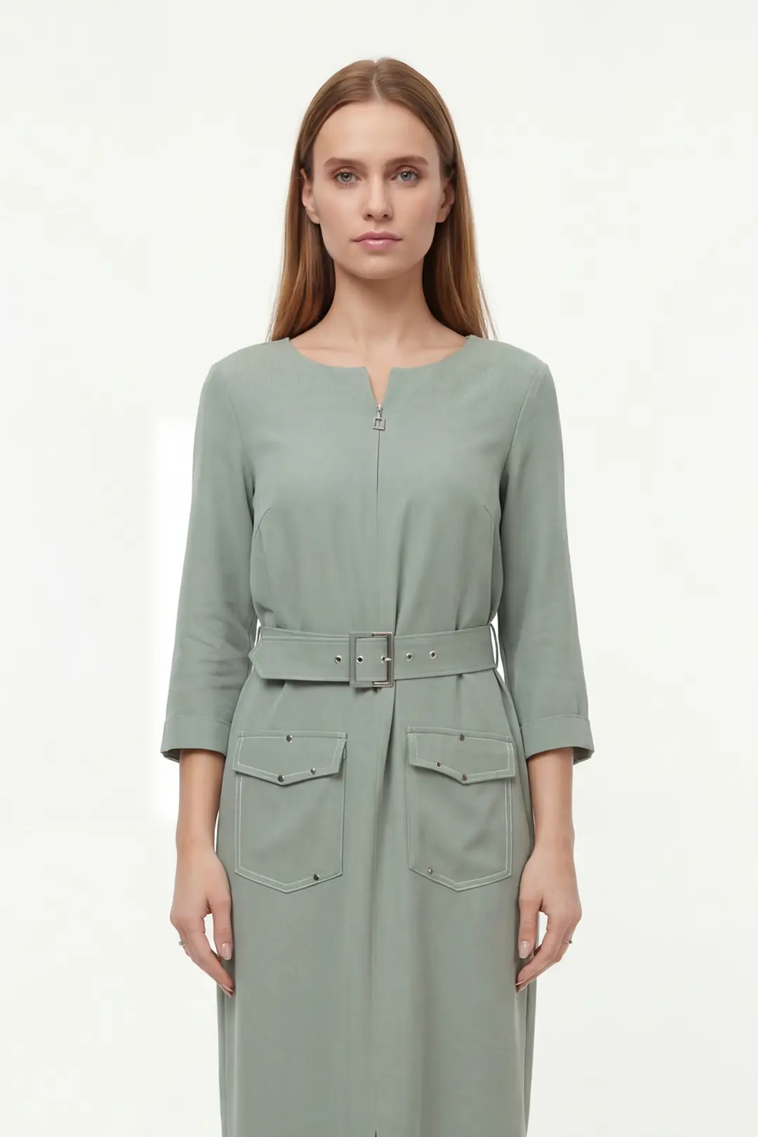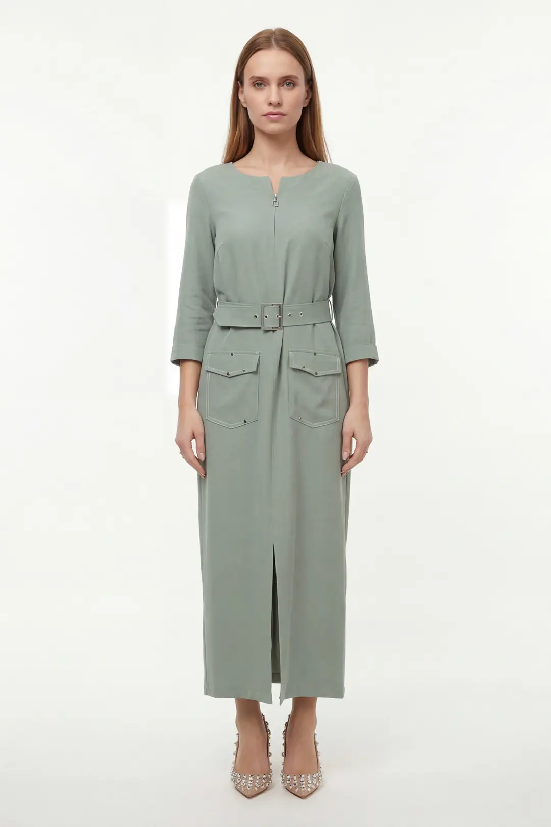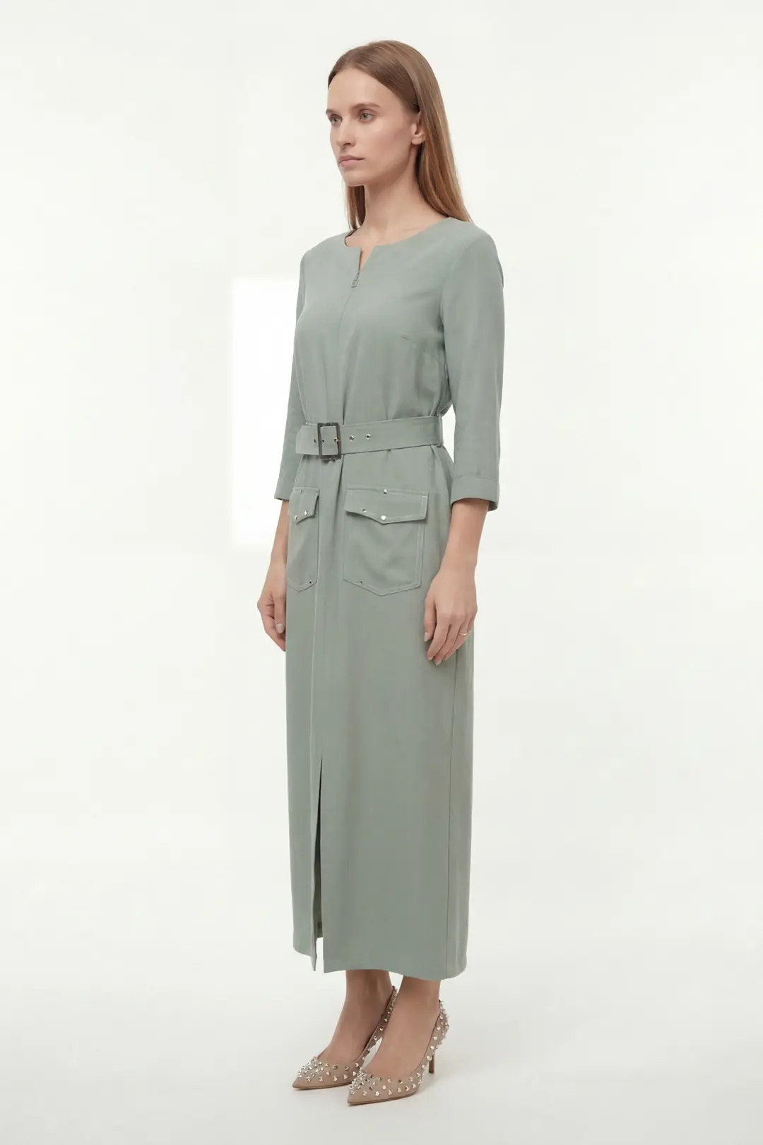 Detay: Ön cep tasarımı, belden kemerli, ön yırtmaçlı