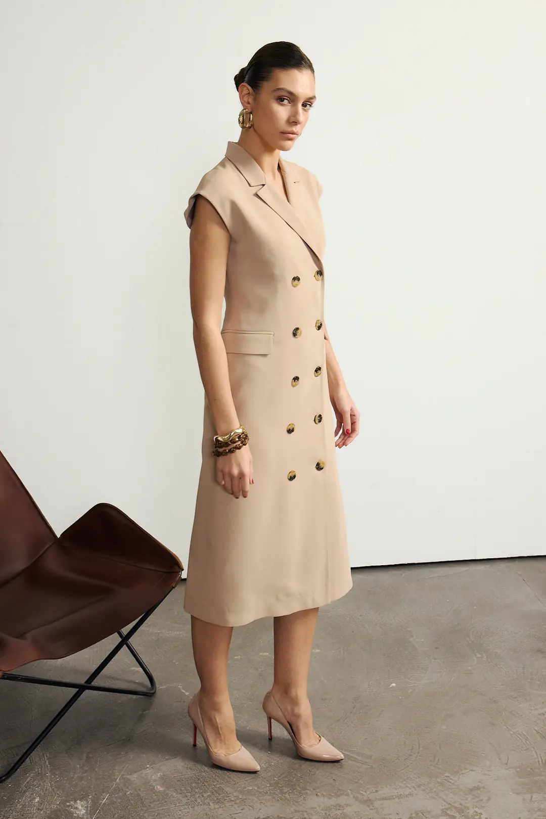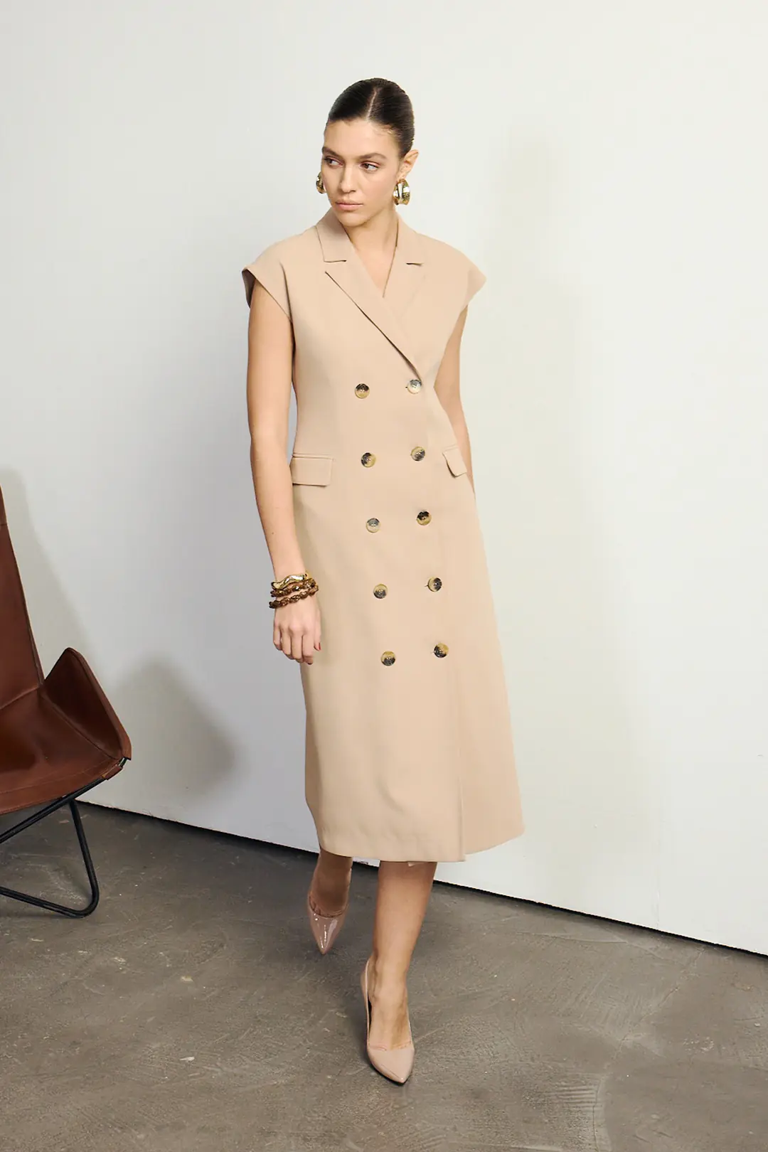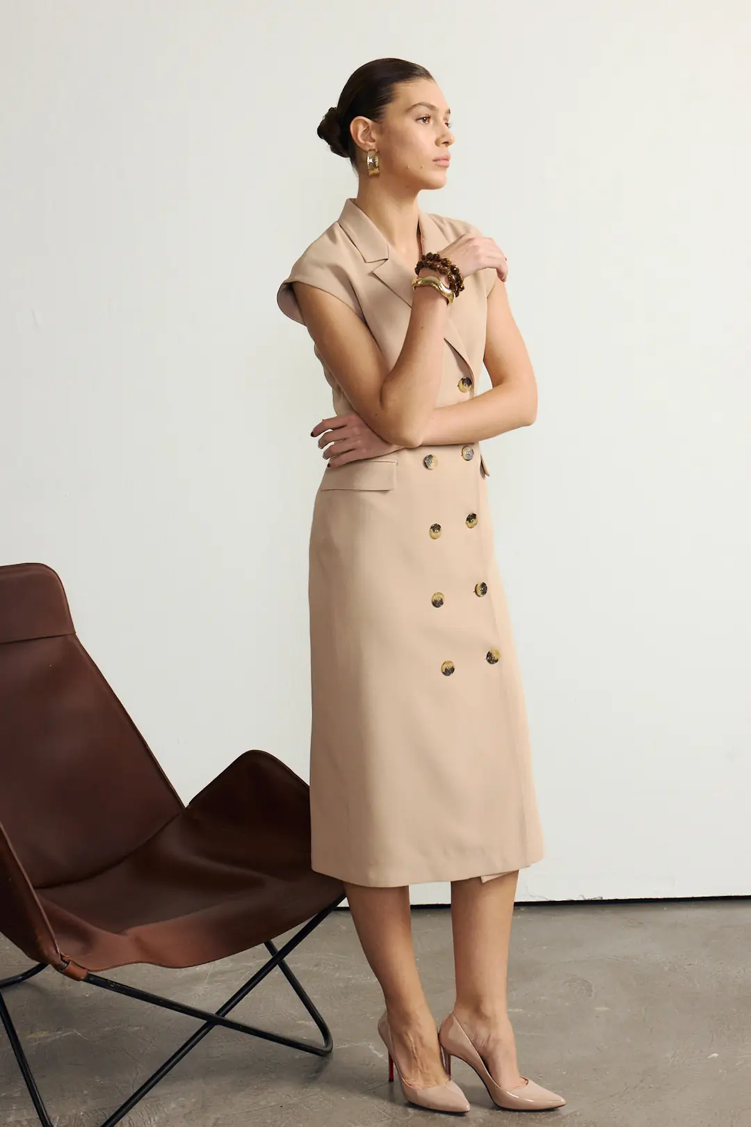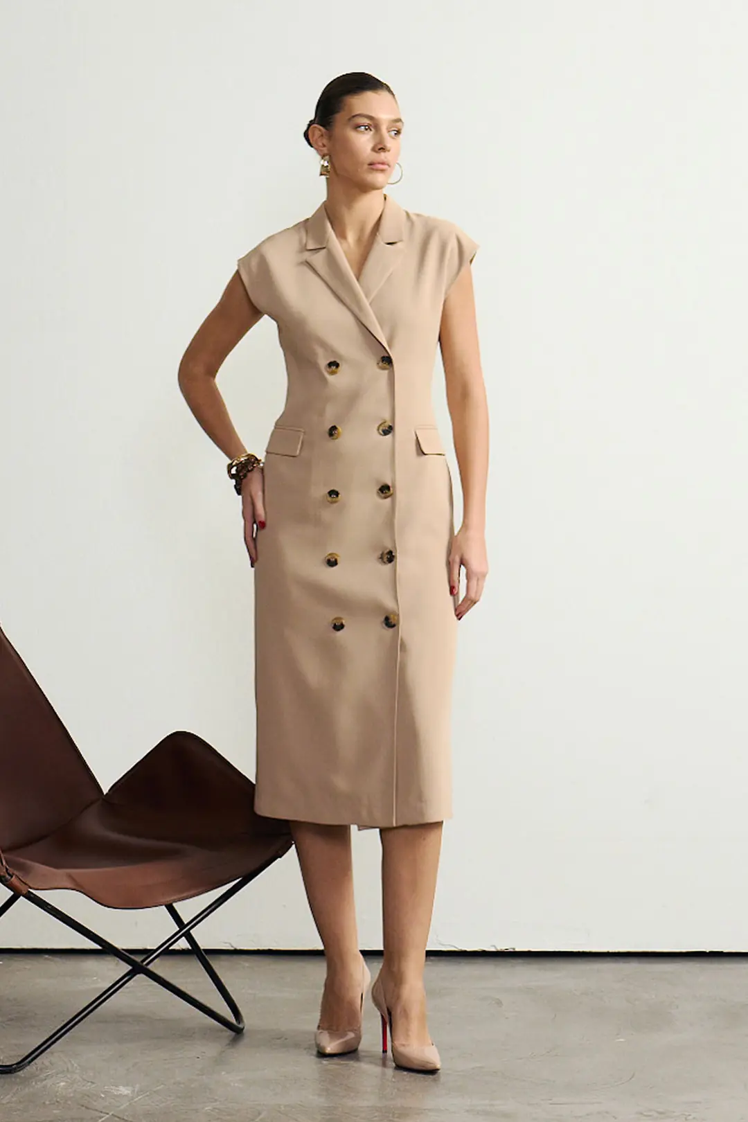 Şıklığıyla öne çıkan bej kruvaze düğmeli midi elbise, kolsuz tasarımı ve minimalist çizgileriyle hem ofis kombinlerinde hem de özel davetlerde modern bir görünüm sunar. Zamansız tarzıyla gardırobunuzun en kullanışlı parçalarından biri olacak.