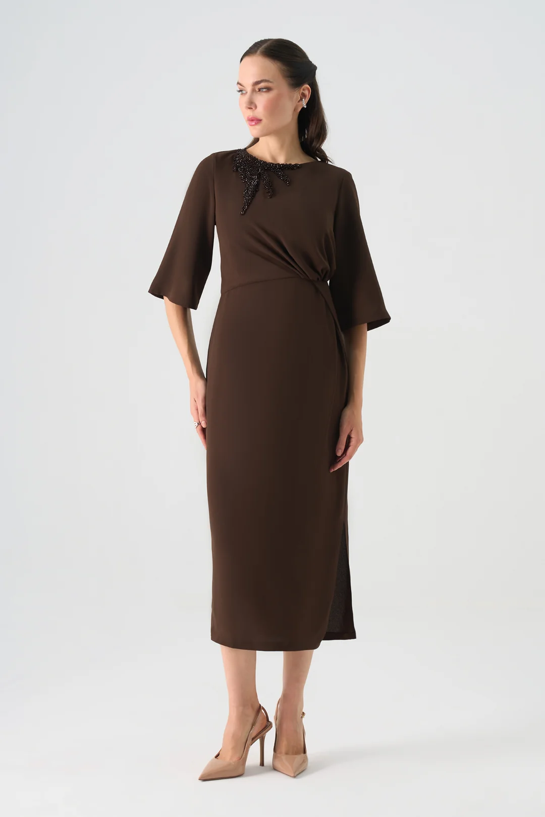 Zarif silueti ve modern detaylarıyla öne çıkan bu elbise, sade şıklığın en zarif halini sunar. Yaka kısmındaki boncuk işlemeleri tasarıma ışıltılı bir dokunuş katarken, bel bölgesindeki drape detayı vücut hatlarını zarifçe vurgular. Akıcı kumaşı sayesinde konforlu bir kullanım sunar ve gün boyu formunu korur.