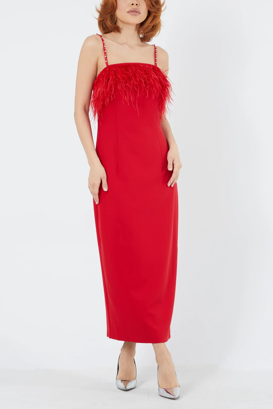 Gece şıklığının vazgeçilmezi olan siyah straplez abiye elbise, göğüs kısmındaki tüy detaylarıyla sofistike bir hava katıyor. Vücuda oturan silueti ve midi boy tasarımıyla zarafeti ön plana çıkaran bu elbise, özel davetler ve kutlamalar için kusursuz bir seçimdir.