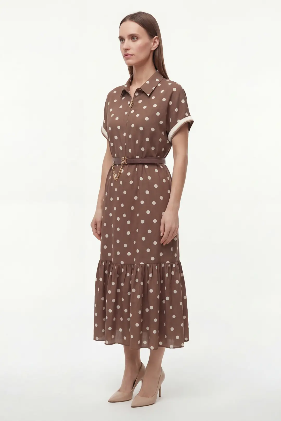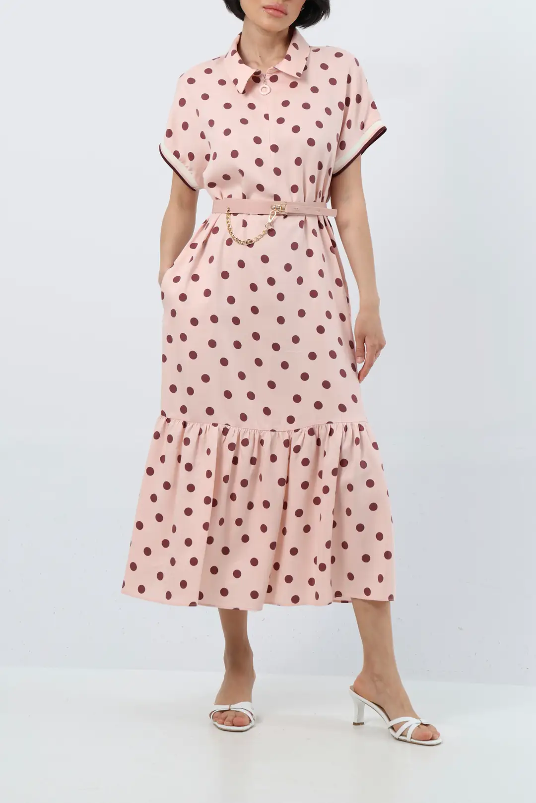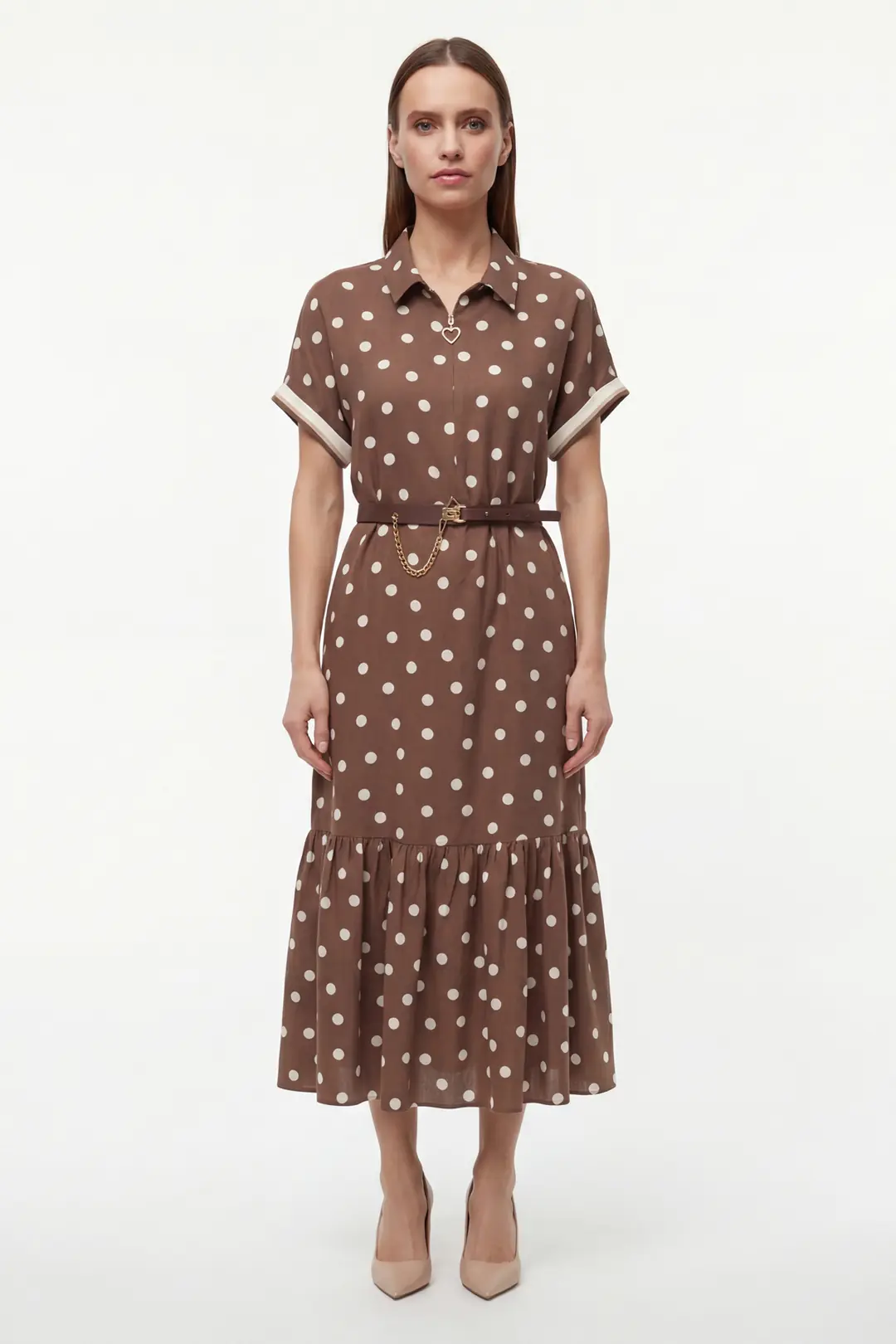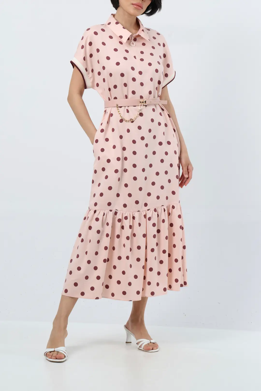 Zamansız puantiye deseniyle öne çıkan bu midi elbise, feminen ve zarif bir stil sunar. Gömlek yaka tasarımı klasik bir duruş kazandırırken, kısa kollu formu günlük kullanıma konfor sağlar. Bel kısmında yer alan kemer ve zincir aksesuar detayı, vücut formunu dengeli şekilde vurgulayarak şık bir silüet oluşturur.