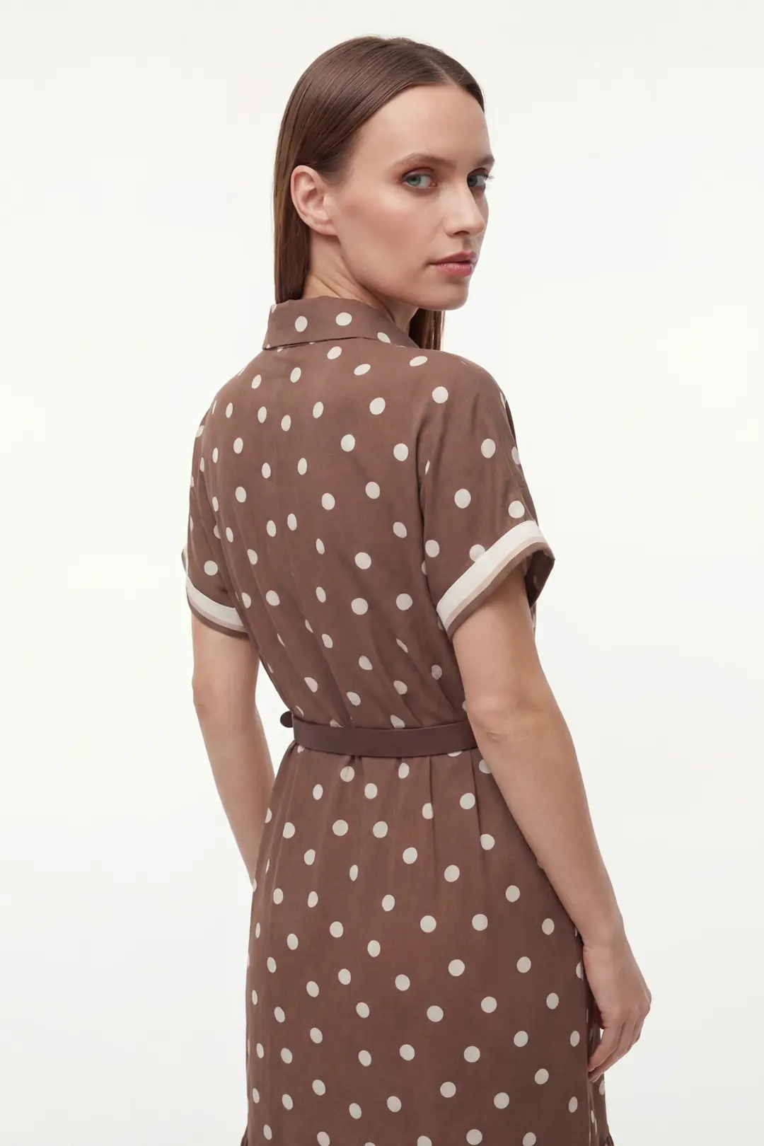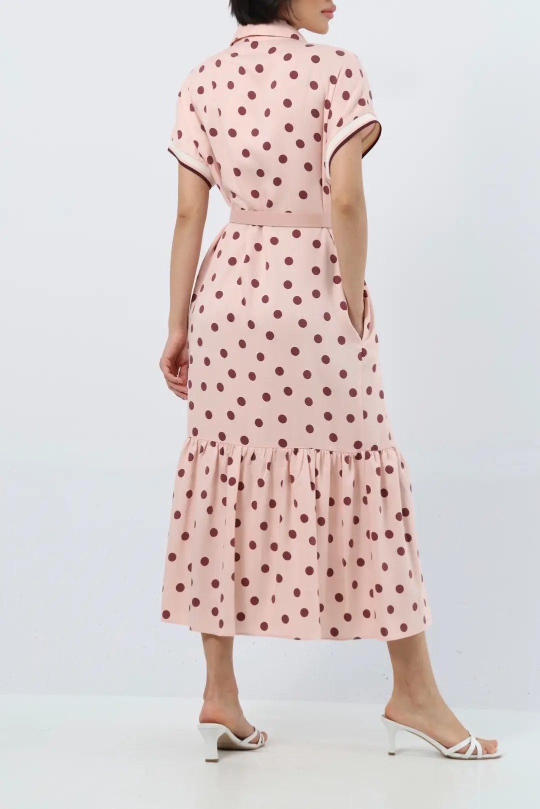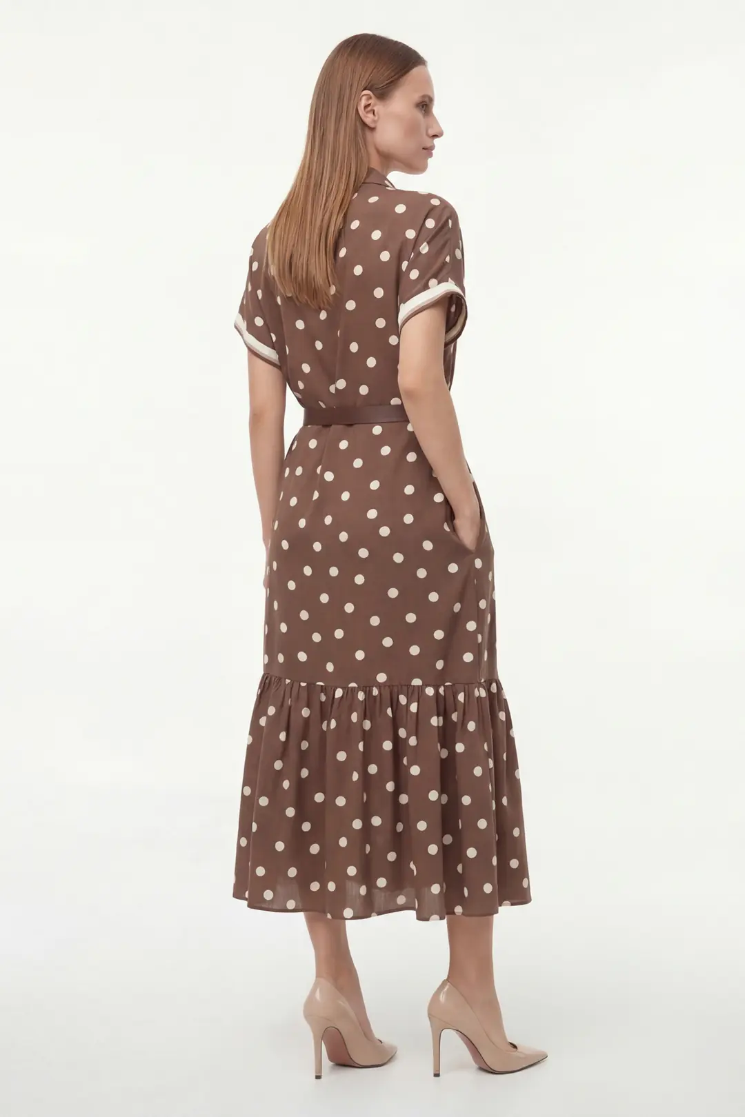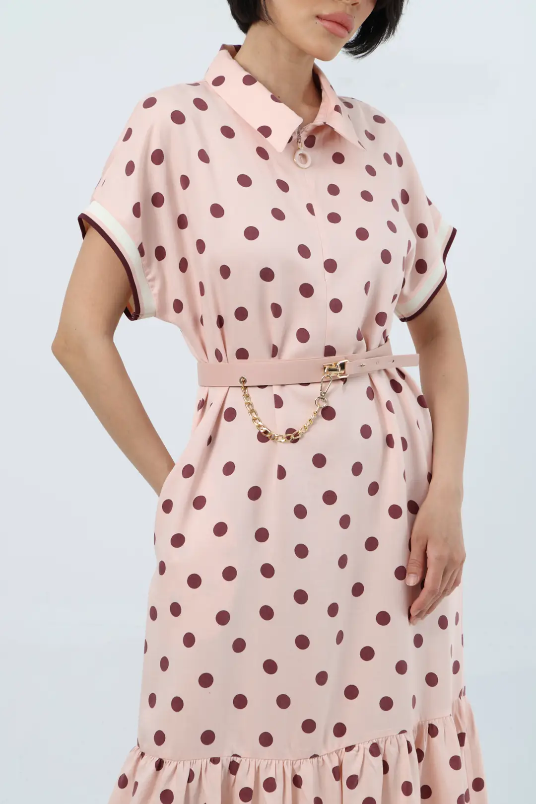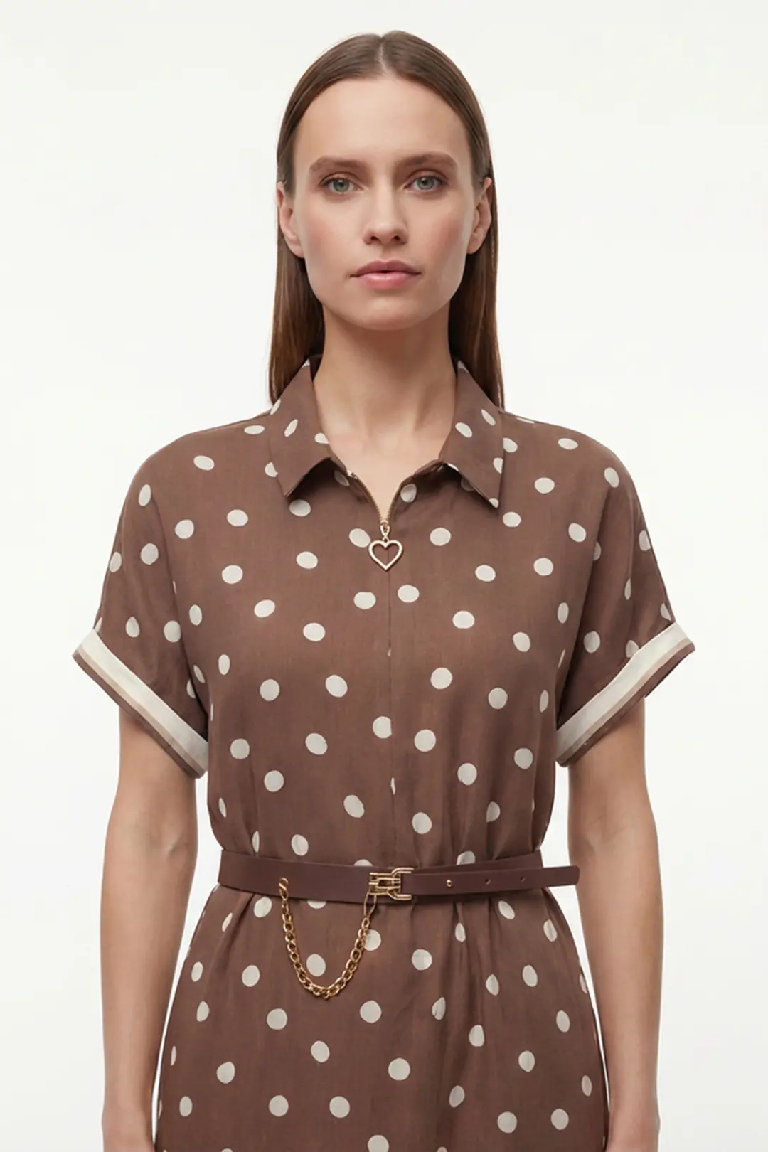 Zamansız puantiye deseniyle öne çıkan bu midi elbise, feminen ve zarif bir stil sunar. Gömlek yaka tasarımı klasik bir duruş kazandırırken, kısa kollu formu günlük kullanıma konfor sağlar. Bel kısmında yer alan kemer ve zincir aksesuar detayı, vücut formunu dengeli şekilde vurgulayarak şık bir silüet oluşturur.