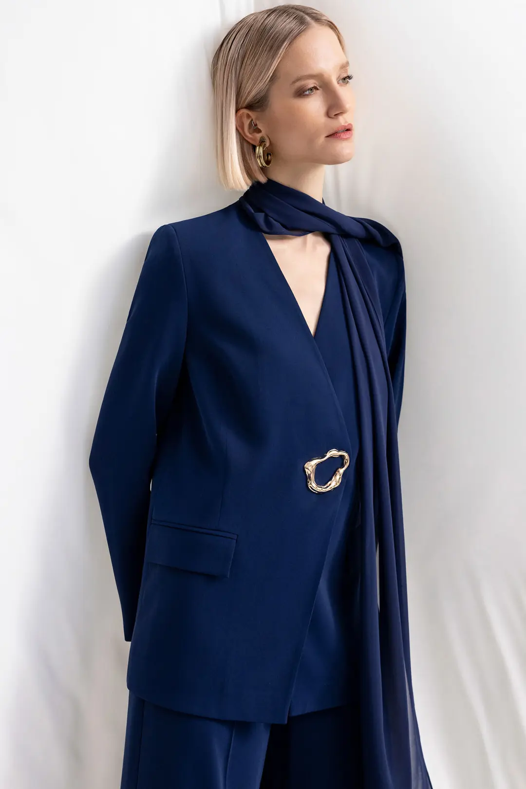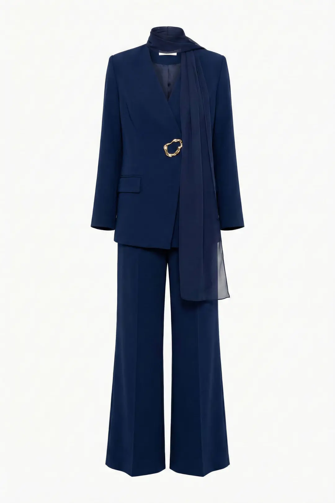 Kadın blazer takım, kruvaze ceket pantolon takım, şal detaylı takım elbise, şık davet kombini ve modern ofis stili aramalarında öne çıkan zamansız bir tasarımdır. Minimal detaylarla maksimum etki yaratmak isteyenler için ideal bir seçimdir.