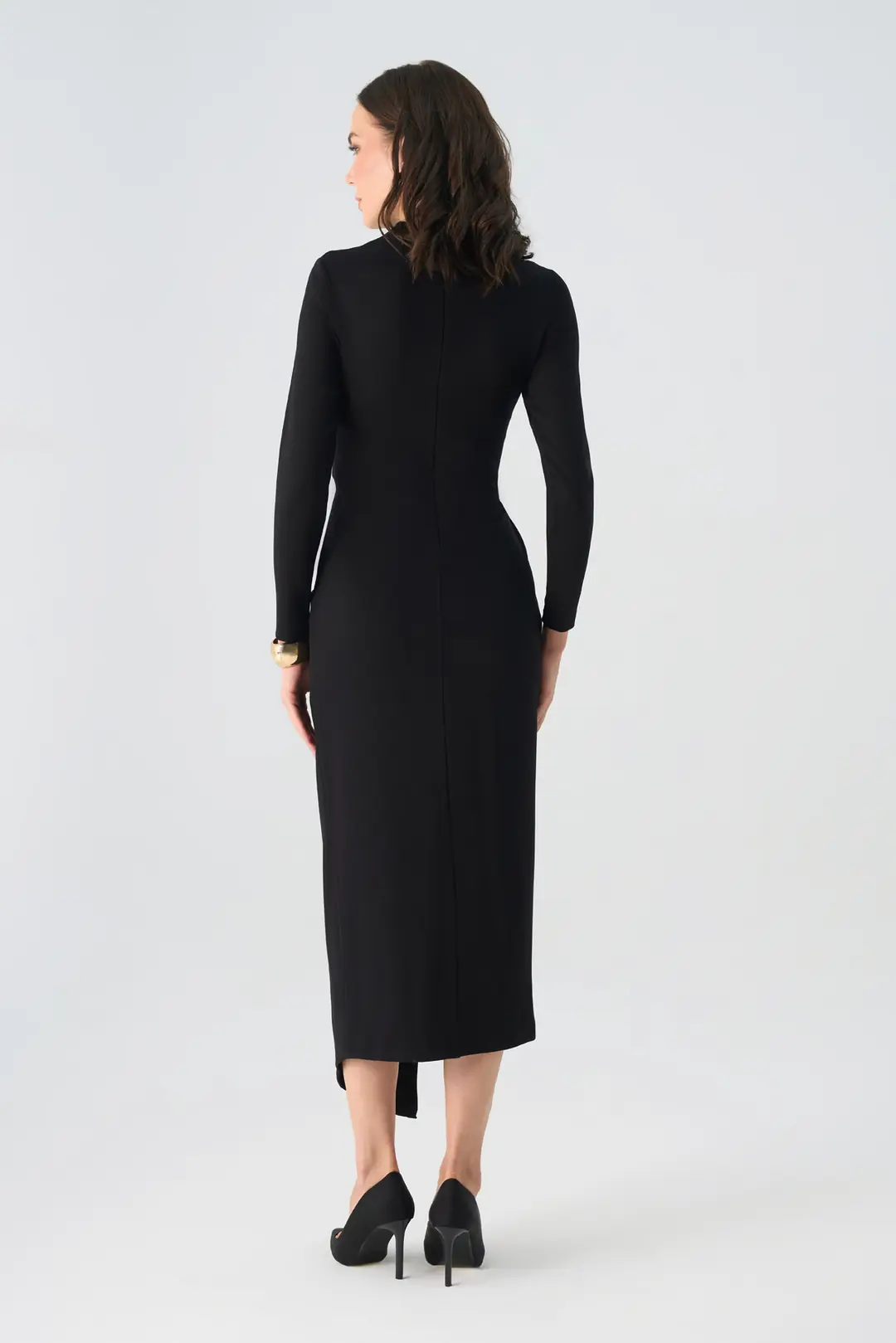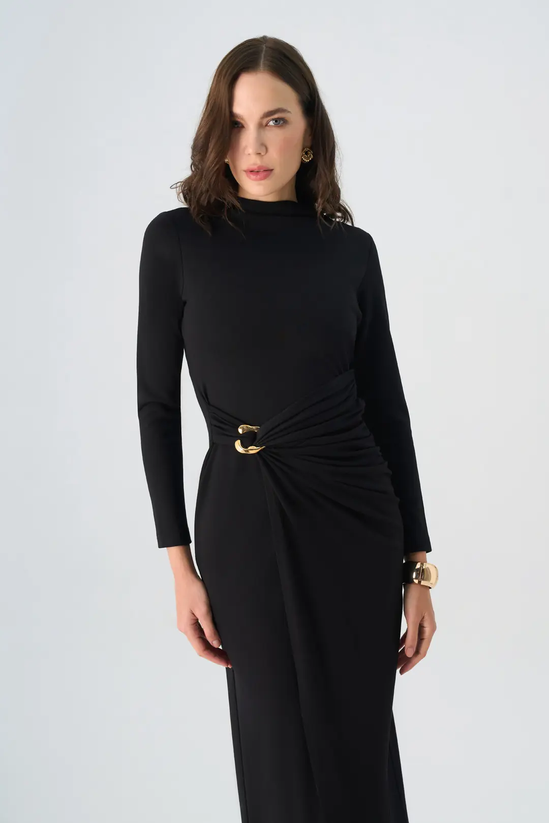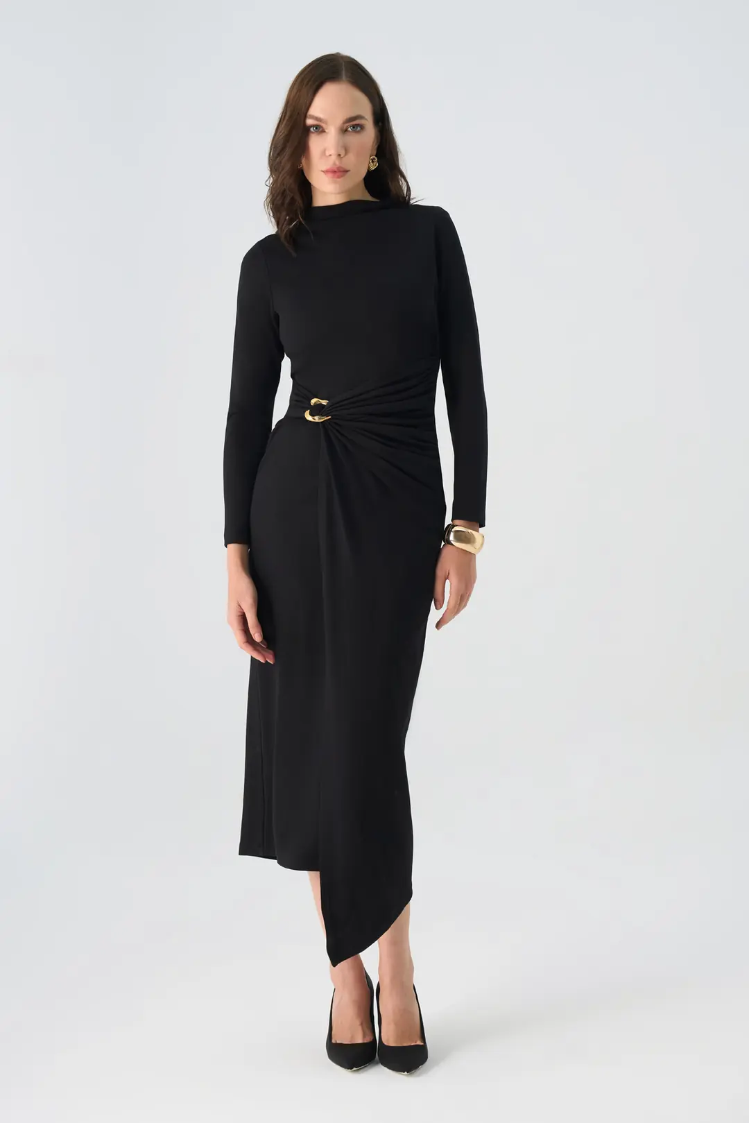 Modern zarafetin güçlü çizgilerini taşıyan bu elbise, sade formuna rağmen dikkat çekici bir duruş sergiler. Yüksek yaka ve uzun kollu tasarımıyla klasik bir şıklık sunarken, bel kısmındaki metal tokalı drape detayı vücut hatlarını zarif bir biçimde vurgular. Asimetrik etek kesimi ise tasarıma dinamik bir siluet kazandırır.