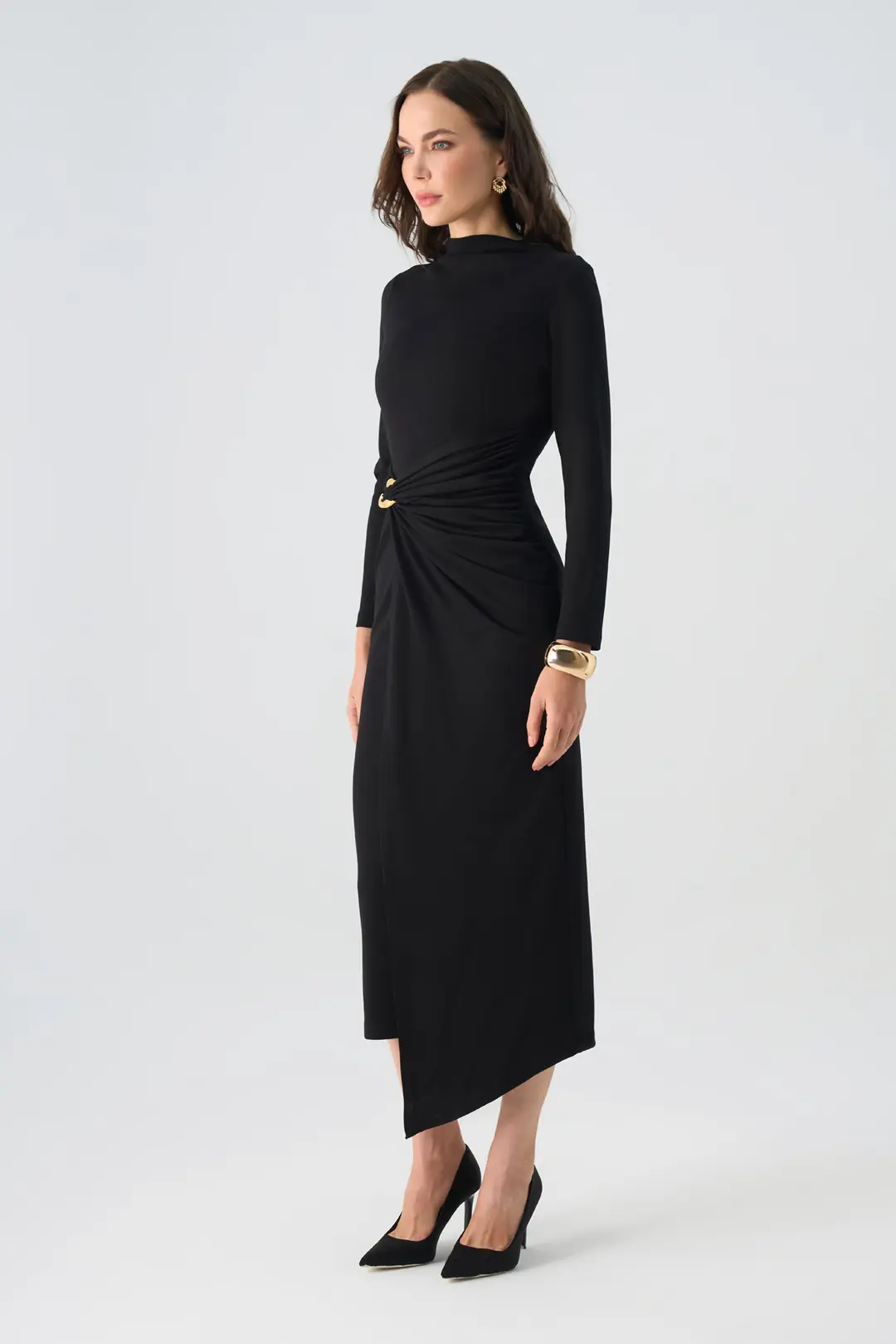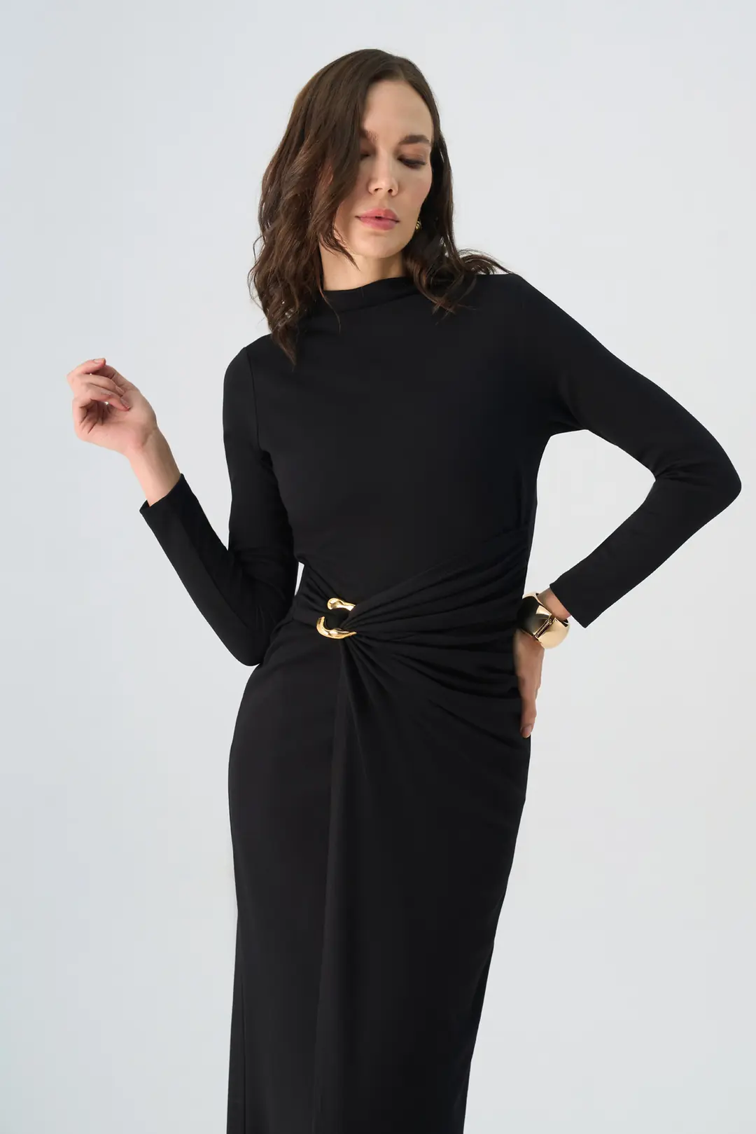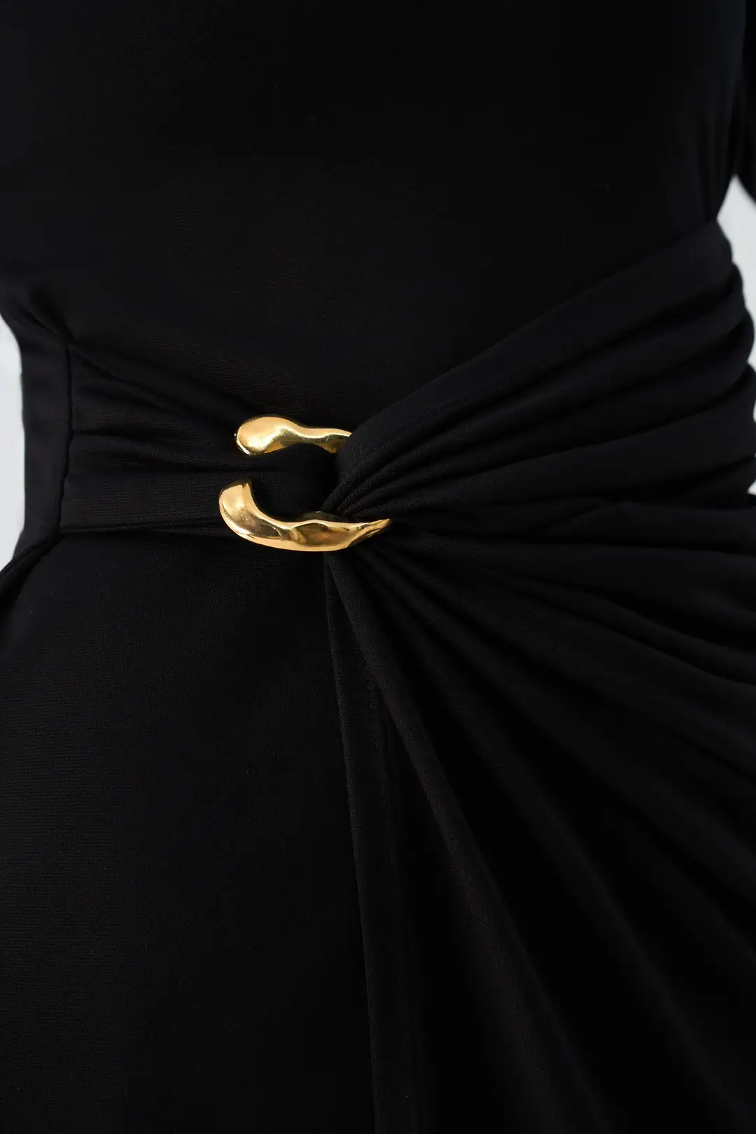 Modern zarafetin güçlü çizgilerini taşıyan bu elbise, sade formuna rağmen dikkat çekici bir duruş sergiler. Yüksek yaka ve uzun kollu tasarımıyla klasik bir şıklık sunarken, bel kısmındaki metal tokalı drape detayı vücut hatlarını zarif bir biçimde vurgular. Asimetrik etek kesimi ise tasarıma dinamik bir siluet kazandırır.