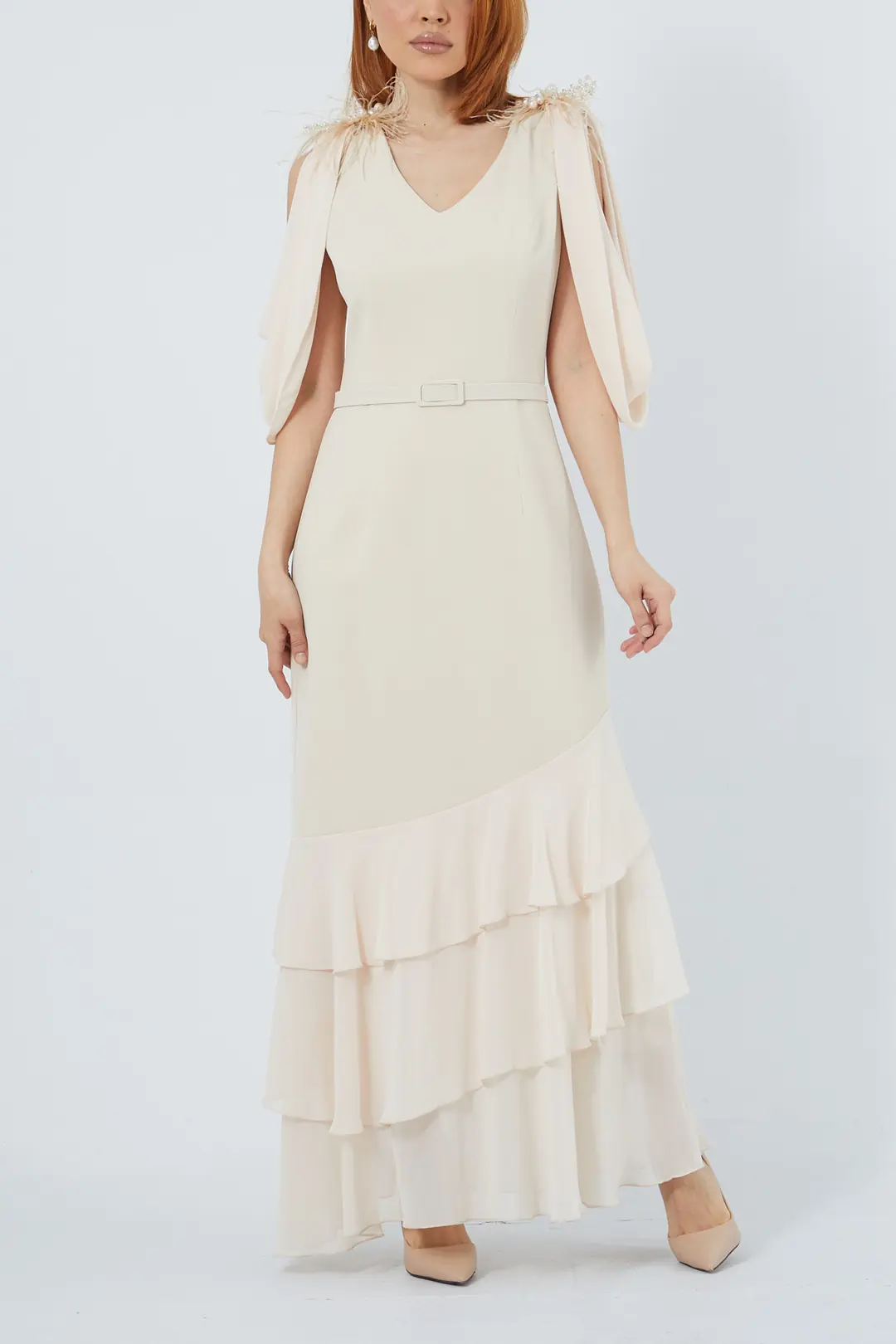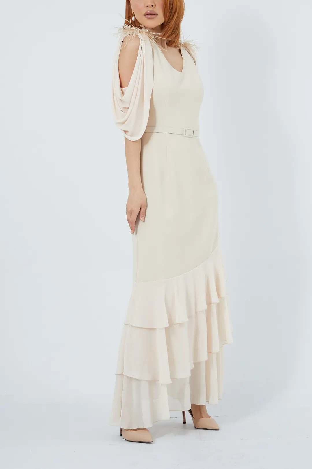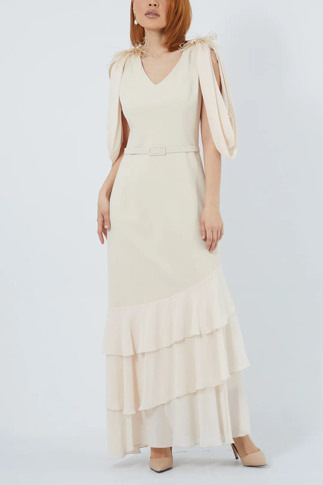 Zarif tasarımıyla dikkat çeken bej abiye elbise, uçuşan kat kat volanlı eteği ve belden kemerli formuyla modern bir şıklık sunuyor. Drapeli kol detayları feminen bir dokunuş katarken, özel günler ve davetlerde sofistike bir görünüm elde etmenizi sağlar.