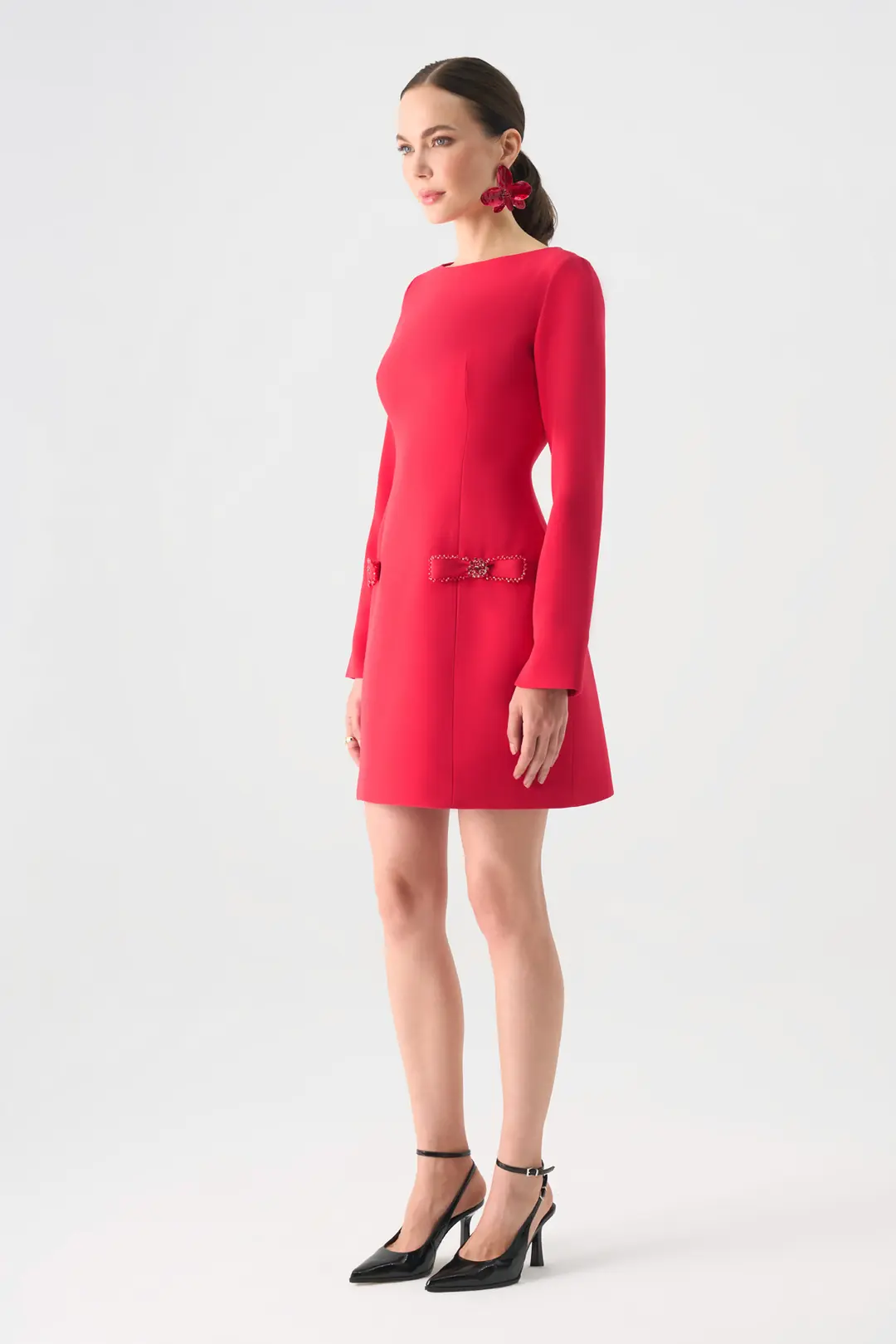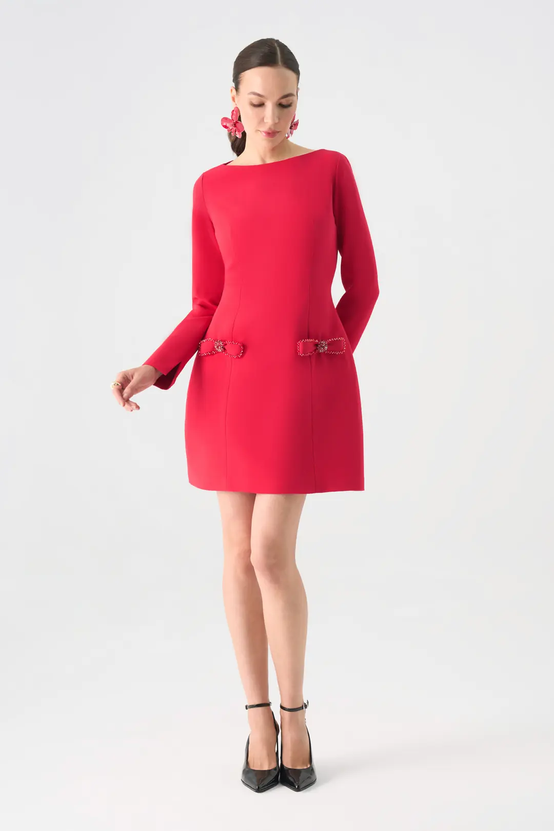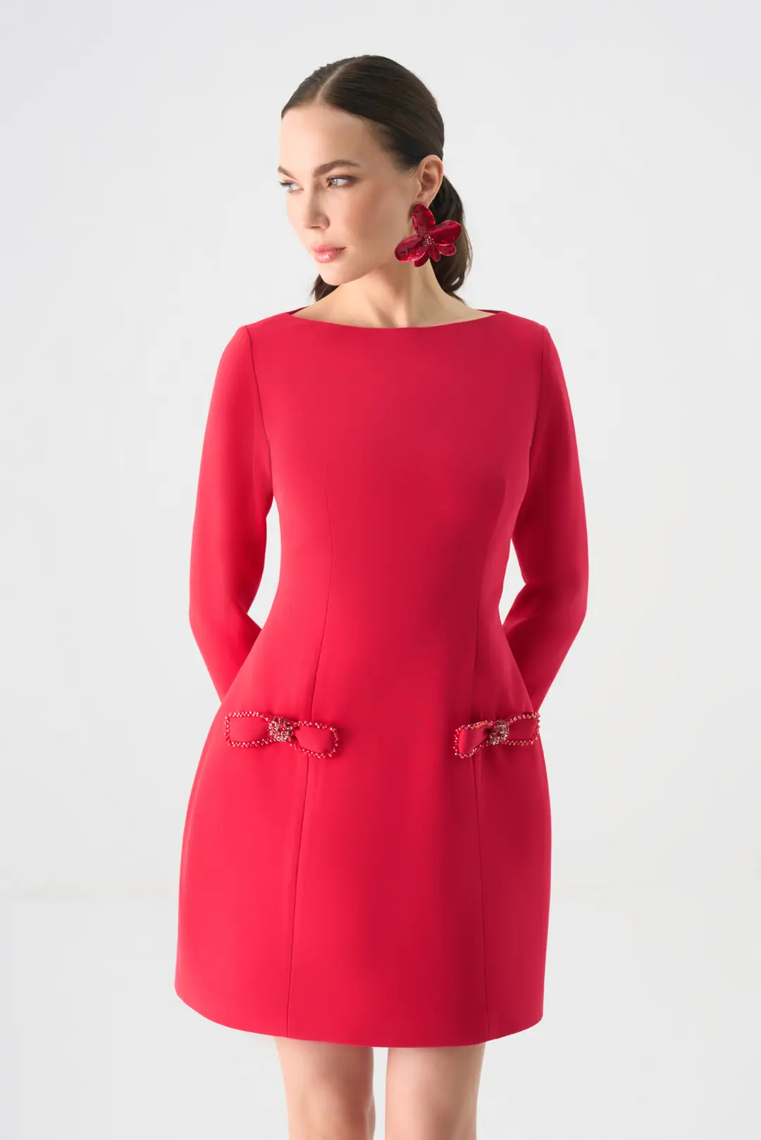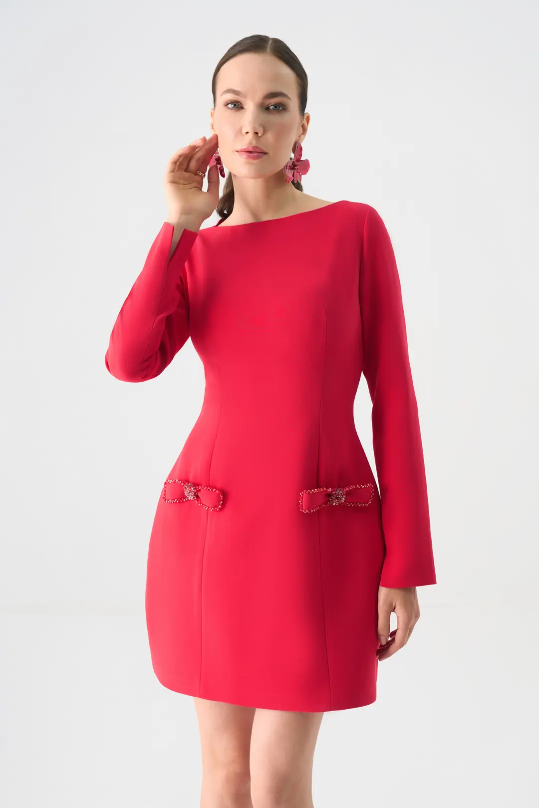 Zarif ve enerjik duruşuyla modern kadın stilini yansıtan bu mini elbise, sade formuna rağmen dikkat çekici bir şıklık sunar. Uzun kollu tasarımı ve düz kesimiyle konforlu bir kullanım sağlarken, ön kısımda yer alan taş detaylı fiyonk süslemeler tasarıma sofistike bir ışıltı kazandırır. Diz üstü boyu sayesinde hem davetlerde hem de özel akşam organizasyonlarında şık bir alternatif oluşturur.