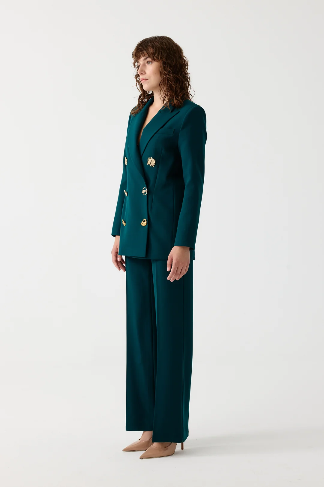 Modern çizgileri ve dikkat çekici detaylarıyla öne çıkan haki pantolon ceket takım, gold düğme süslemeleriyle sofistike bir görünüm sunuyor. Geniş paça pantolonu ve kruvaze ceket tasarımı sayesinde hem ofis kombinlerinde hem de özel davetlerde şık bir alternatif oluşturur.