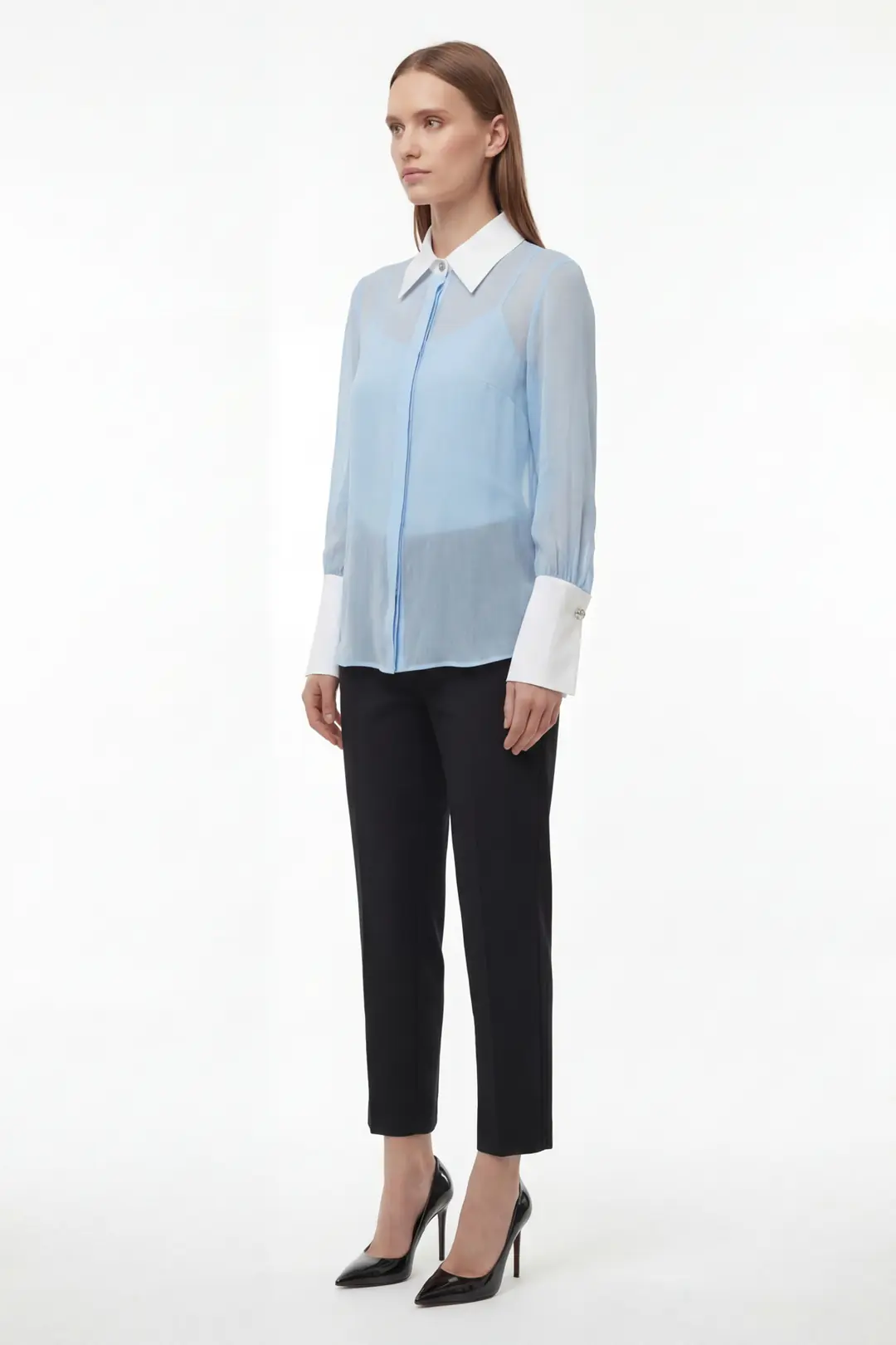 Modern ve zarif tasarımıyla öne çıkan gömlek ve pantolon ikili takım, hem ofis şıklığında hem de günlük kullanımda sofistike bir görünüm sunar. Kontrast renk uyumuyla gardırobunuzun vazgeçilmez parçalarından biri olacak.