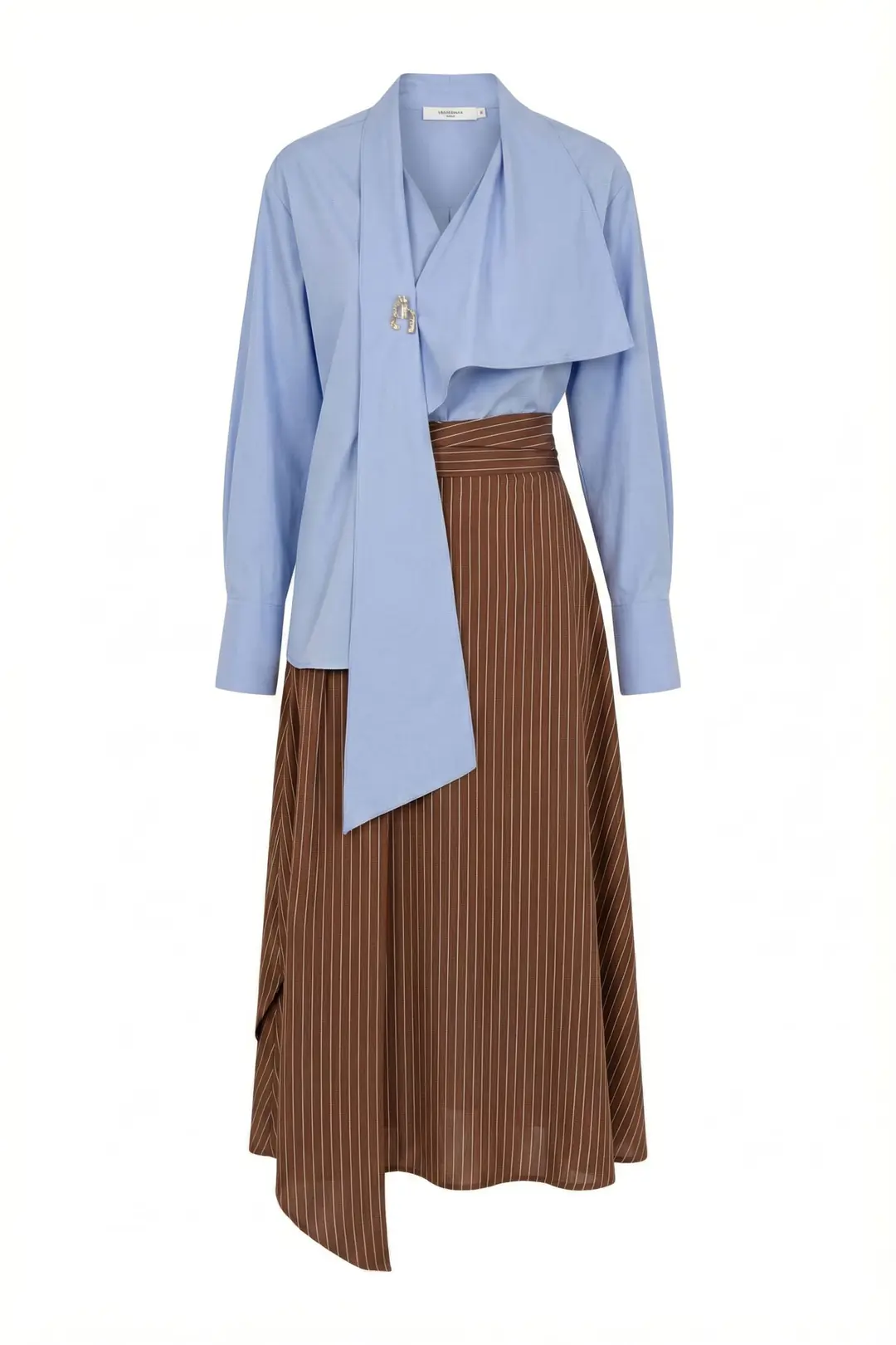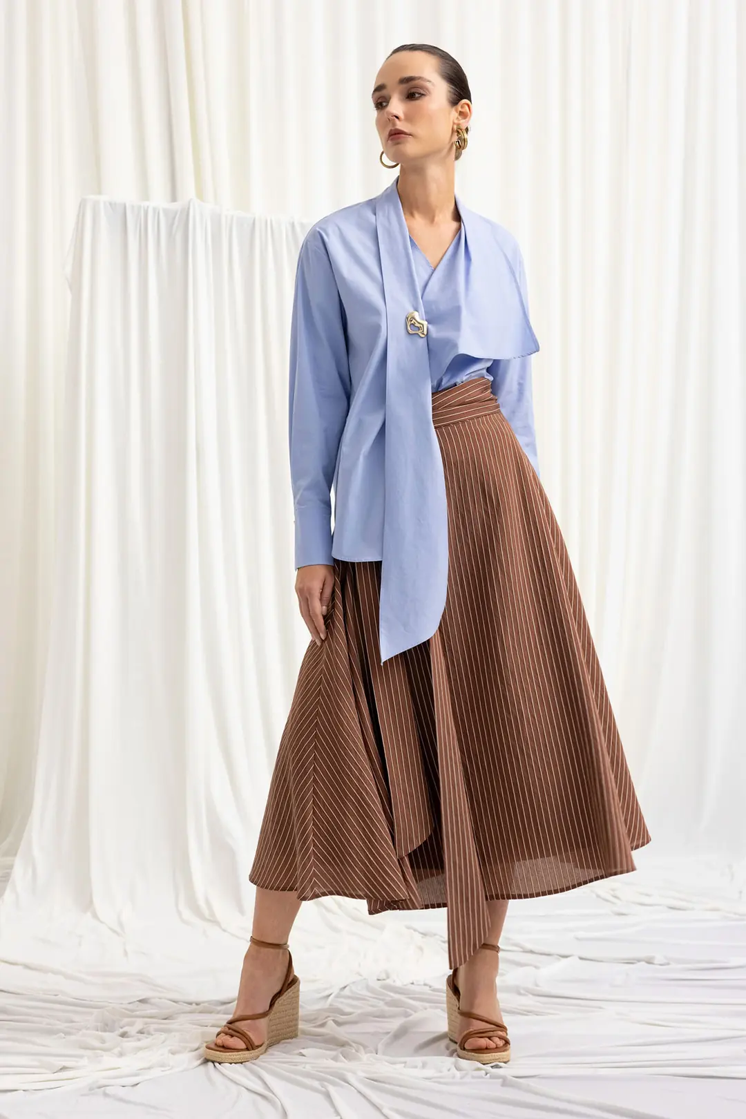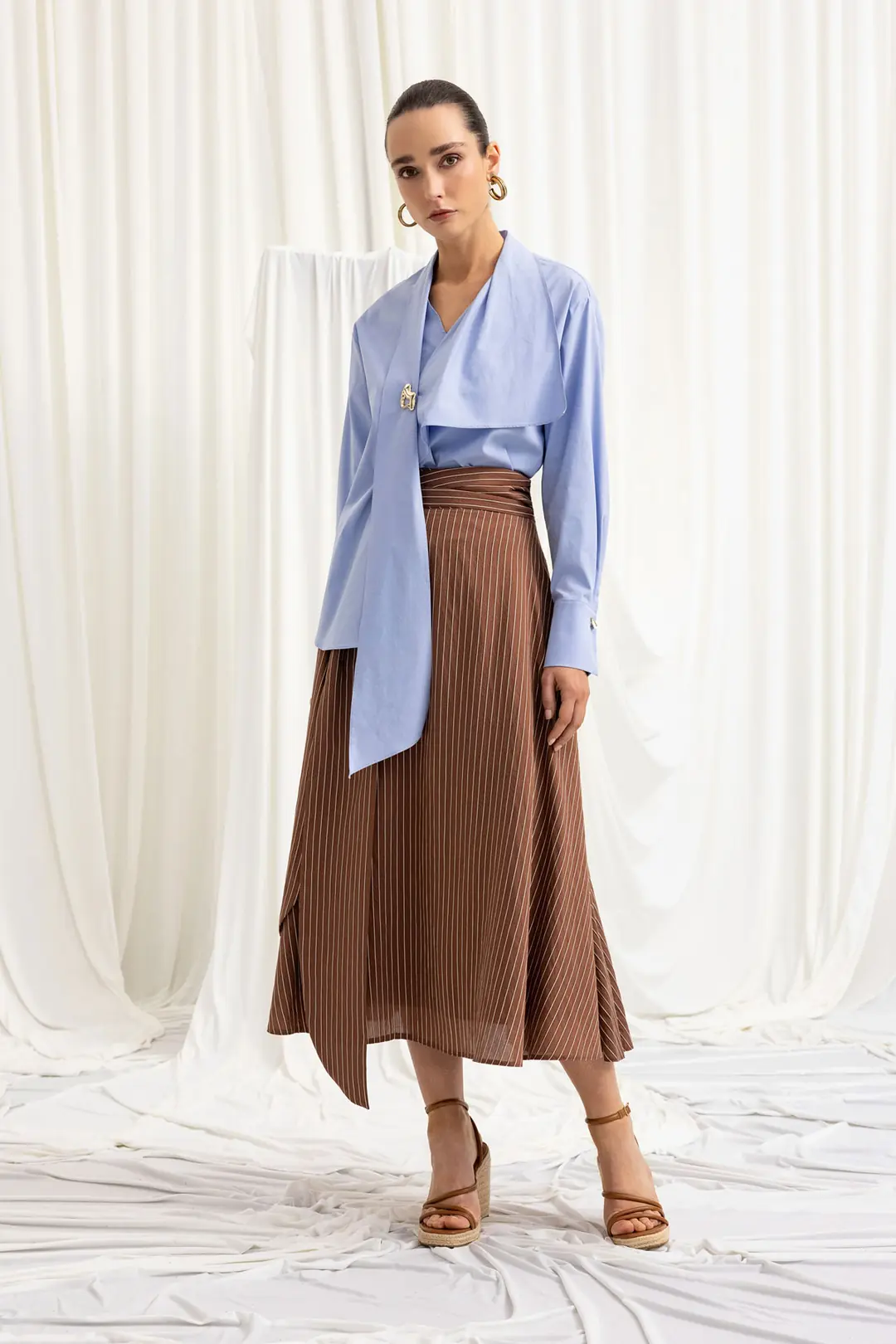Modern çizgi deseni ve asimetrik kesimiyle öne çıkan bu midi etek, şehir stiline sofistike bir dokunuş katar. Yüksek bel yapısı sayesinde vücut formunu dengeli şekilde sarar, rahat kalıbı ise gün boyu konfor sunar. Akıcı kumaşı hareket özgürlüğü sağlarken, çapraz formdaki etek ucu tasarıma dinamik bir görünüm kazandırır.
