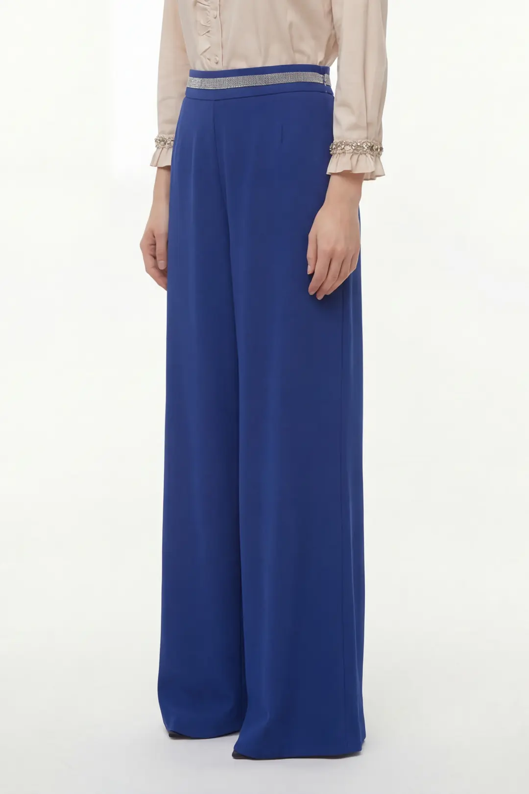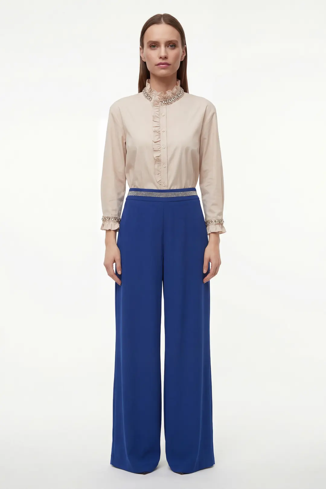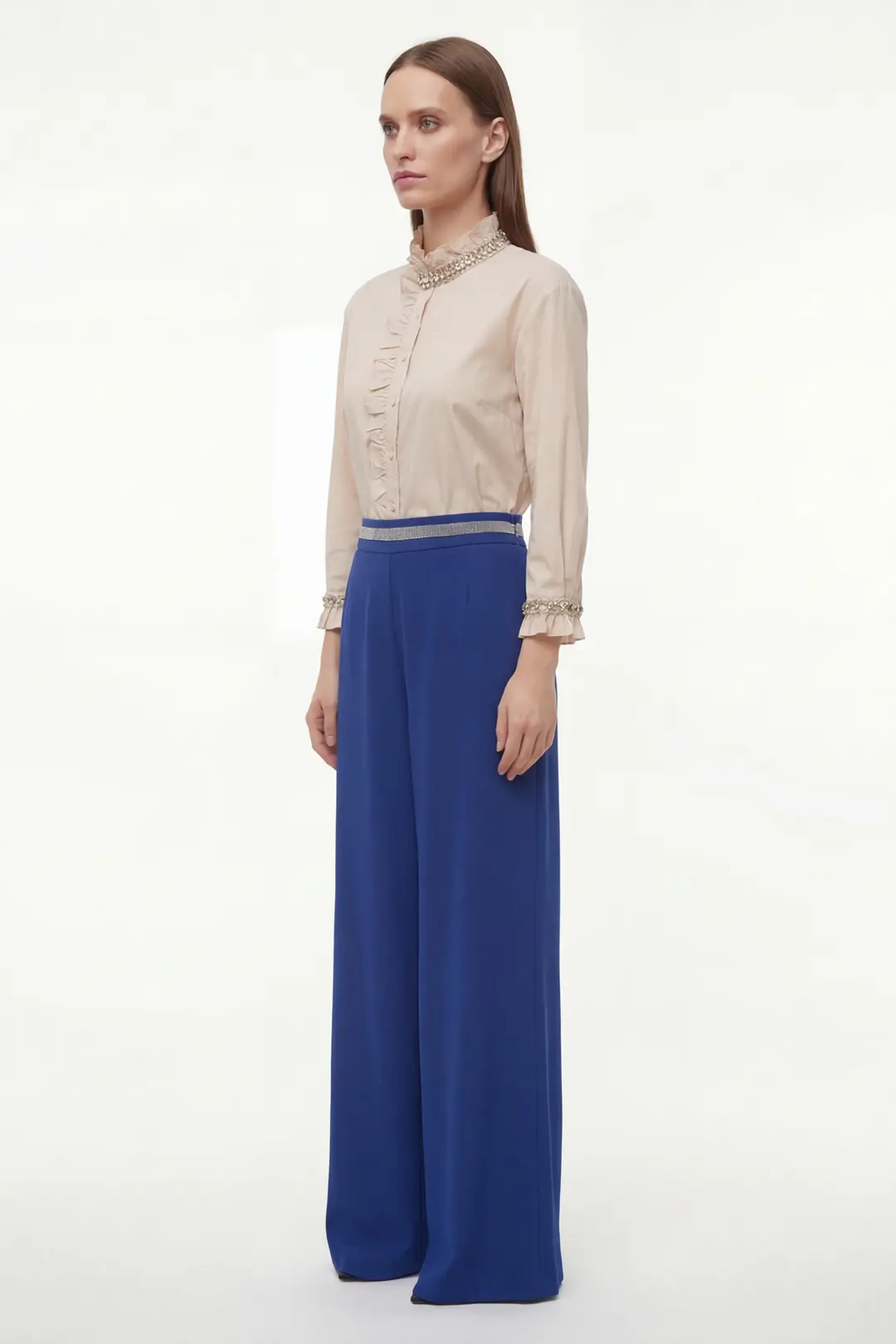 Klasik ve modern şıklığı bir arada sunan bu kombin, palazzo pantolon ve siyah gömlek ile kusursuz bir uyum yakalıyor. Geniş paçalı pantolonun rahat kesimi gün boyu konfor sağlarken, zarif detaylı siyah gömlek kombinasyonu sofistike bir görünüm sunuyor. İş hayatından özel davetlere kadar her ortamda stil sahibi bir duruş elde etmenizi sağlar.