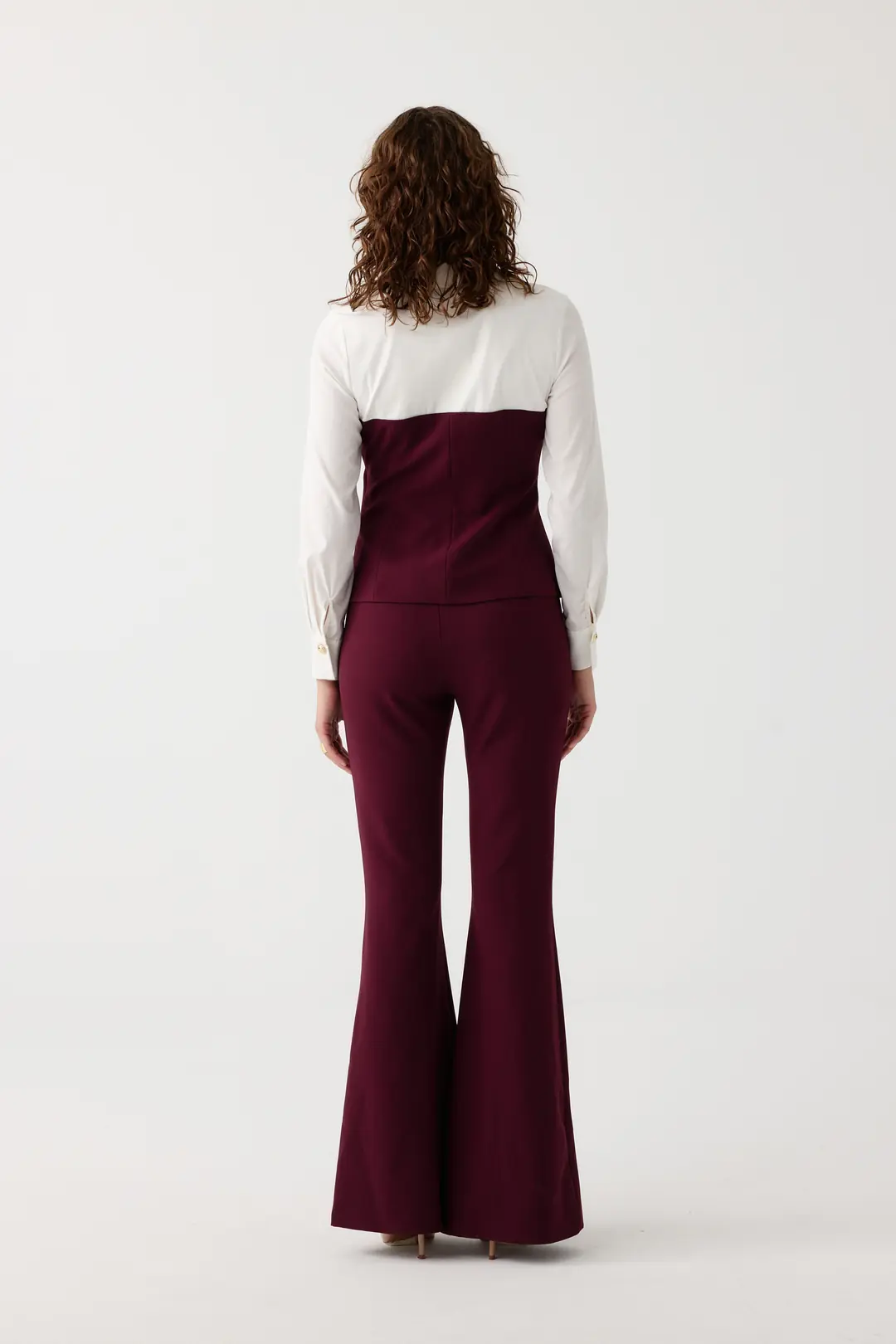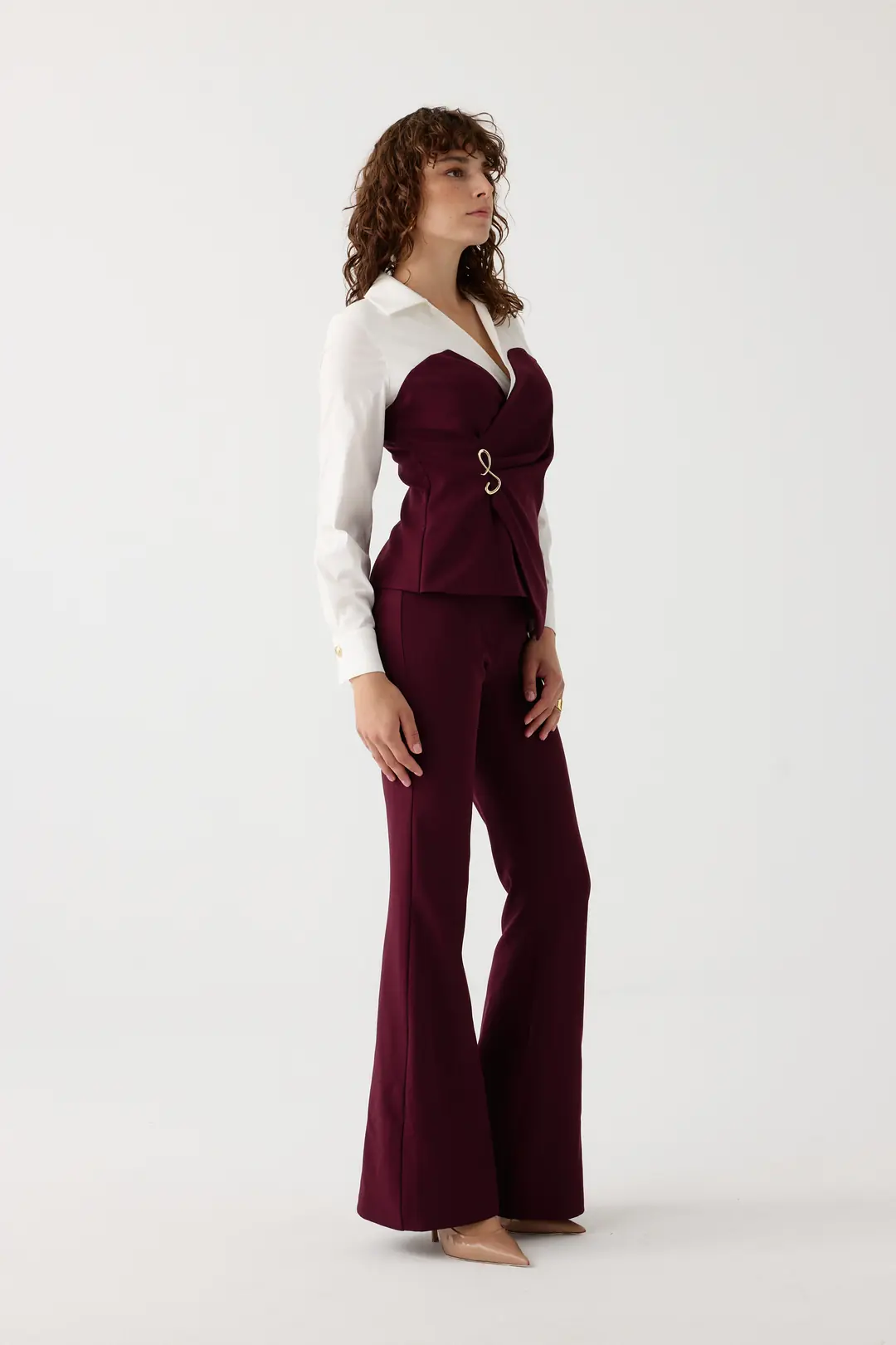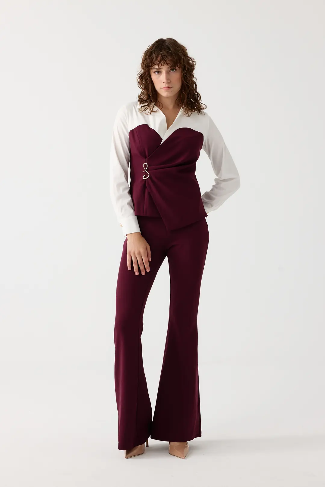 Kontrast renk uyumuyla öne çıkan bluz ve pantolon takımı, hem ofis stilinde hem de günlük kullanımda modern bir şıklık sunar. Zarif kesimi ve sofistike detaylarıyla stilinize güçlü bir dokunuş katar.