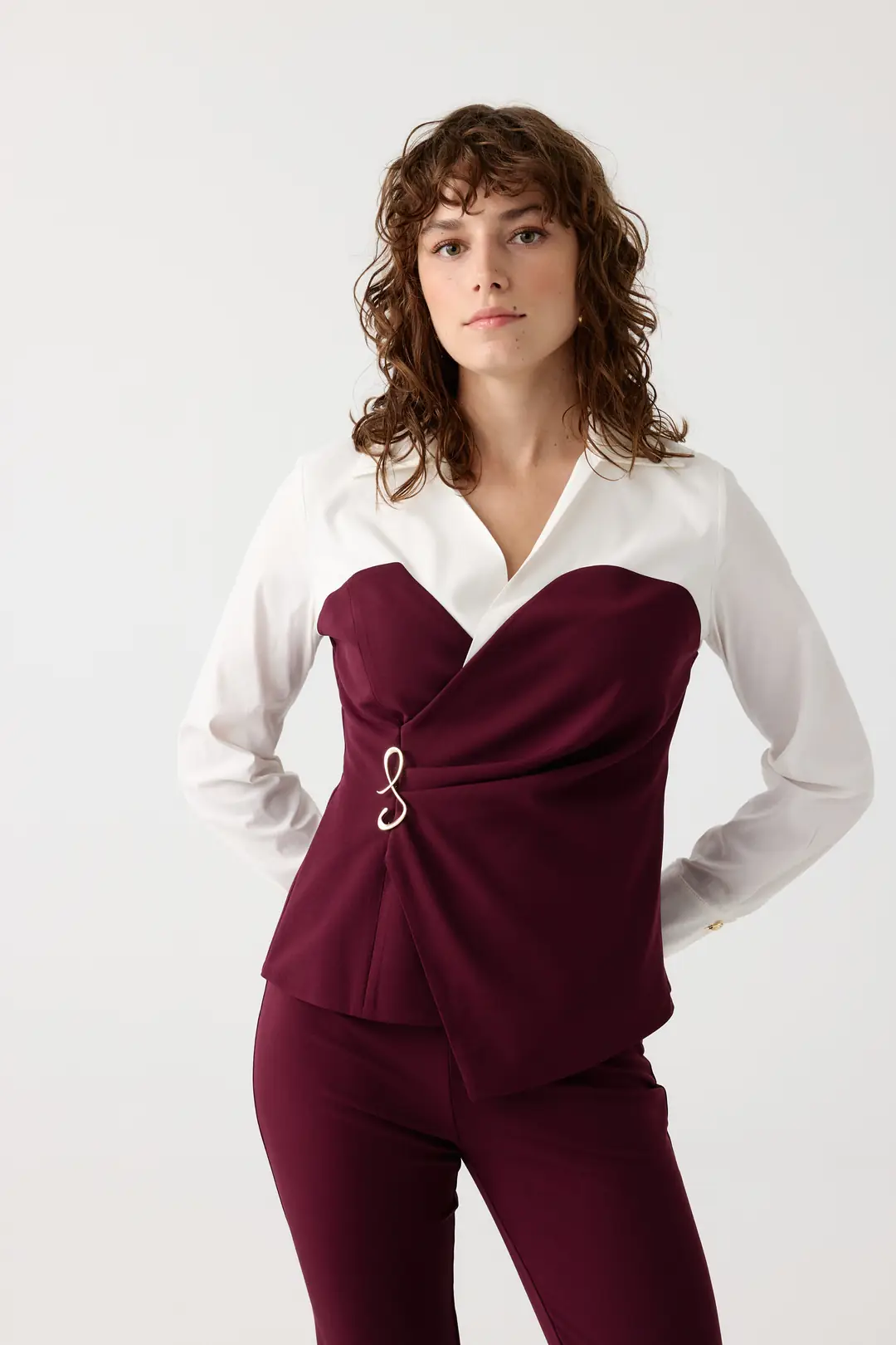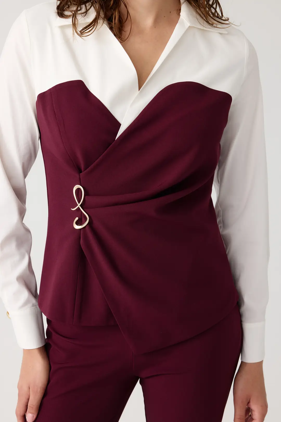 Bluz: Uzun kollu, beyaz gömlek yakalı, siyah drape detaylı