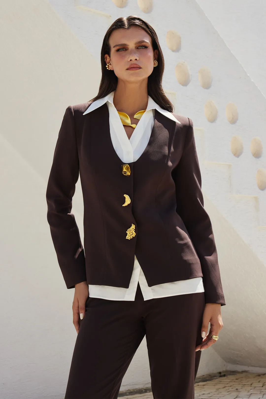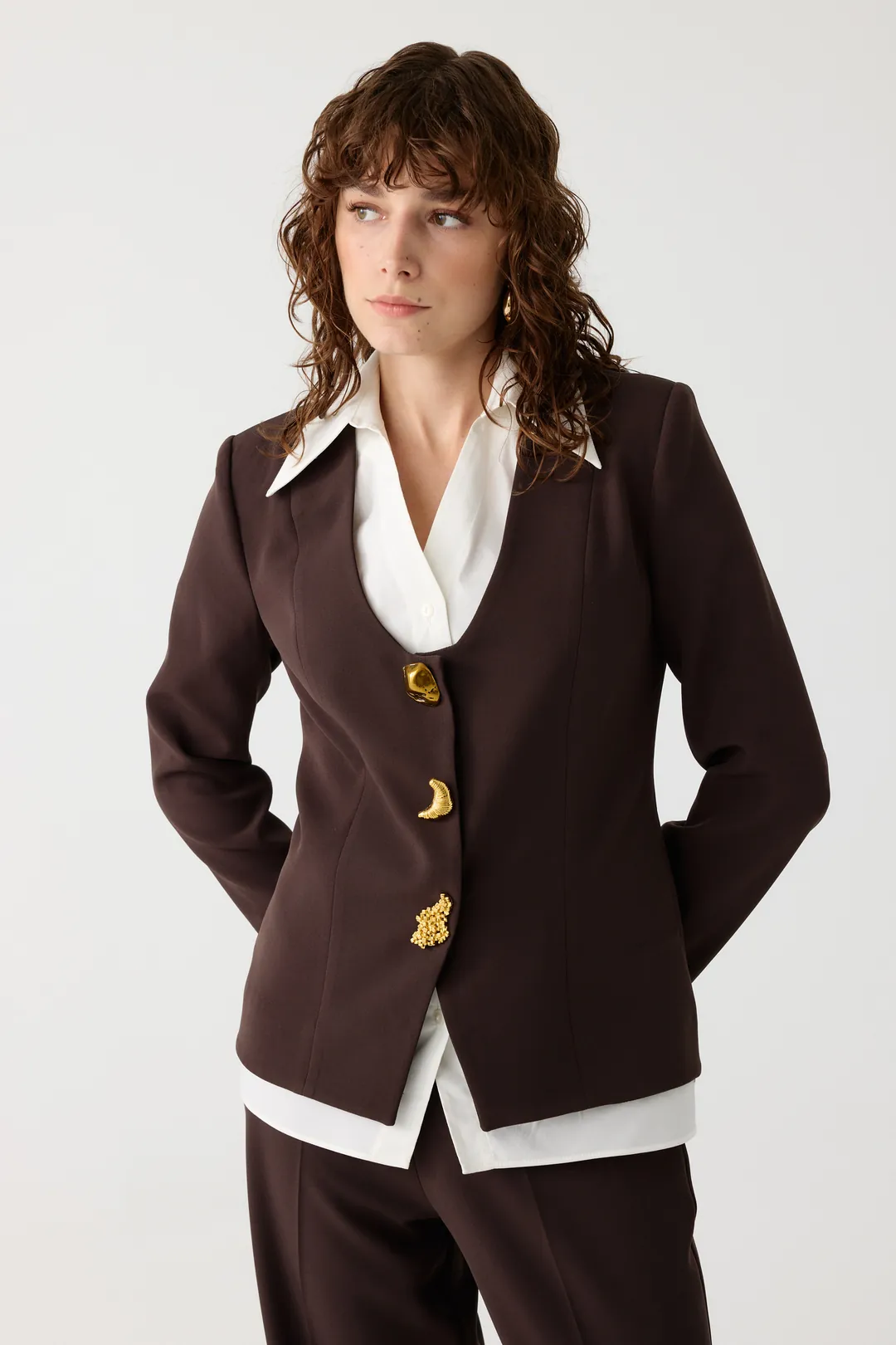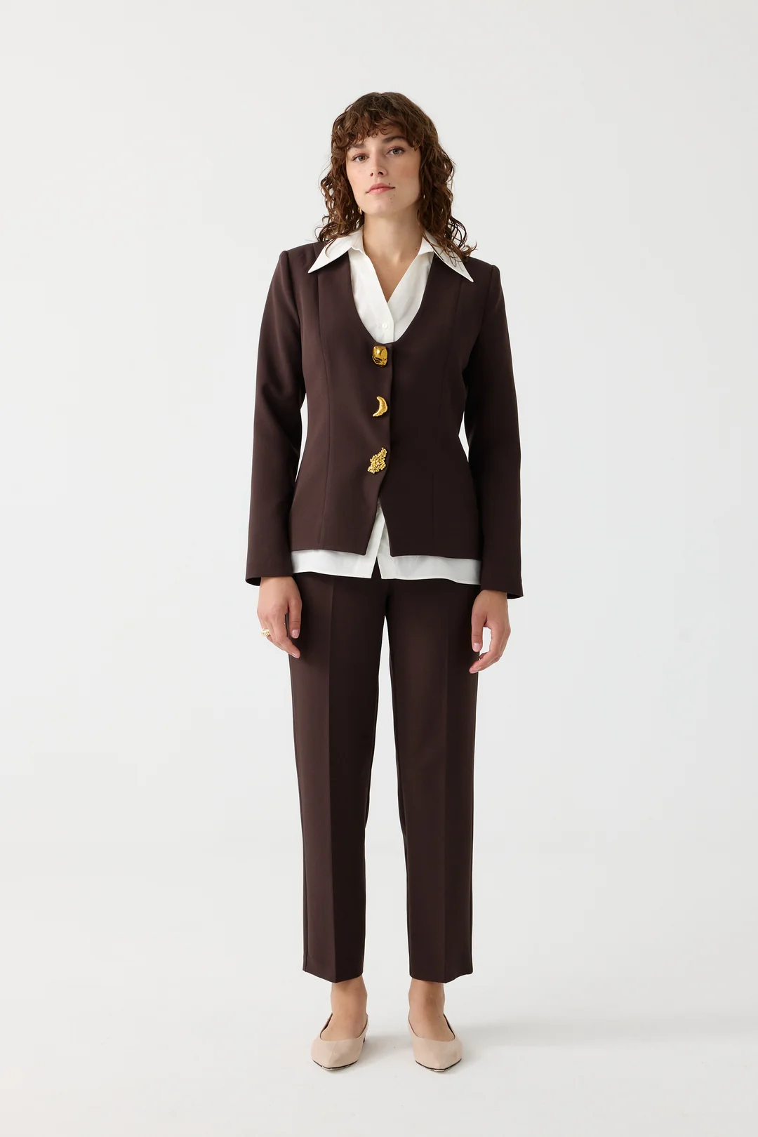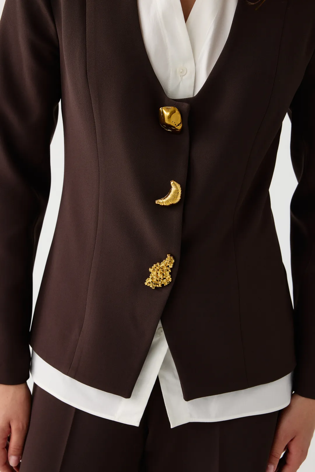 Ön Tasarım: Gold işlemeli düğme detayları (güneş, ay ve yıldız motifleri)