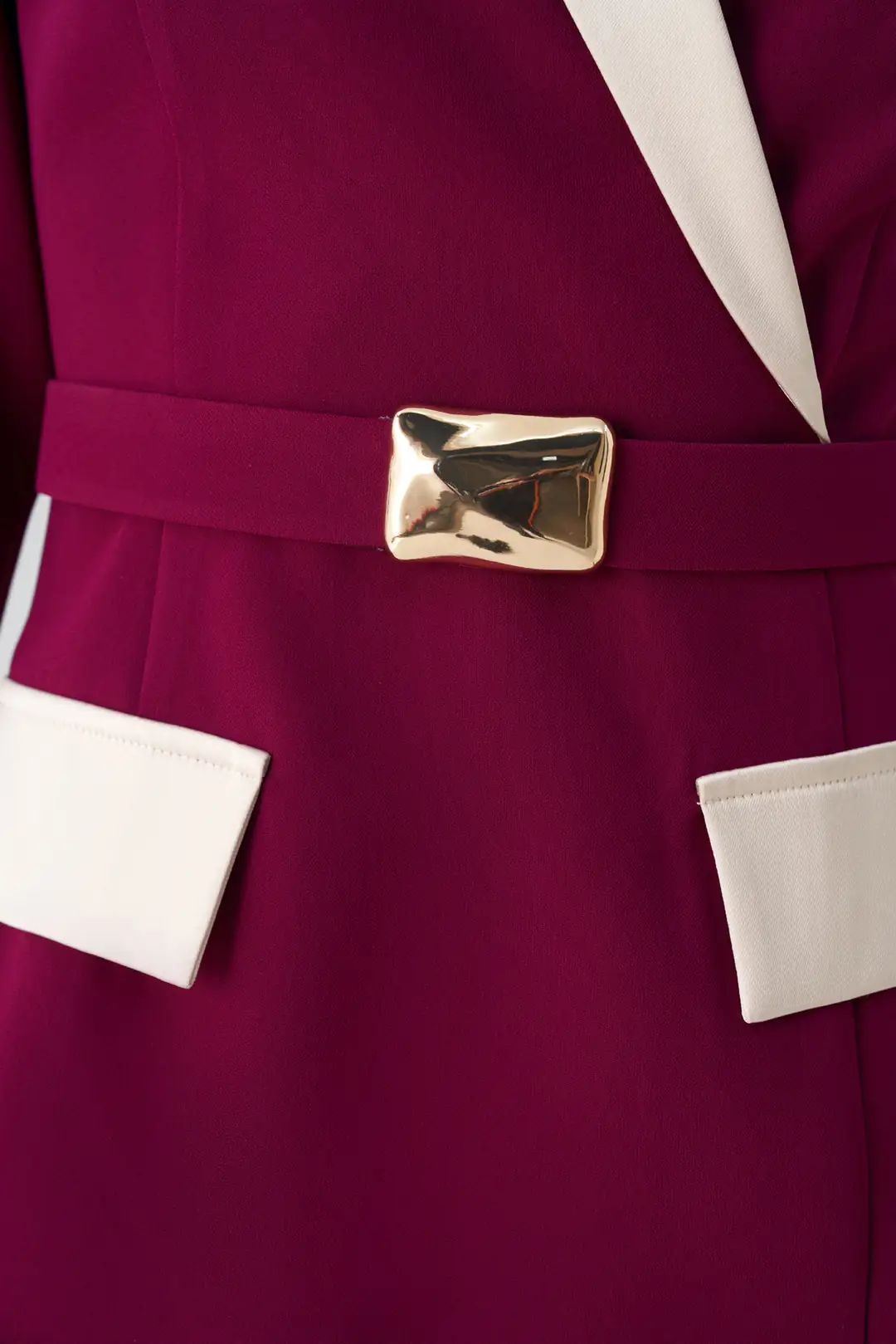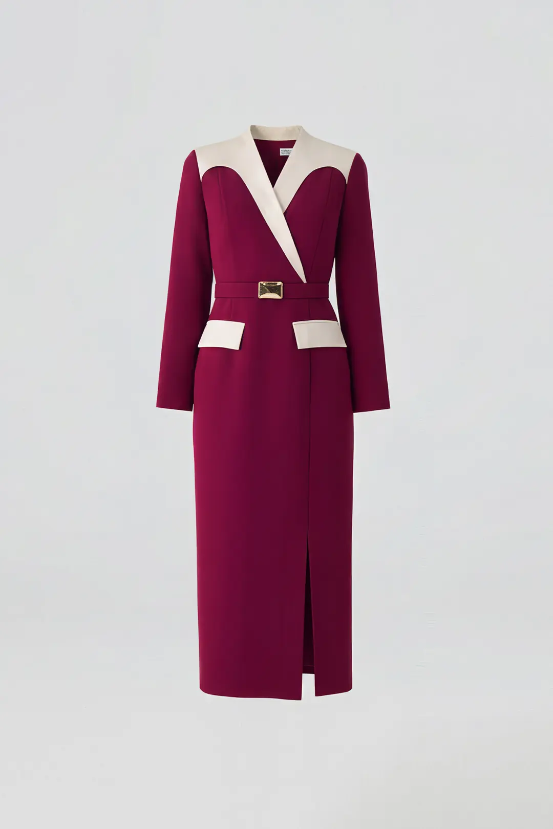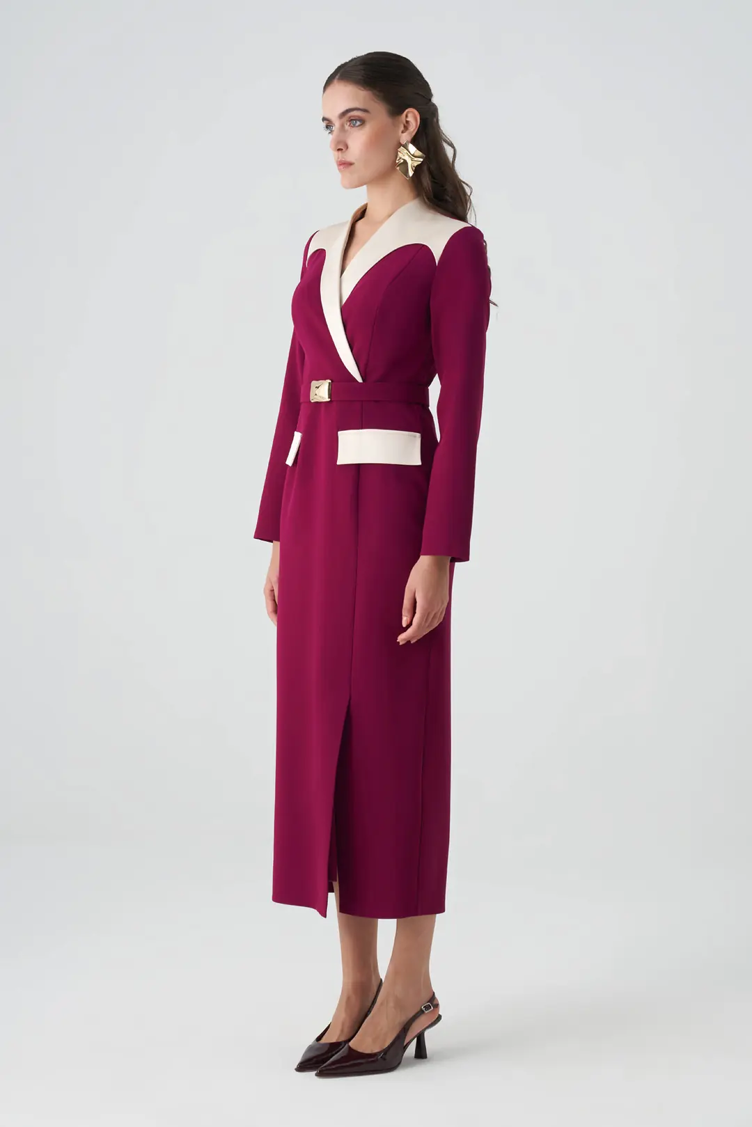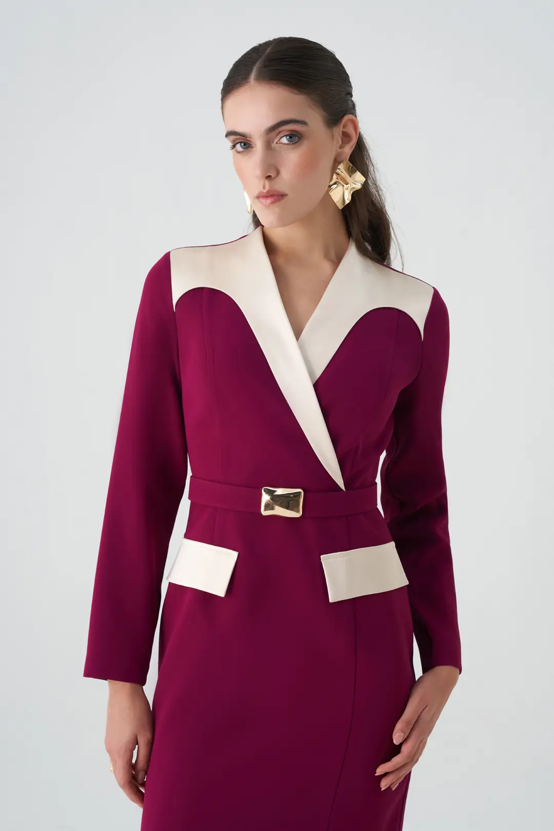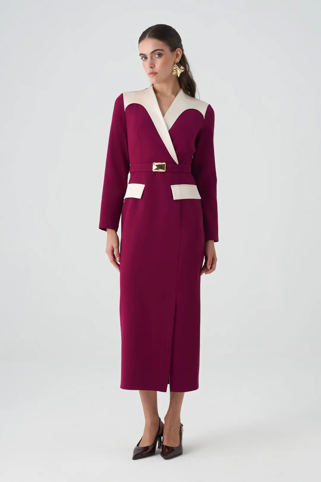 Zamansız zarafeti modern bir çizgiyle buluşturan kontrast yaka ve kuşak detaylı elbise, güçlü ve sofistike bir görünüm sunar.  cep detayları, tasarıma dinamik bir dokunuş katarken, beldeki tokalı kuşak vücut formunu zarifçe vurgular.