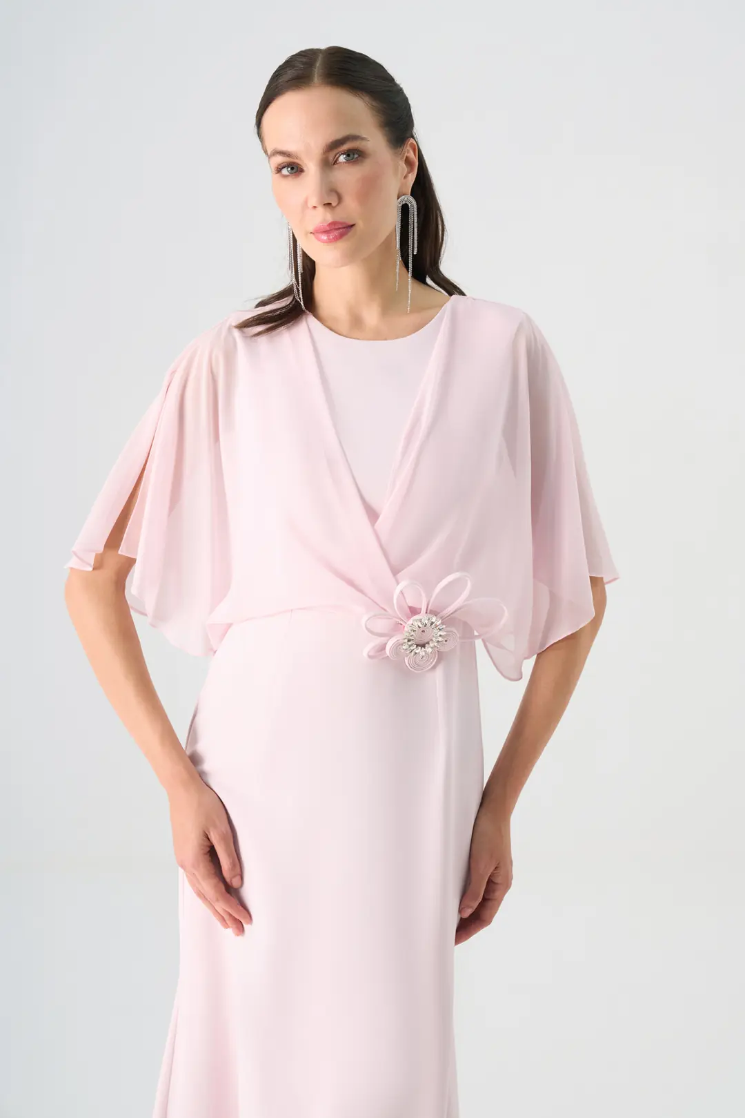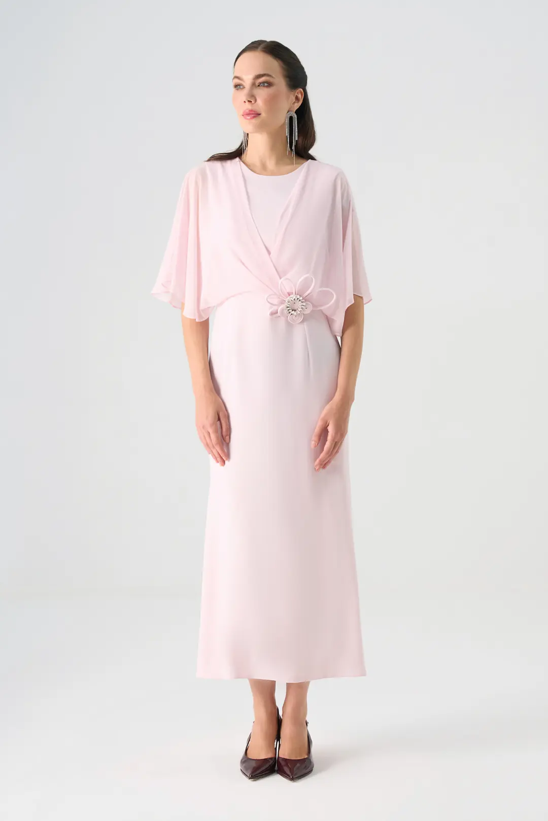 Zarif ve feminen çizgileriyle dikkat çeken bu uzun elbise, sade şıklığın en modern halini yansıtıyor. Şifon katmanlı üst tasarımı, hareket ettikçe akışkan bir görünüm sunarken bele yerleştirilen çiçek formunda taşlı aksesuar elbiseye göz alıcı bir detay kazandırır. Dökümlü kumaş yapısı sayesinde vücuda zarifçe oturur ve konforlu bir kullanım sağlar.