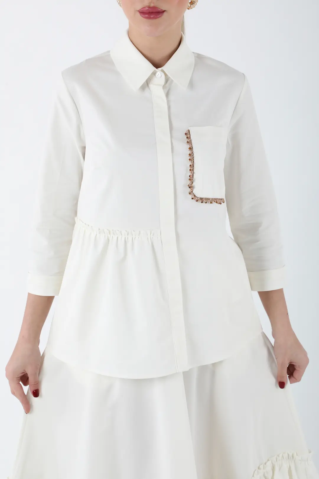 Zarif ve modern çizgileriyle dikkat çeken kadın gömlek, cep kısmındaki dekoratif detay ve beldeki lastik tasarımıyla günlük şıklığı konforla birleştiriyor. Ofis stilinden özel davetlere kadar çok yönlü kullanım imkânı sunar.