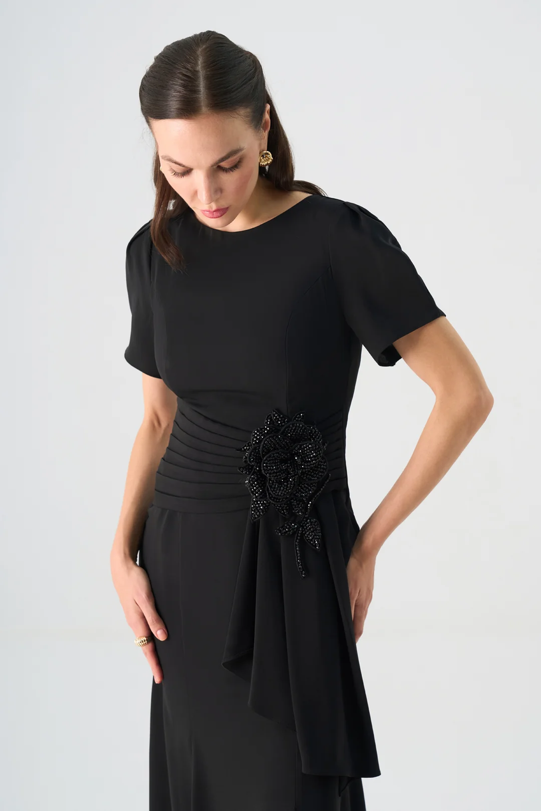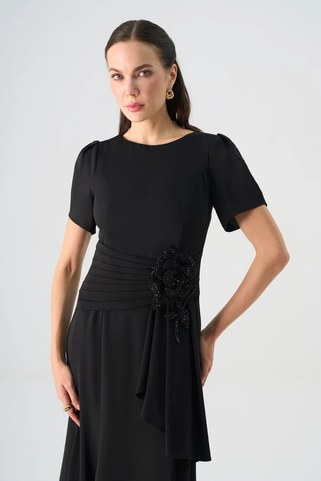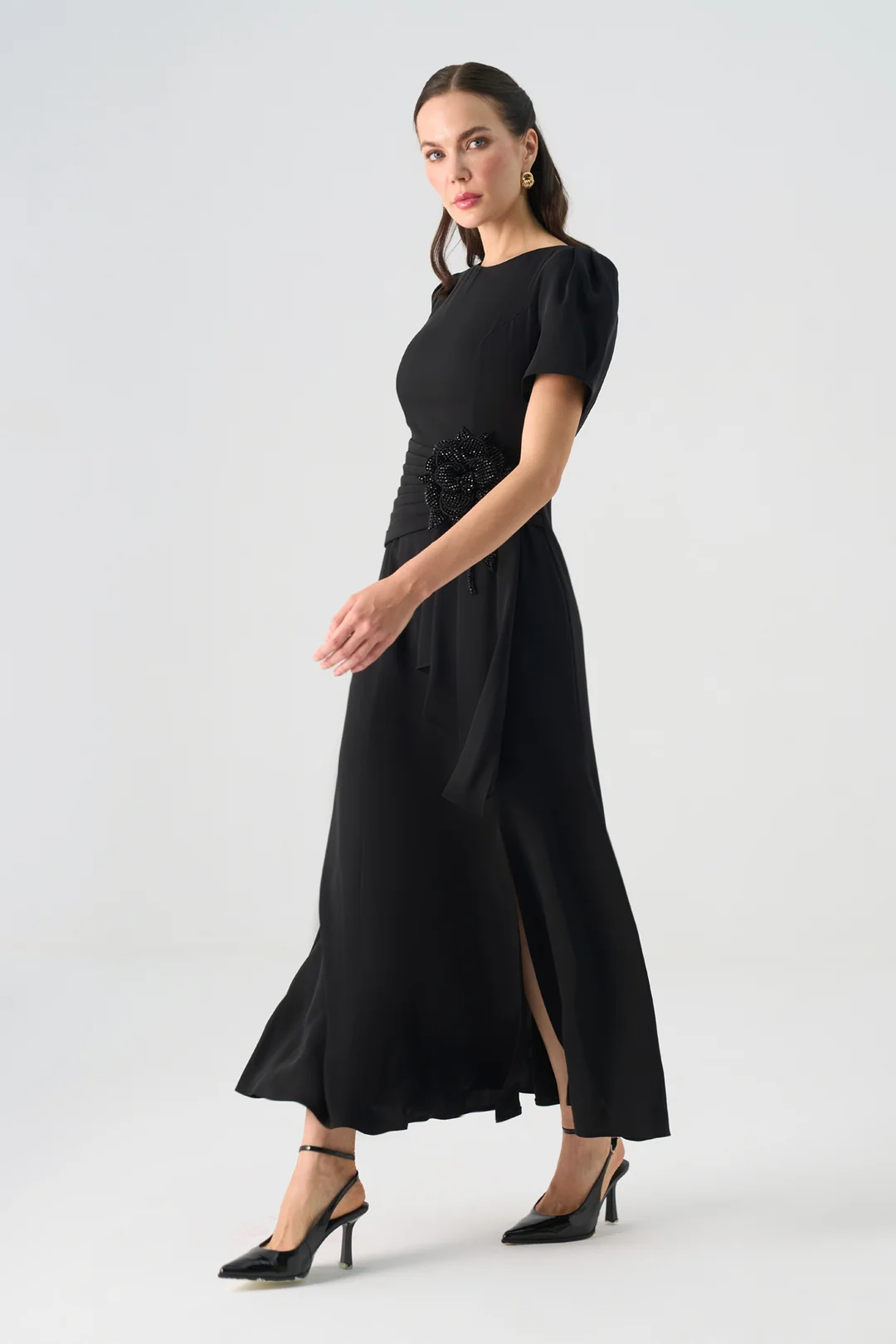 Zarif detaylarıyla dikkat çeken bu uzun abiye elbise, sade çizgileriyle klasik şıklığı modern bir zarafetle buluşturur. Kısa kol formu ve yuvarlak yaka kesimi, tasarıma zarif bir sadelik kazandırırken; bel kısmındaki el işçiliğiyle hazırlanmış çiçek aksesuar süslemesi elbiseye sofistike bir dokunuş katar.