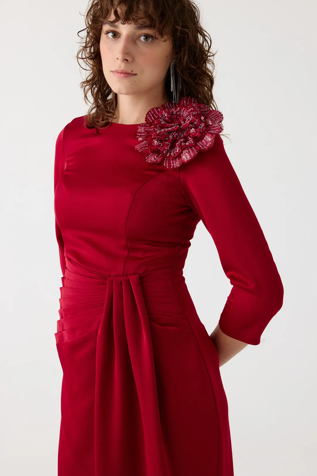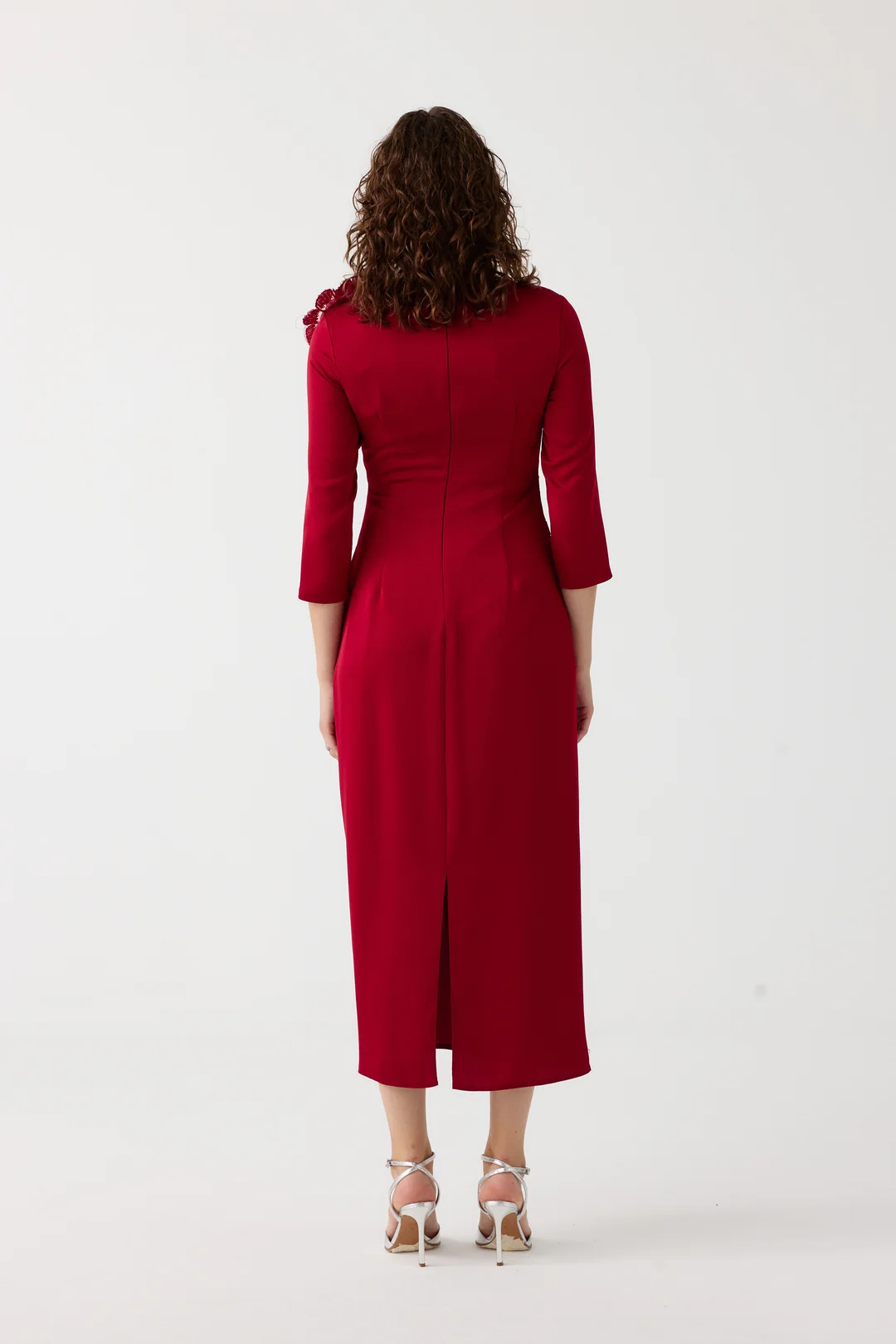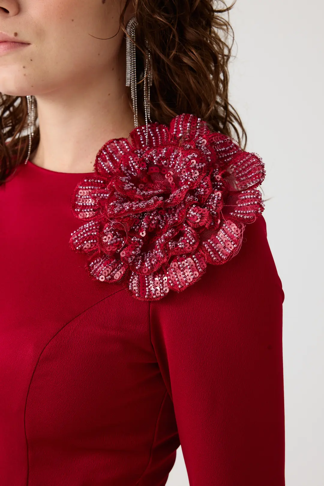 Feminen ve sofistike tarzı bir araya getiren bordo elbise, omuz kısmındaki çiçek aplikeleri ve bel kısmındaki drapeli tasarımıyla göz alıcı bir şıklık sunuyor. Midi boy kesimi ve 3/4 kollarıyla hem özel günlerde hem de davetlerde zarif bir görünüm elde etmenizi sağlar.