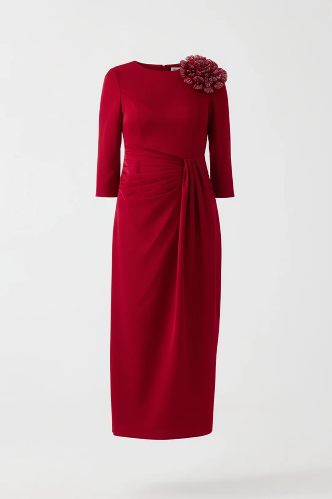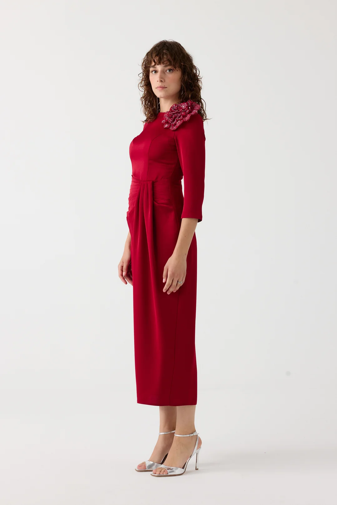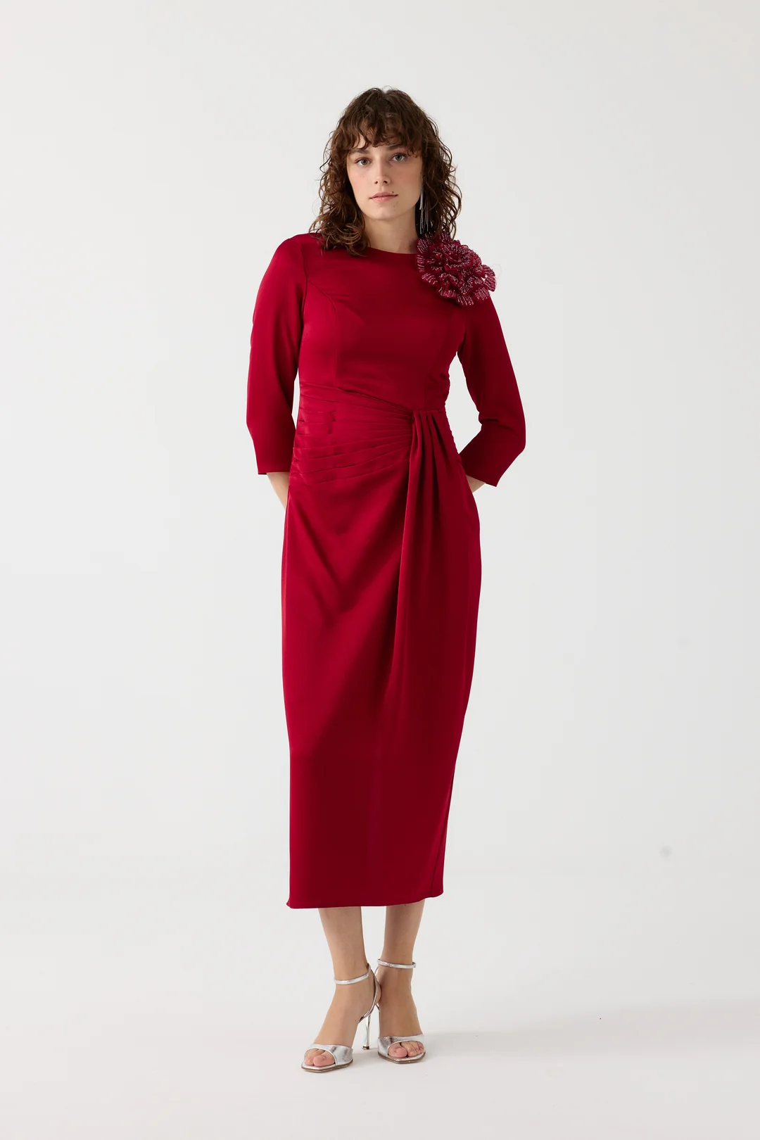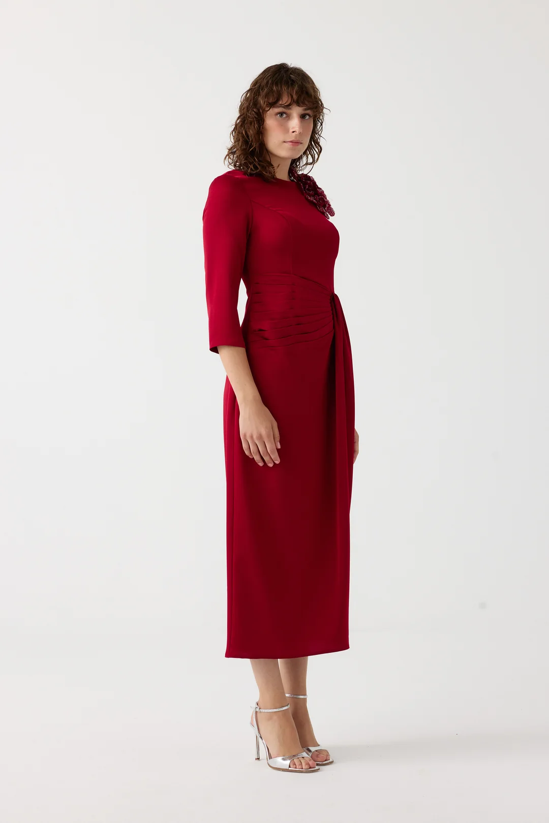 Feminen ve sofistike tarzı bir araya getiren bordo elbise, omuz kısmındaki çiçek aplikeleri ve bel kısmındaki drapeli tasarımıyla göz alıcı bir şıklık sunuyor. Midi boy kesimi ve 3/4 kollarıyla hem özel günlerde hem de davetlerde zarif bir görünüm elde etmenizi sağlar.