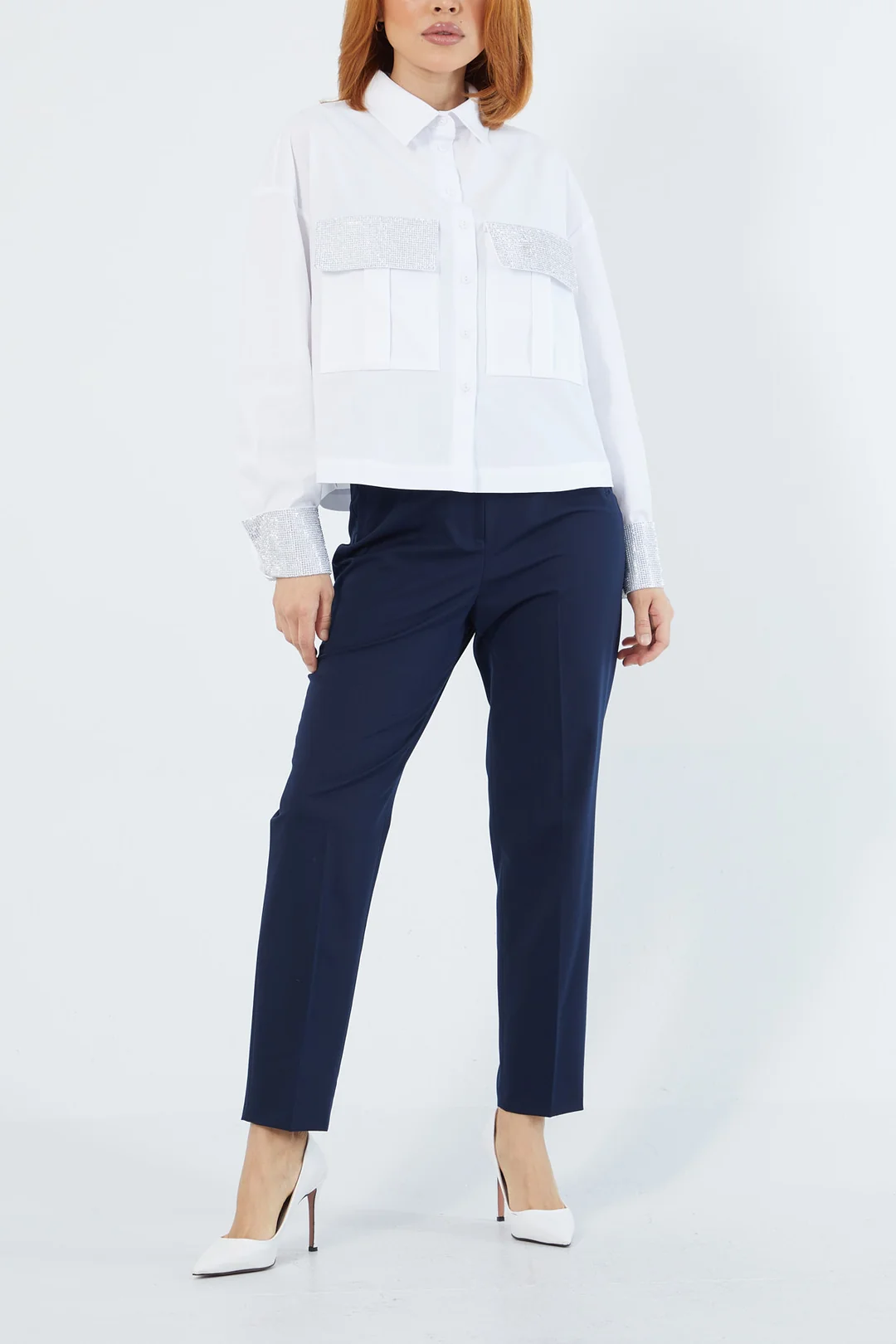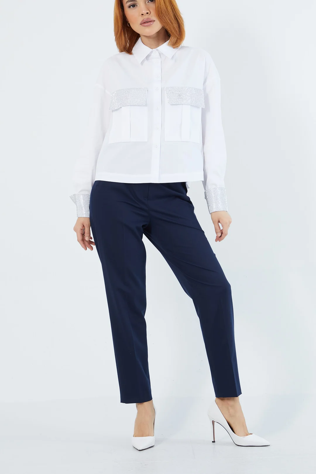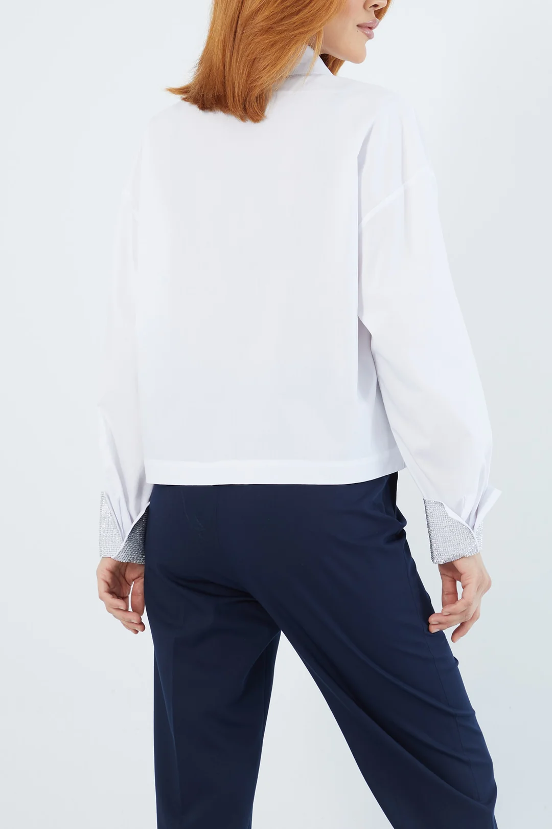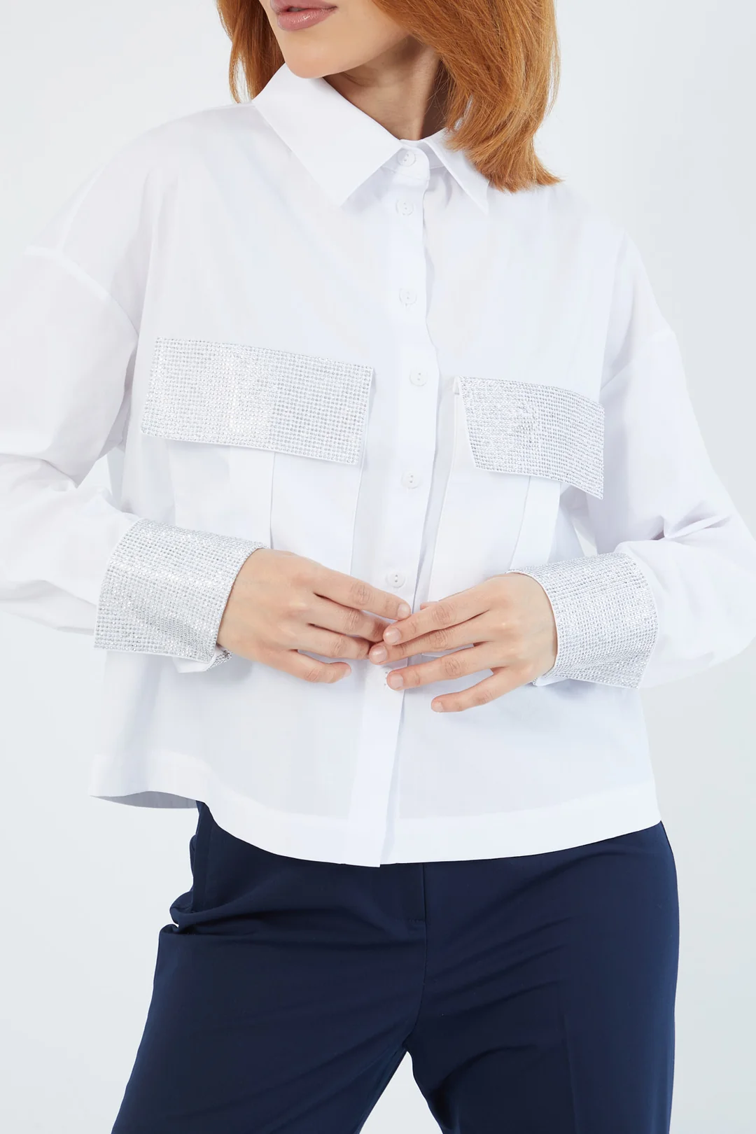 Zarif beyaz gömlek, omuz ve manşetlerdeki parlak taş detaylarıyla modern bir şıklık sunuyor. Klasik kesimiyle ofis kombinlerinden günlük şıklığa kadar her alanda kullanılabilen bu gömlek, sofistike tarzı tamamlayan zamansız bir parçadır.