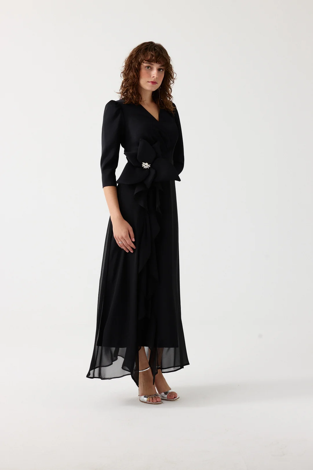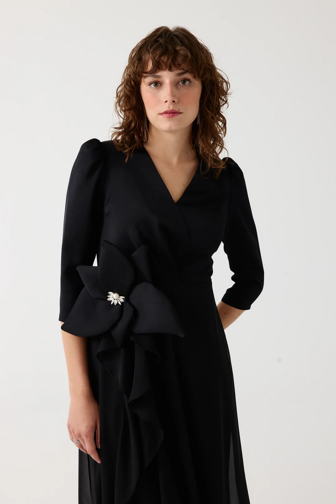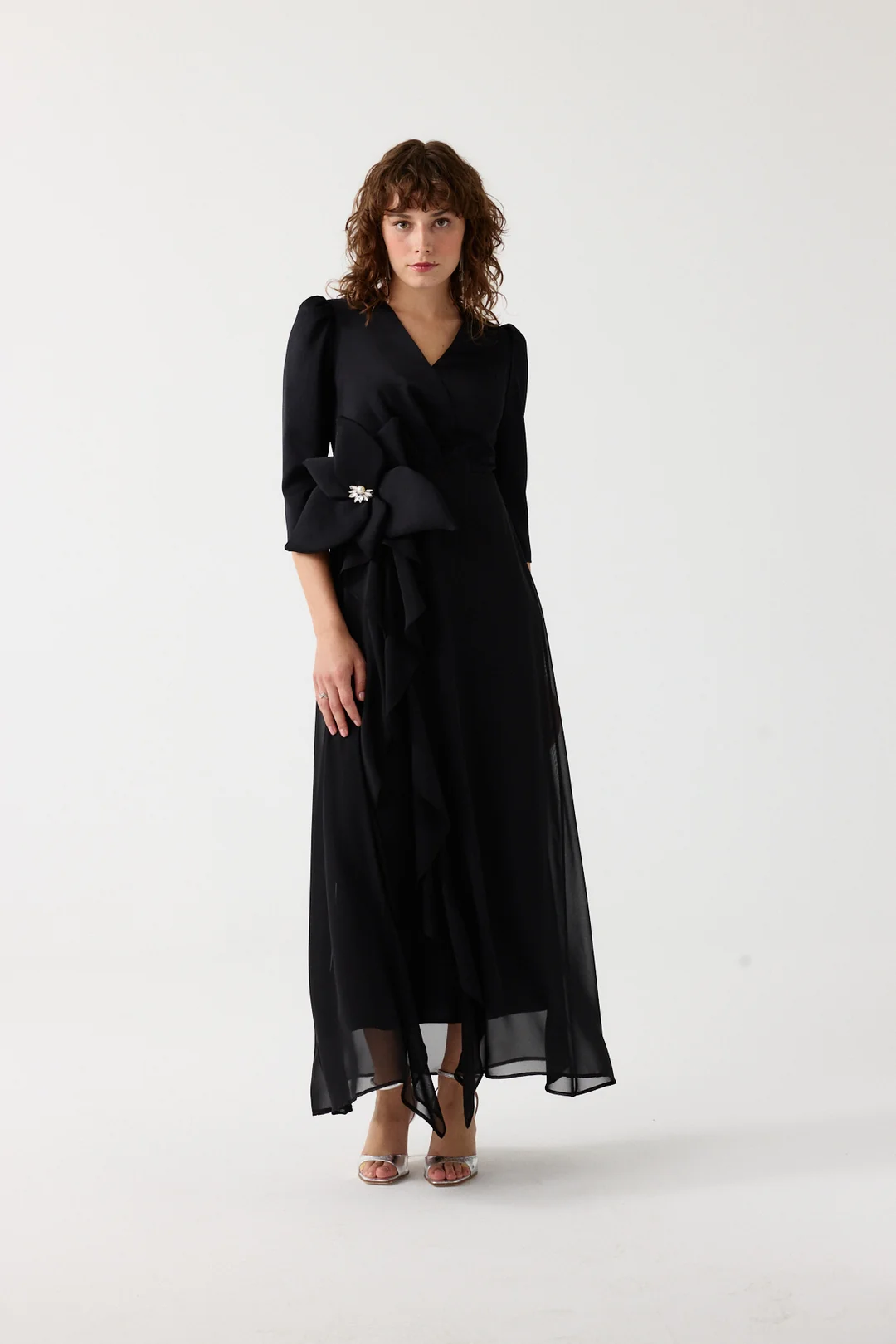 Feminen ve zarif tasarımıyla dikkat çeken açık mavi şifon elbise, bel kısmındaki büyük çiçek detayı ve kat kat volanlı eteğiyle romantik bir görünüm sunuyor. Hafif ve akıcı kumaşı sayesinde özel davetlerde, düğünlerde ve nişan organizasyonlarında şıklığı ön plana çıkarır.