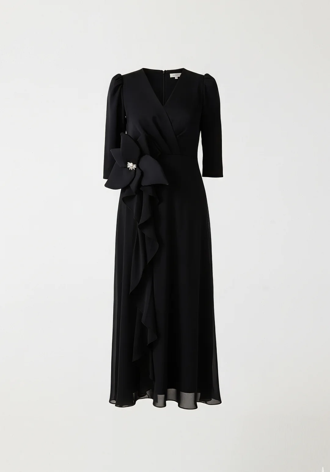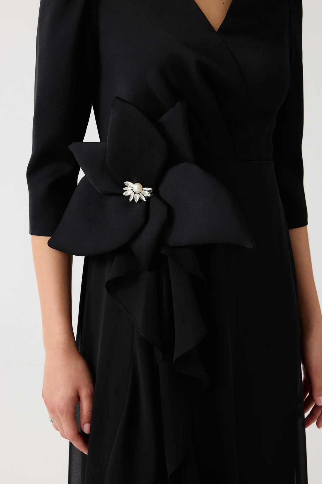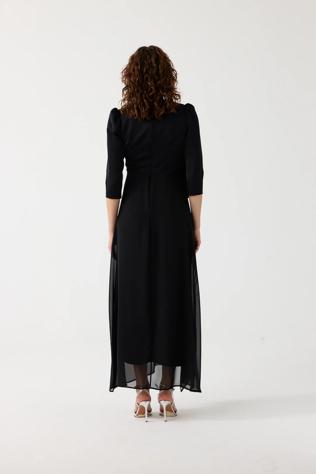 Feminen ve zarif tasarımıyla dikkat çeken açık mavi şifon elbise, bel kısmındaki büyük çiçek detayı ve kat kat volanlı eteğiyle romantik bir görünüm sunuyor. Hafif ve akıcı kumaşı sayesinde özel davetlerde, düğünlerde ve nişan organizasyonlarında şıklığı ön plana çıkarır.