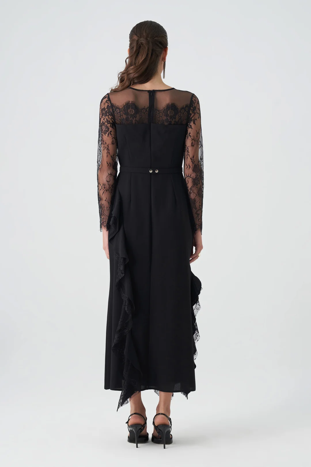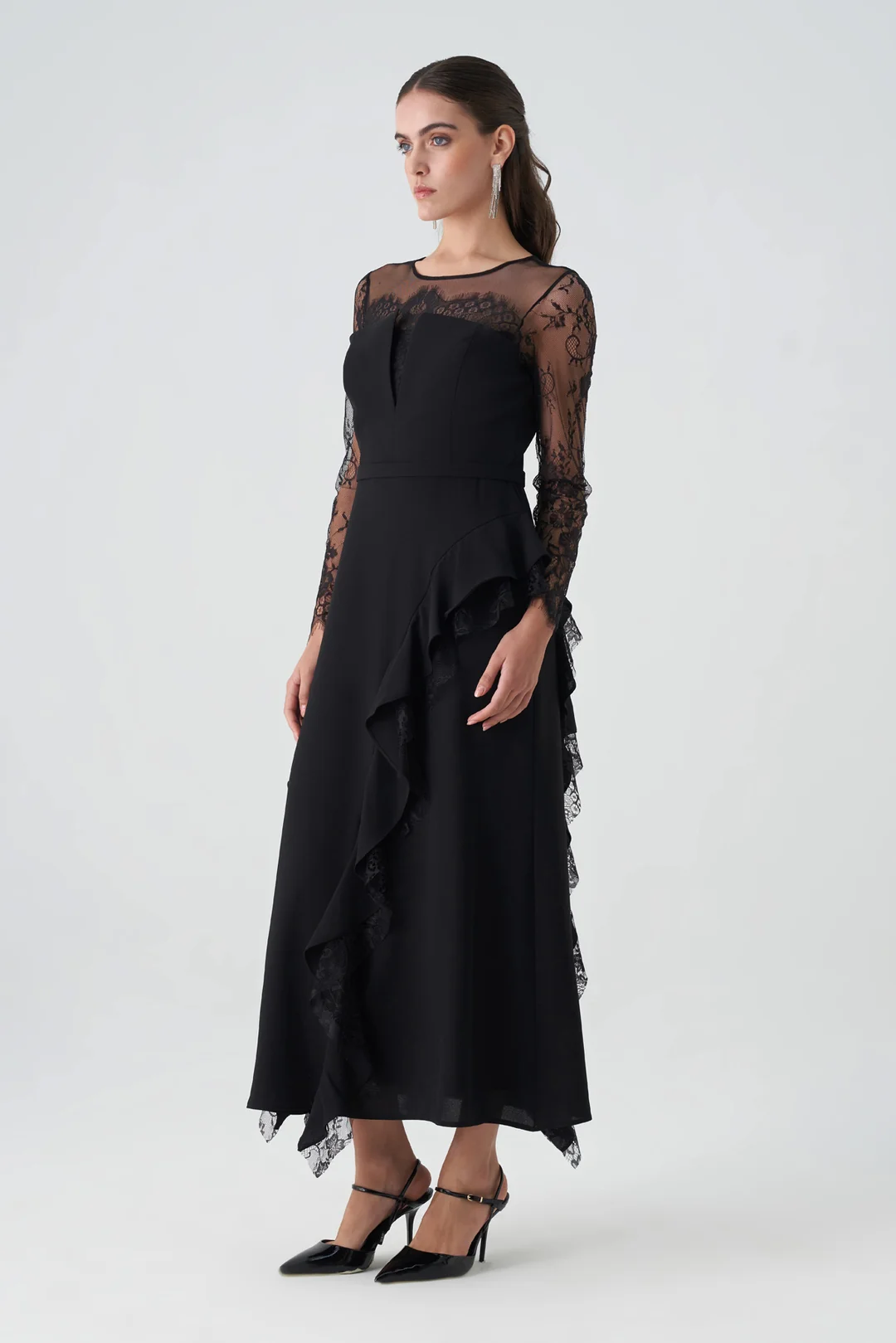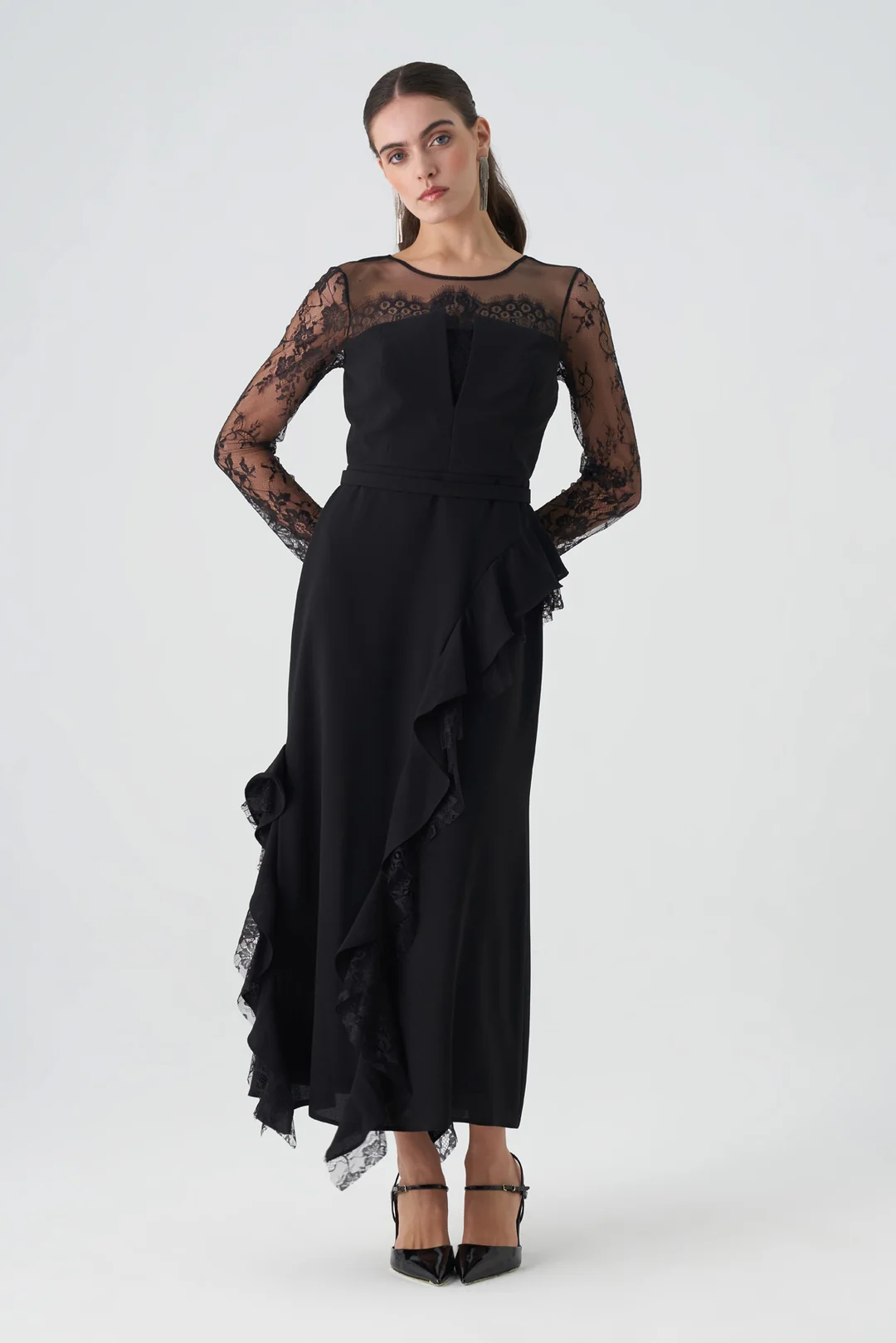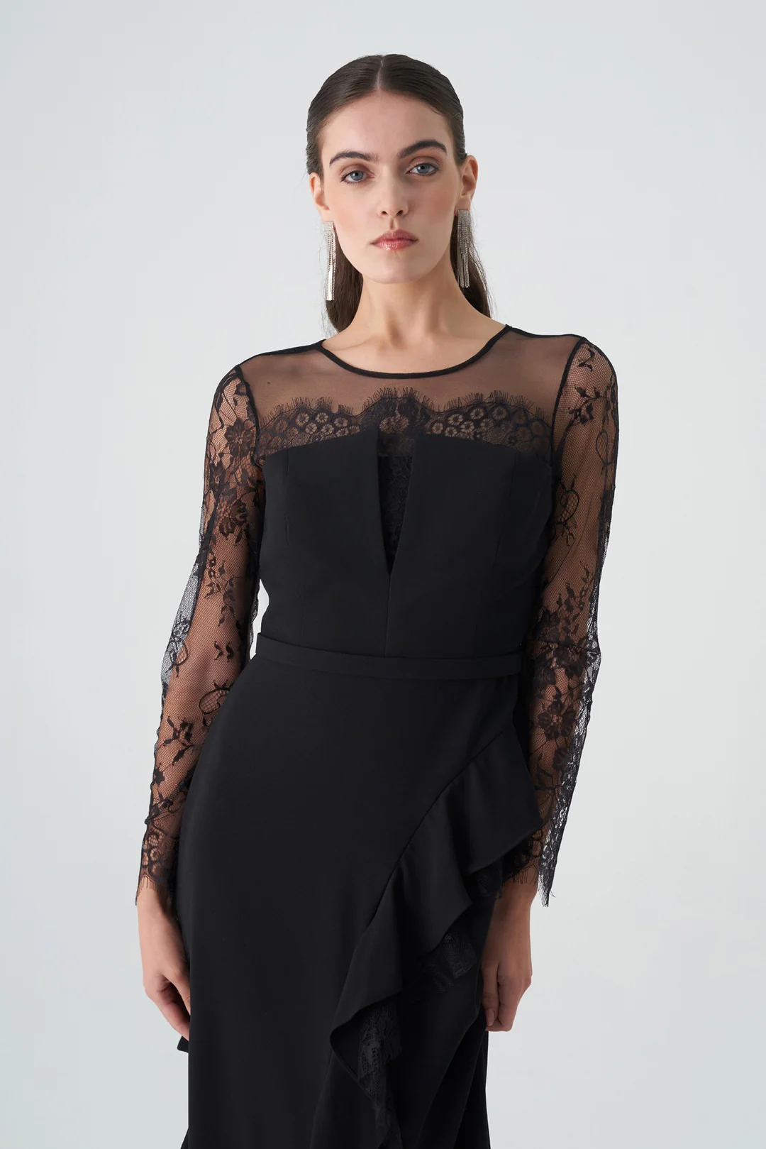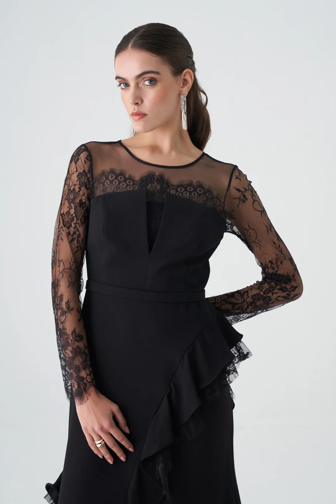 Zarif ve feminen tasarımıyla dikkat çeken siyah abiye elbise, dantel detaylı uzun kolları ve transparan üst gövde kısmıyla sofistike bir görünüm sunar. Özel davetler, kokteyller ve şık gece organizasyonları için ideal olan bu elbise, asimetrik fırfır detayıyla modern bir dokunuş kazanır. V yaka transparan üst kısmı, dantelin zarafetini vurgularken, bel hattı figürü ön plana çıkarır. Siyahın asaletiyle buluşan bu elbise, hem şıklığı hem de konforu bir arada arayan kadınlar için mükemmel bir seçimdir.