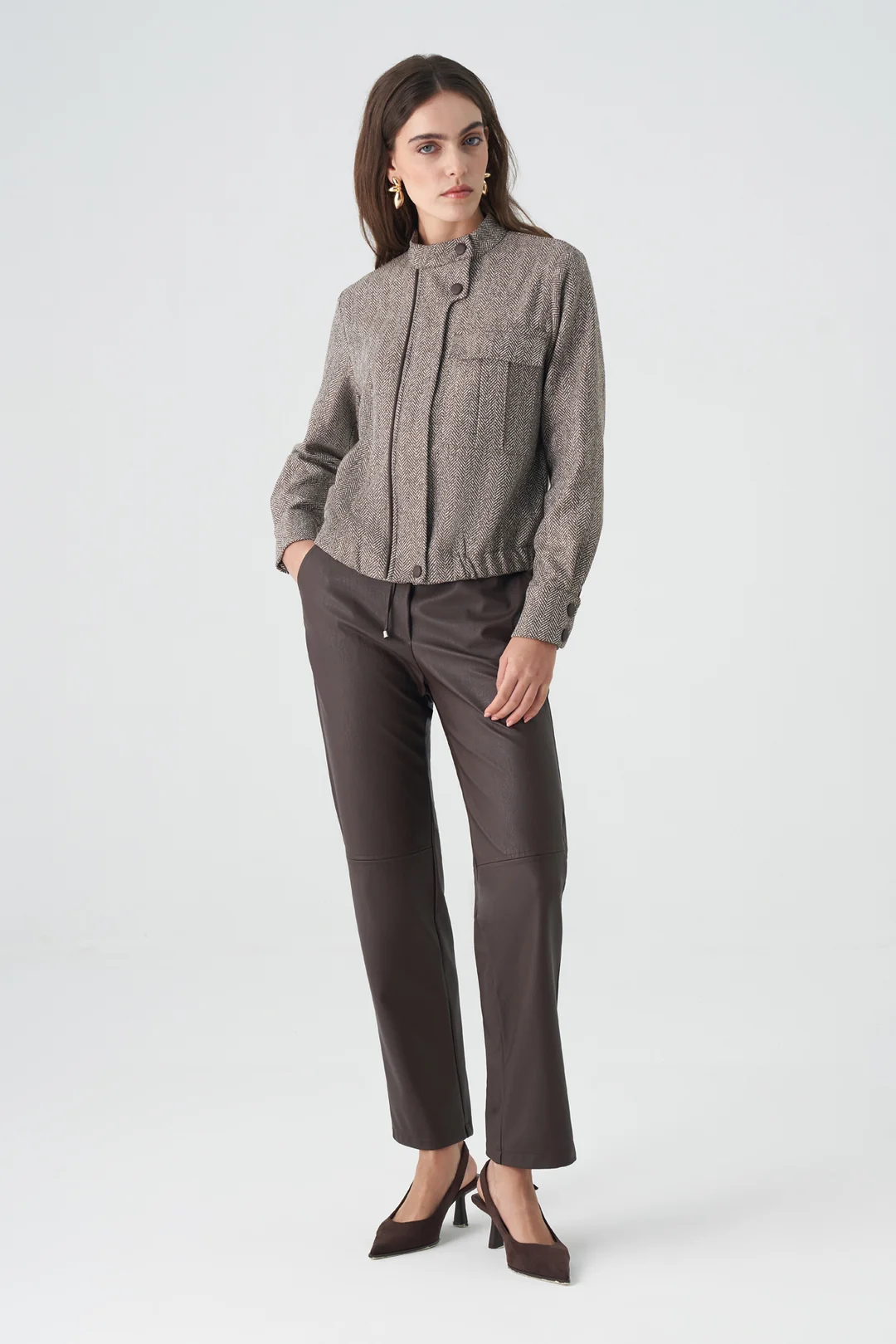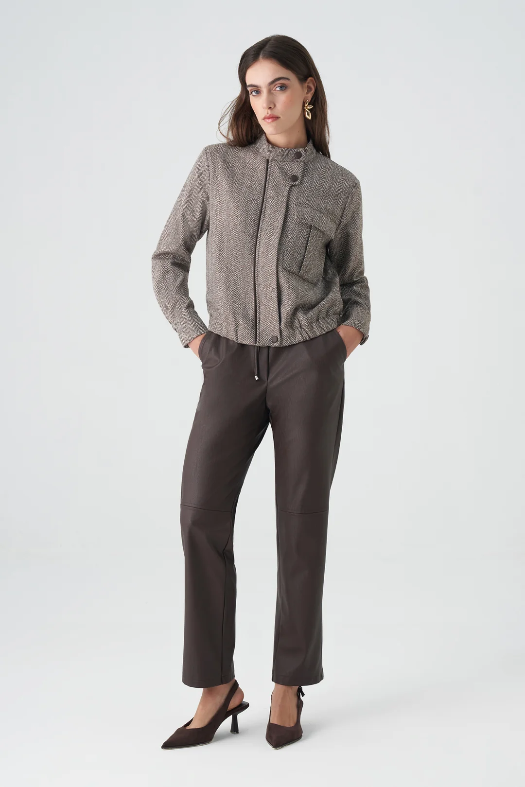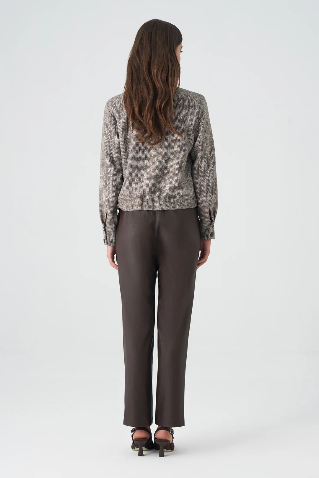 Modern ve sofistike görünümüyle öne çıkan deri görünümlü pantolon, sezonun en trend parçalarından biridir. Yumuşak dokulu yüzeyi ve rahat kalıbı ile konforu zarafetle buluşturur. Düz paça formu ve bel kısmındaki bağlama detayı, hem gündüz hem de akşam kombinlerinde zamansız bir şıklık sunar. Gömlek, blazer ceket veya kazaklarla kolayca kombinlenebilen bu pantolon, minimal ama etkileyici bir stilin anahtar parçasıdır.