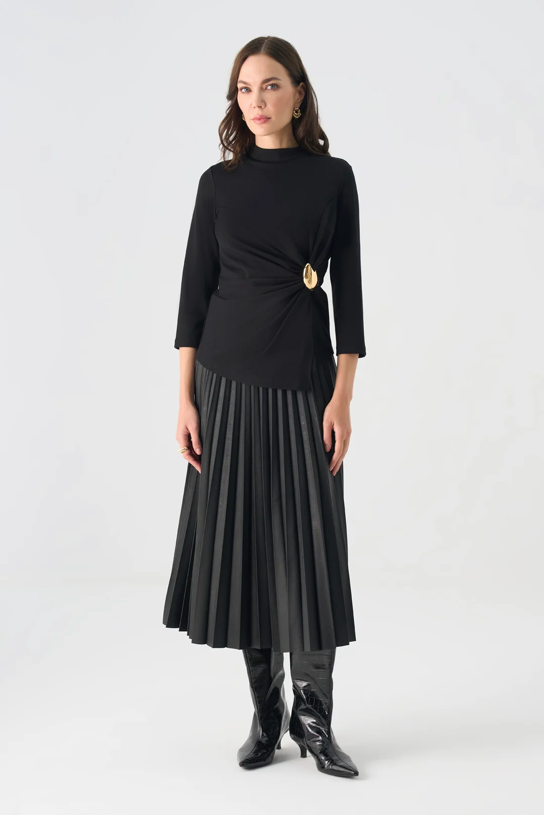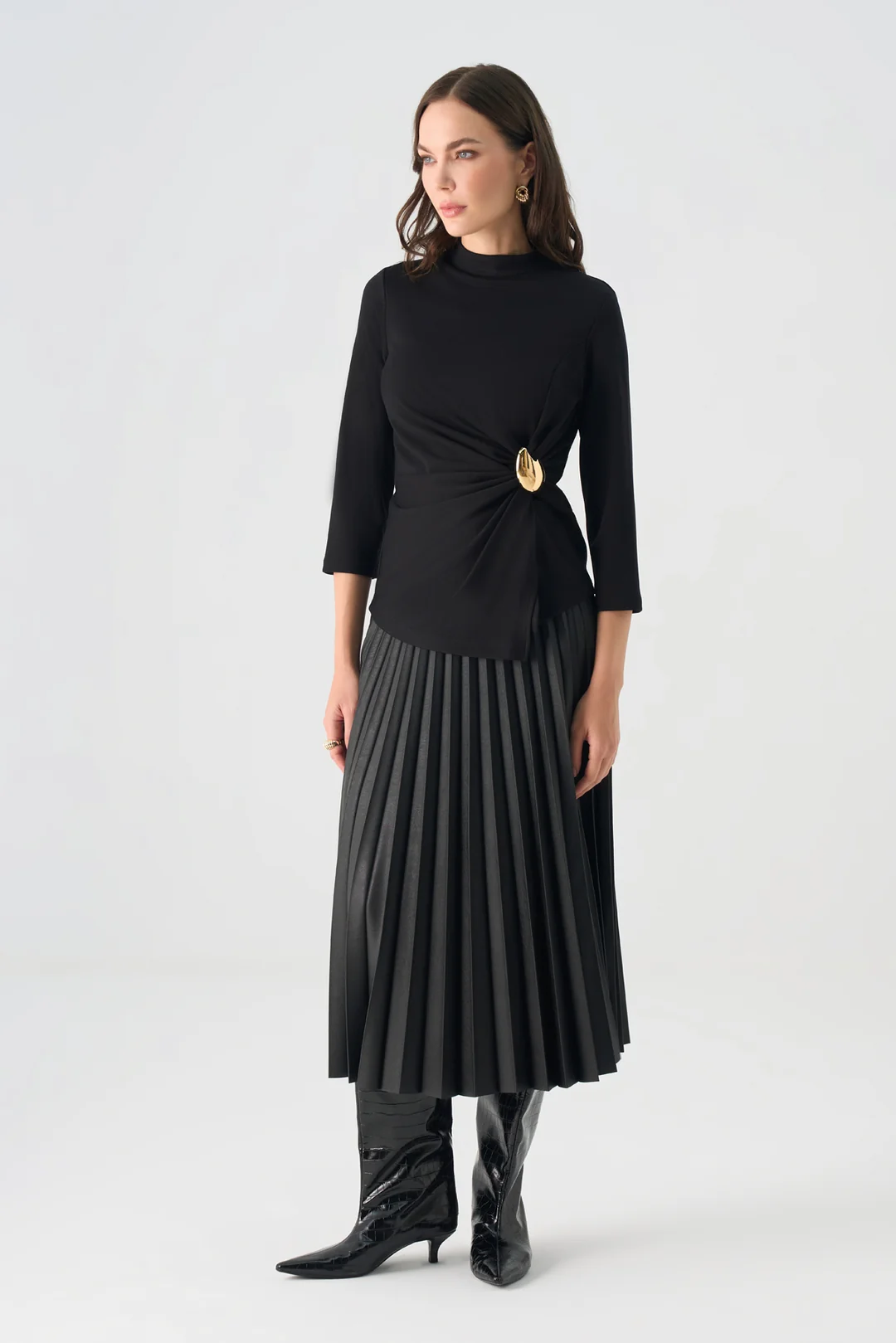 Modern zarafeti sade bir çizgide buluşturan bu takım, dökümlü formu ve zarif metal toka detayıyla şıklığı ön plana çıkarıyor. Üst kısmındaki hafif drape geçişler, bedeni nazikçe saran yapısıyla feminen bir siluet oluştururken, pliseli etek alt bölümü sofistike bir hareket kazandırır. Ofis, özel davet veya şehir şıklığı için ideal bir tercihtir. Konforlu kumaş yapısı sayesinde gün boyu rahatlık sunar.